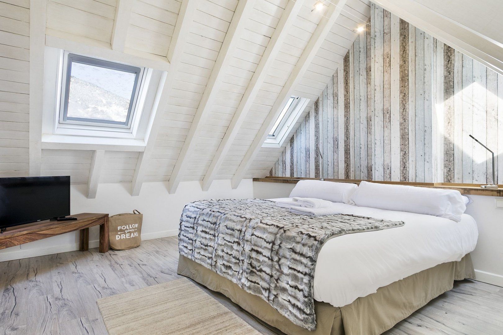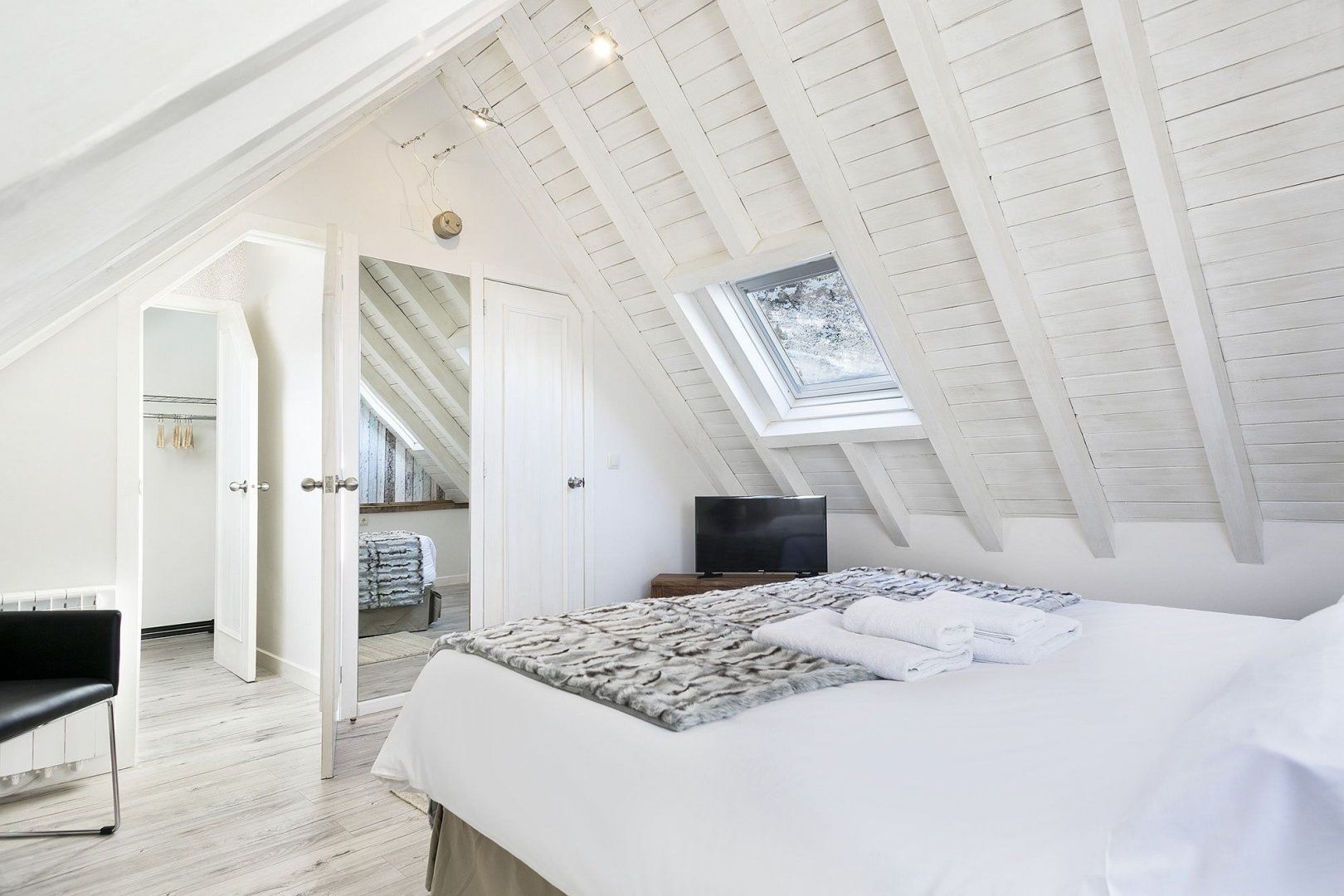 Renovated in 2016, this original mountain abode still shows signs of old-world Catalonia. We love the lofty sloped ceiling in the living space, with its solid wooden beams. But then freshness comes through from a modern, white colour scheme and understated furniture. While this is the perfect place to kick off your walking boots and sip rich red wine, you might find it hard to tear yourself away from the window views.