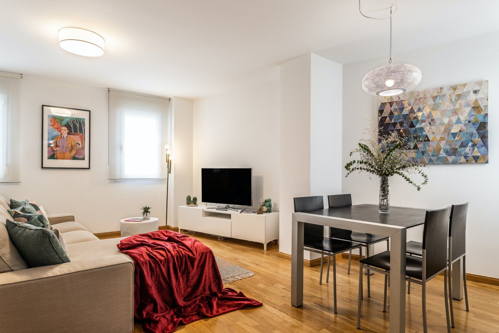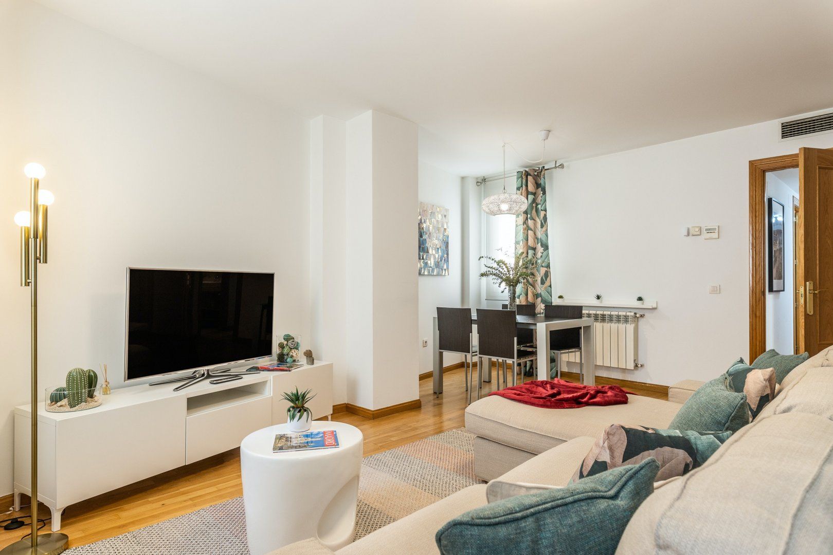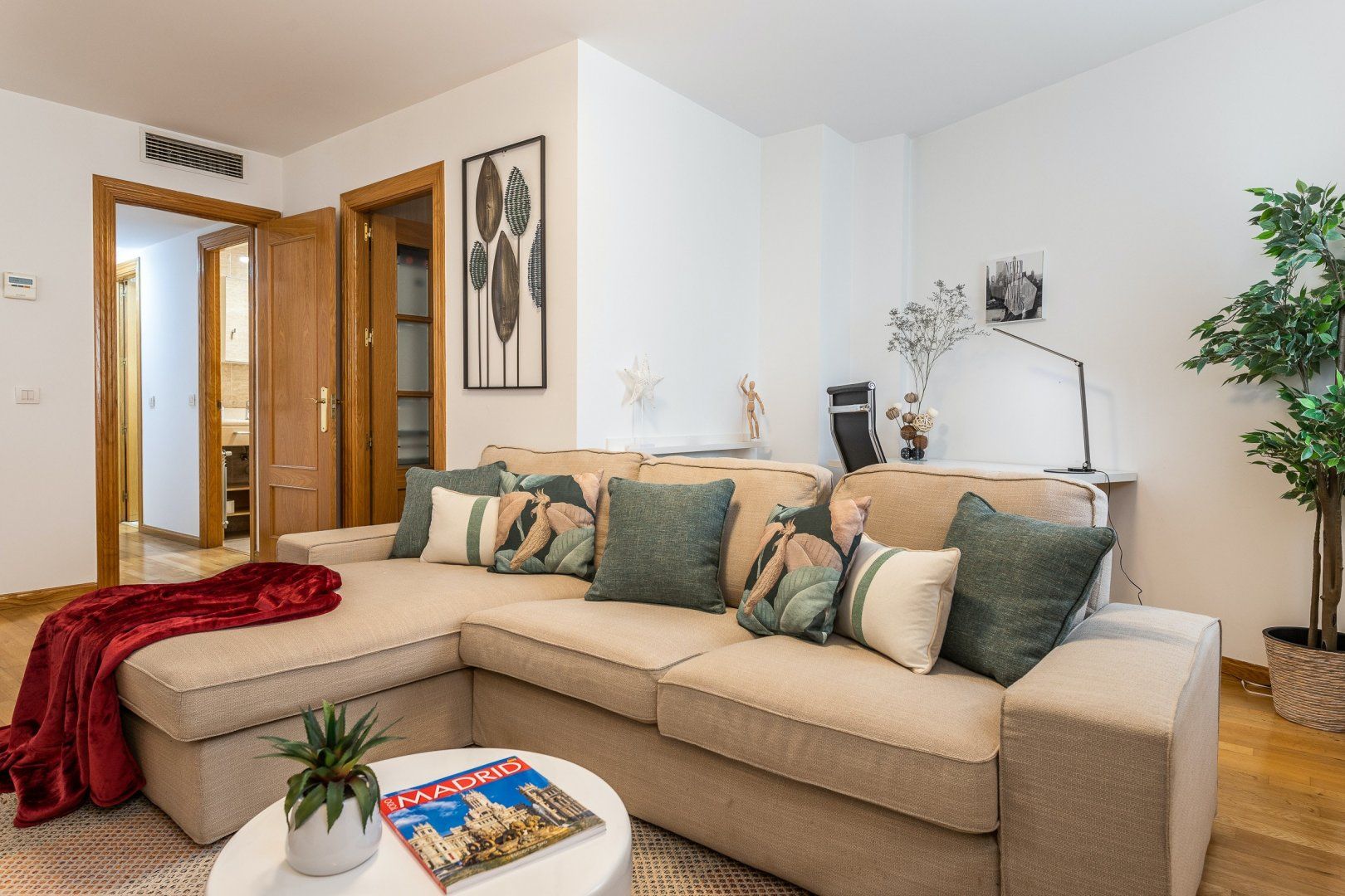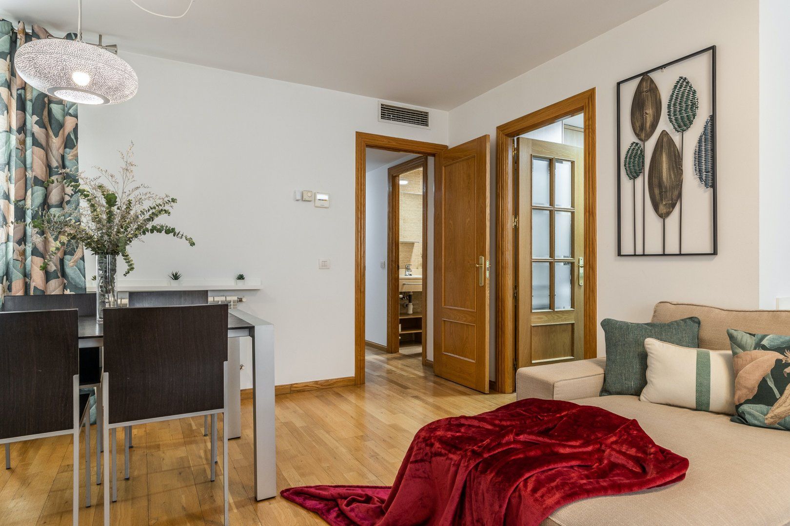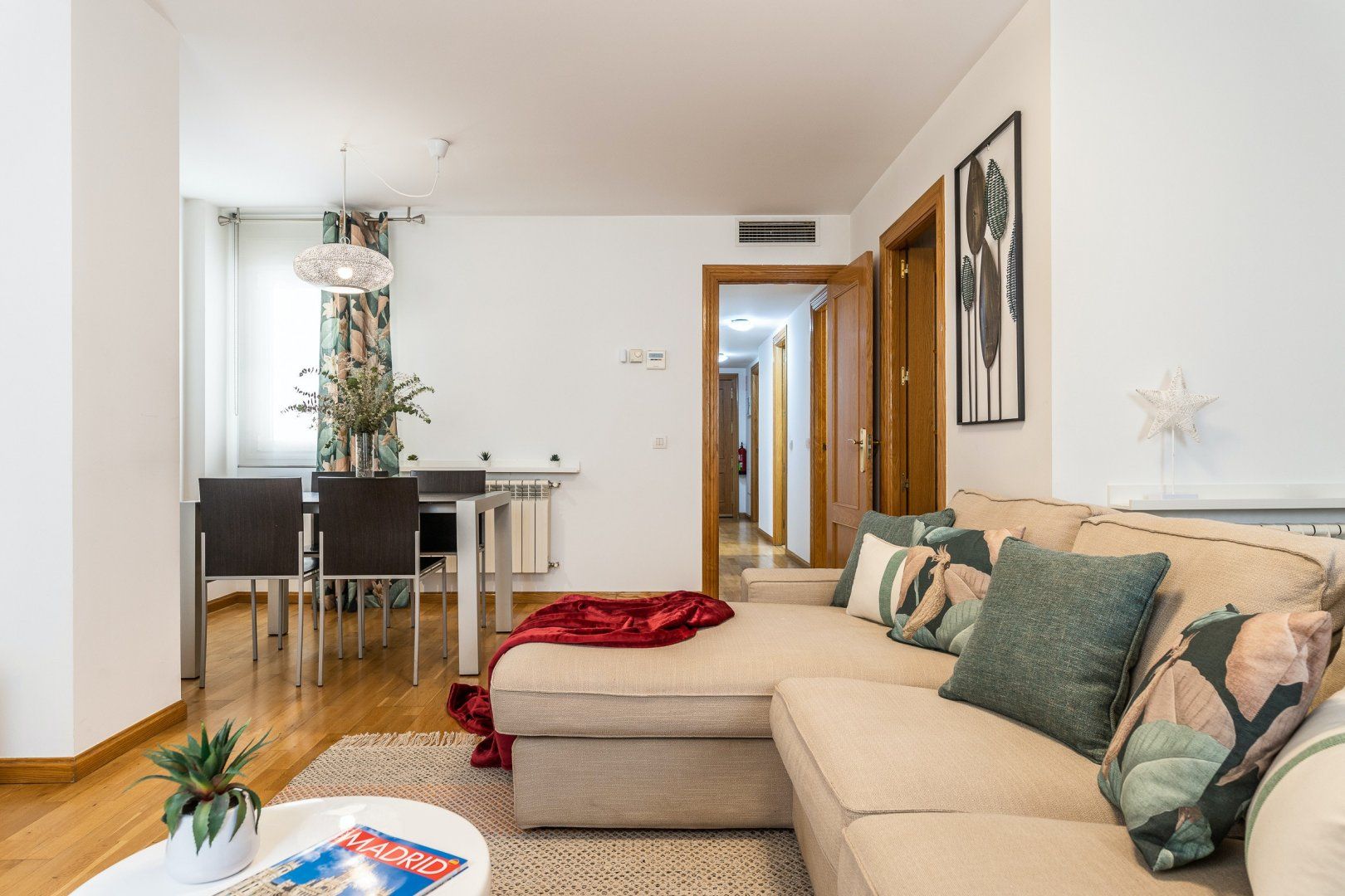 Inside, wood floors, contemporary decor and a collection of eye-catching pieces of art create a calm and welcoming impression in the open-plan living area. The sectional sofa beckons chilled-out evenings over a good book and a glass of Spanish red, while the desk space here comes in handy for those needing to catch up on work. The dining table invites sociable breakfasts over invigorating coffees and celebratory dinners when you’re not out sampling the local tapas scene, and the three comfortable bedrooms are ready to ease you into a restful night’s sleep at the end of a long day of sightseeing.
