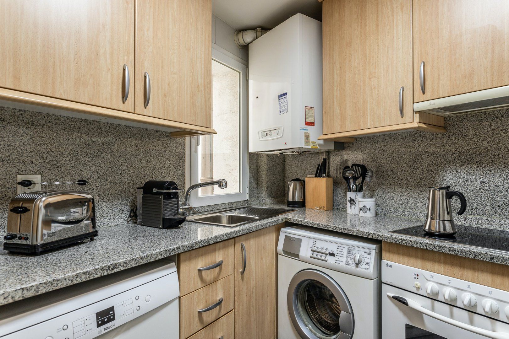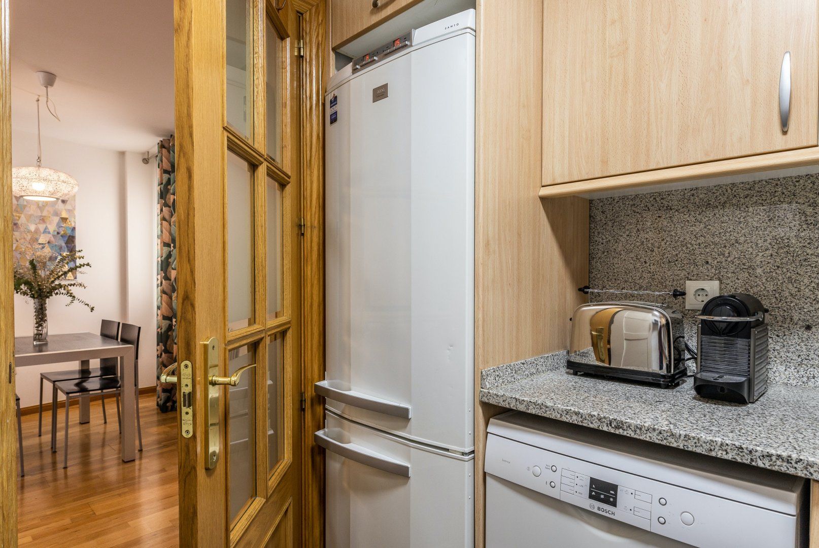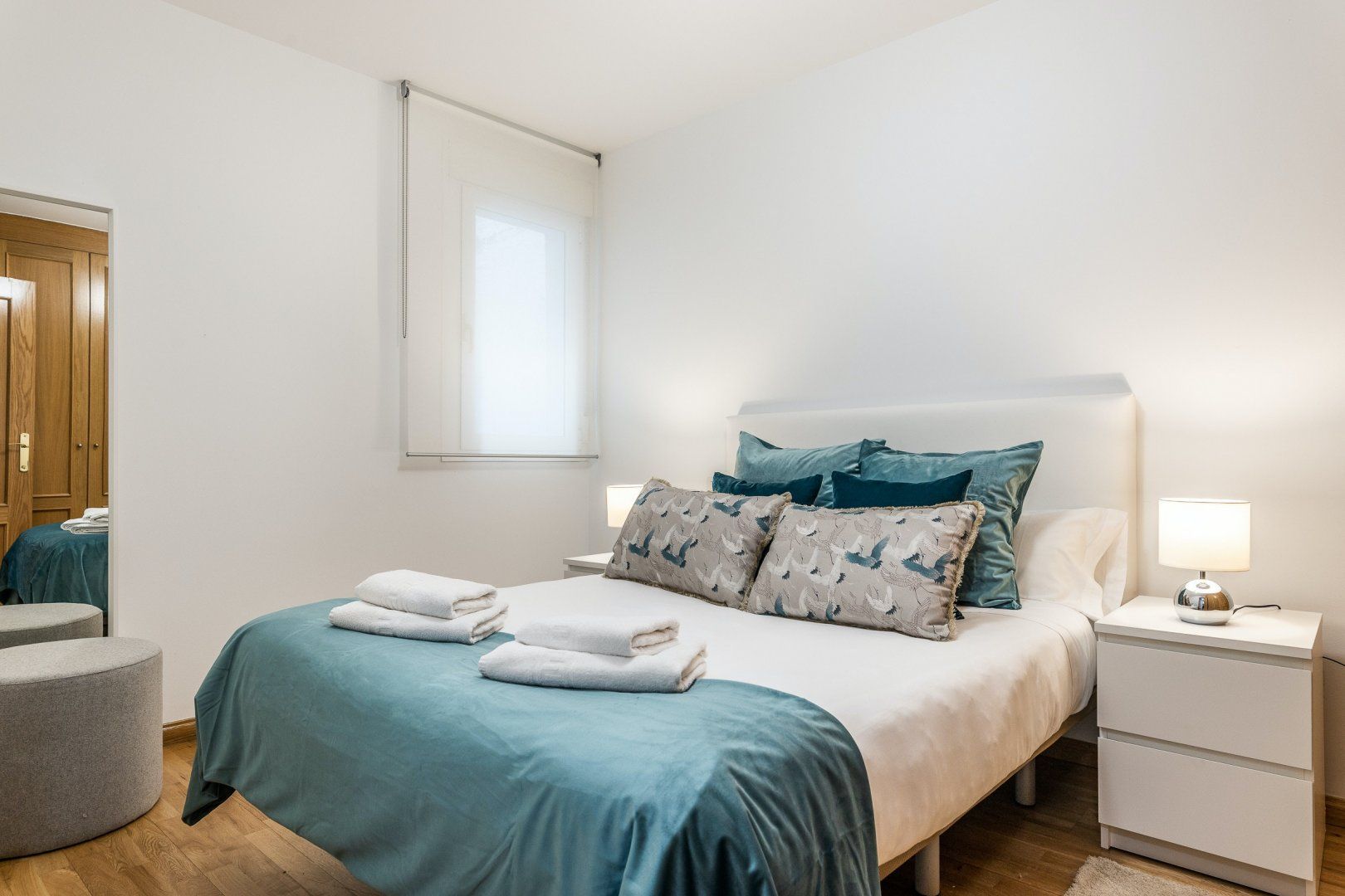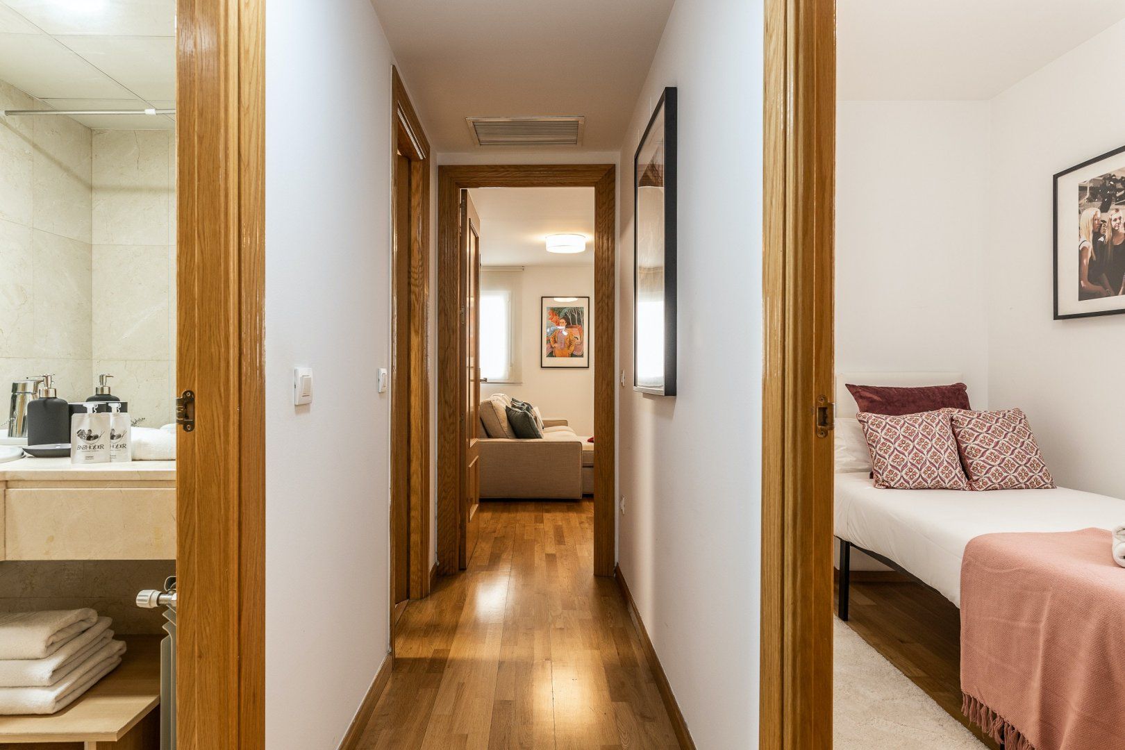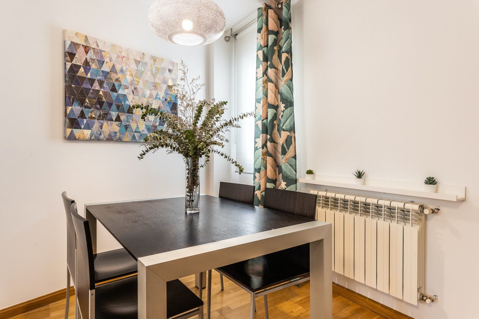 Inside, wood floors, contemporary decor and a collection of eye-catching pieces of art create a calm and welcoming impression in the open-plan living area. The sectional sofa beckons chilled-out evenings over a good book and a glass of Spanish red, while the desk space here comes in handy for those needing to catch up on work. The dining table invites sociable breakfasts over invigorating coffees and celebratory dinners when you’re not out sampling the local tapas scene, and the three comfortable bedrooms are ready to ease you into a restful night’s sleep at the end of a long day of sightseeing.