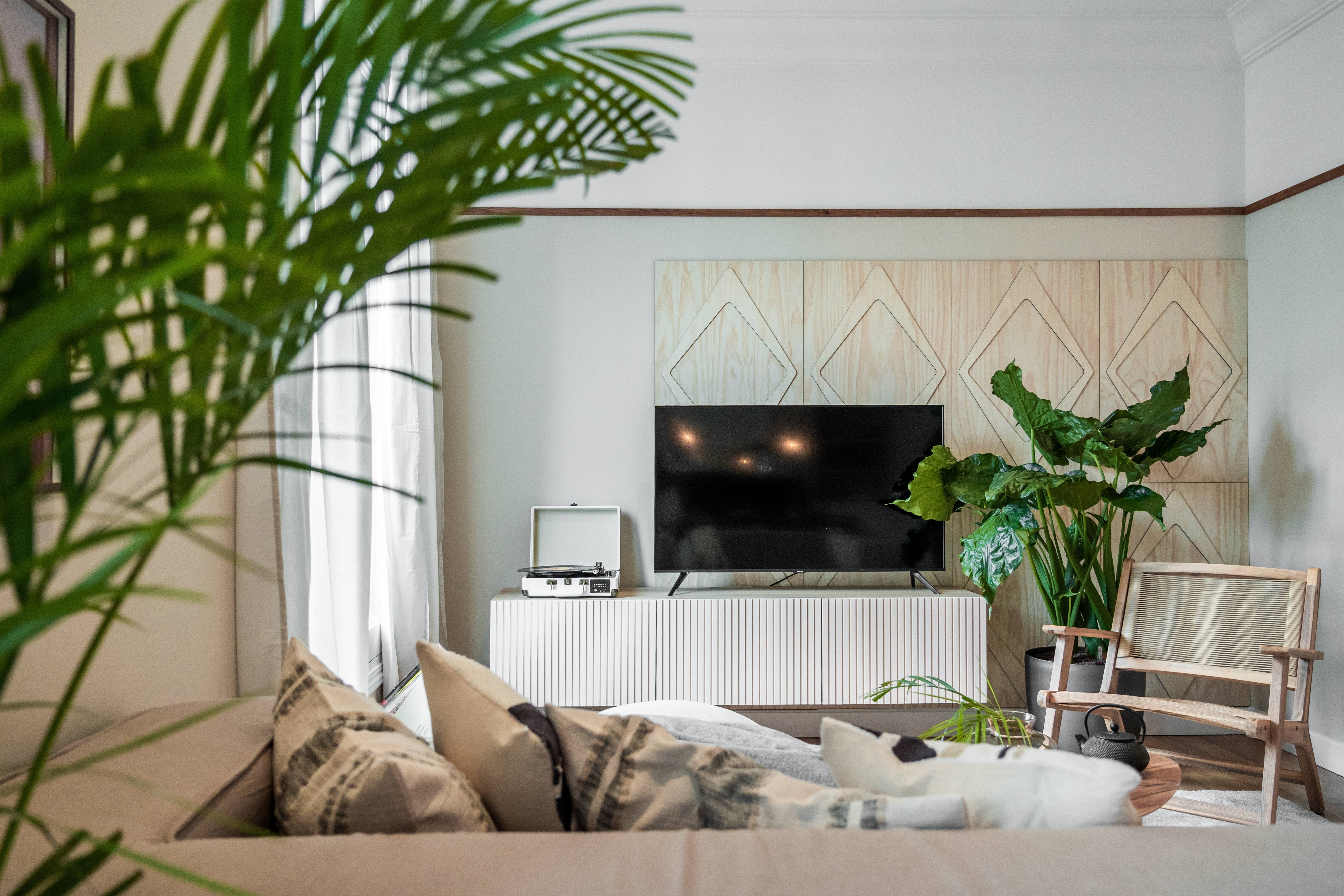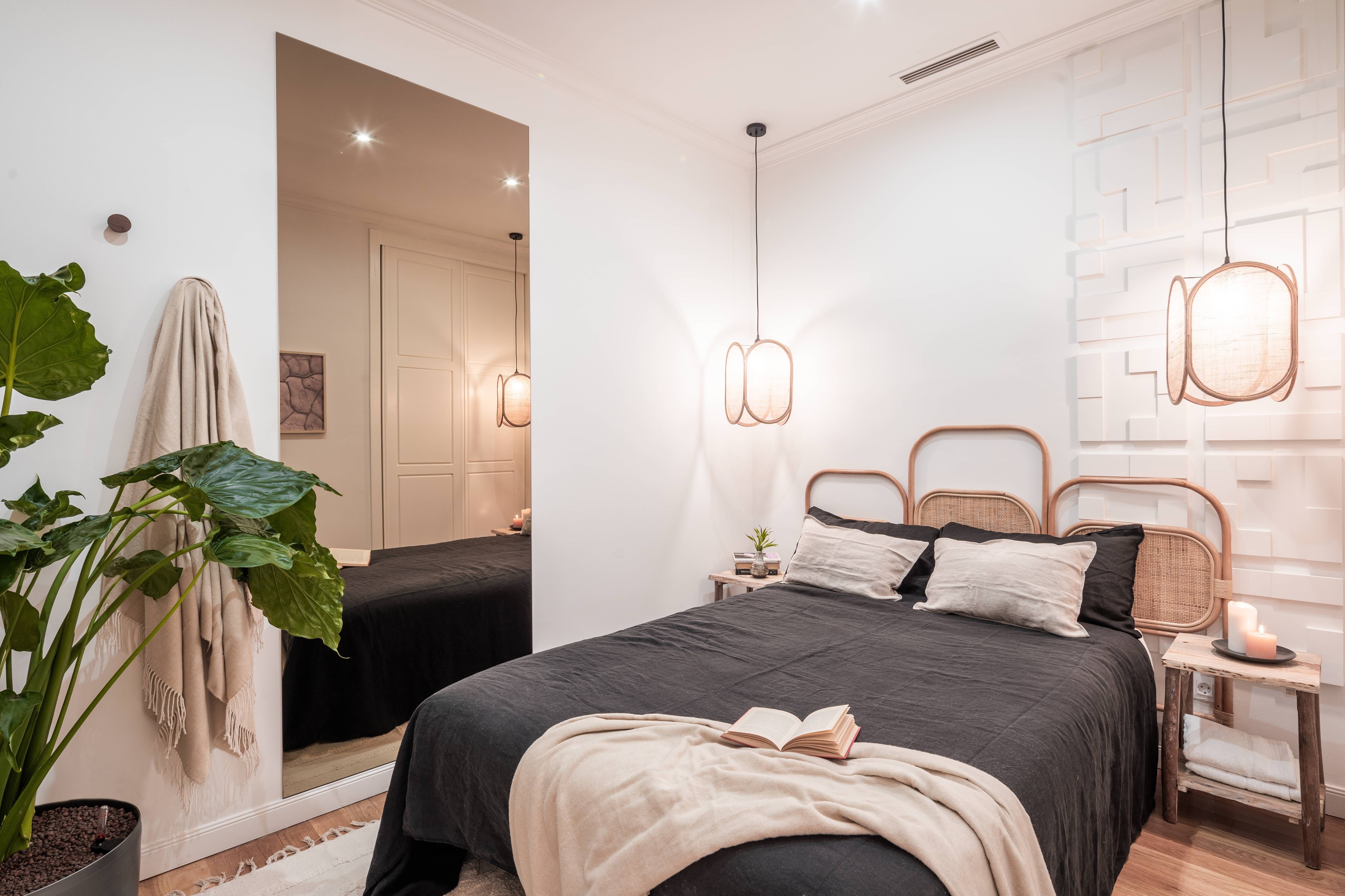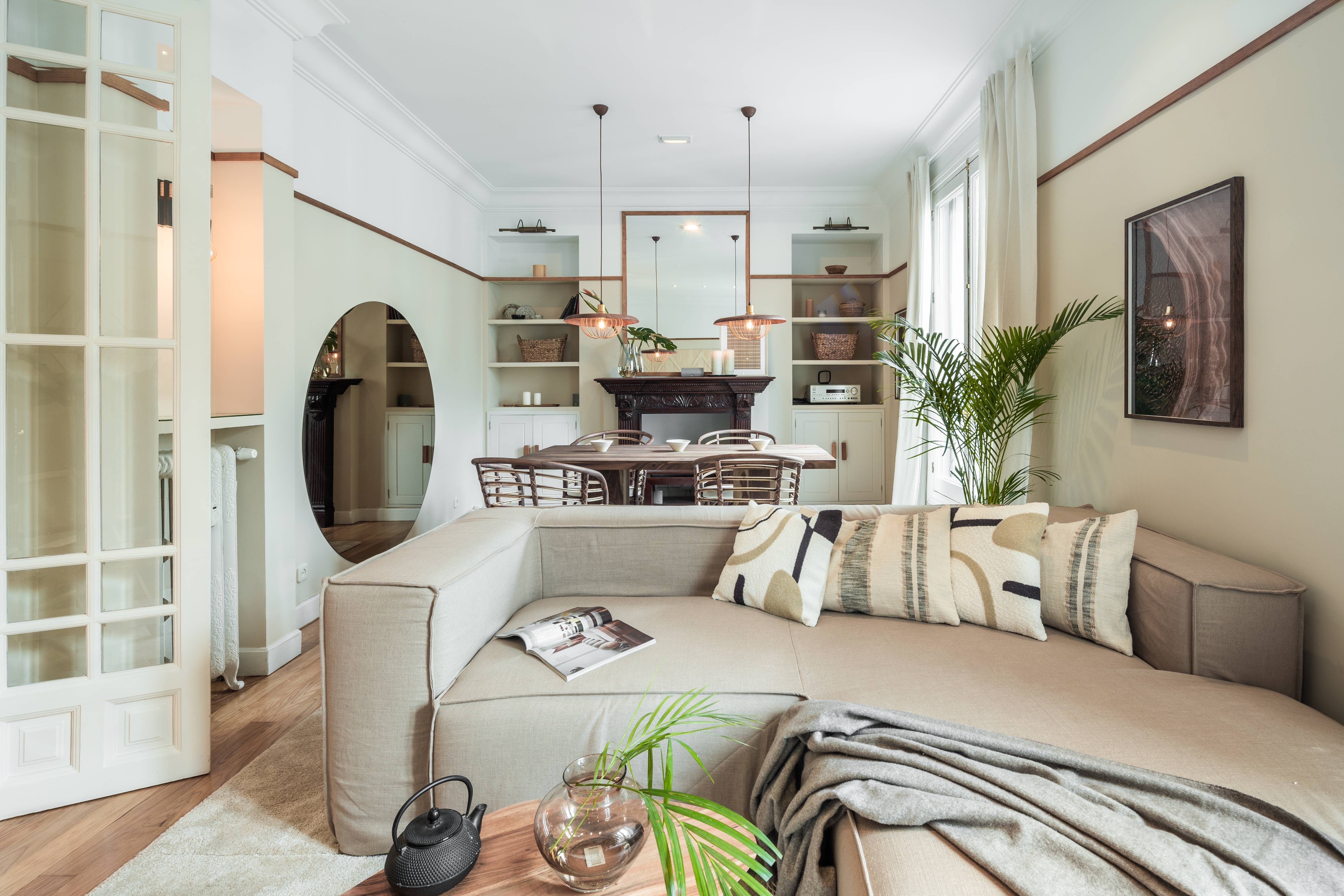 Designed with great attention to detail, it's a comfortable, relaxed and stylish place for up to five guests. Set in a traditional building, with the usual high ceilings, tall windows and Juliet balconies, the cool tones of pale green and white give it a fresh look, and we particularly love the use of wood panelling and the enormous round mirror bouncing light around the dining area. Snuggle on the sofa, play some tunes on the record player or enjoy a relaxed meal and a couple of glasses of wine at the table.