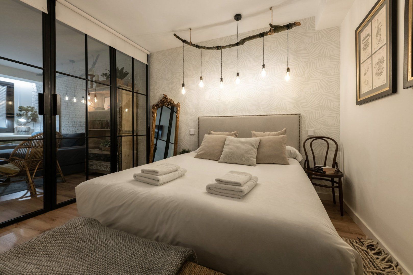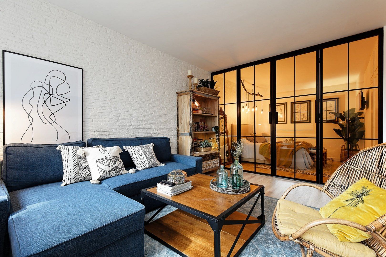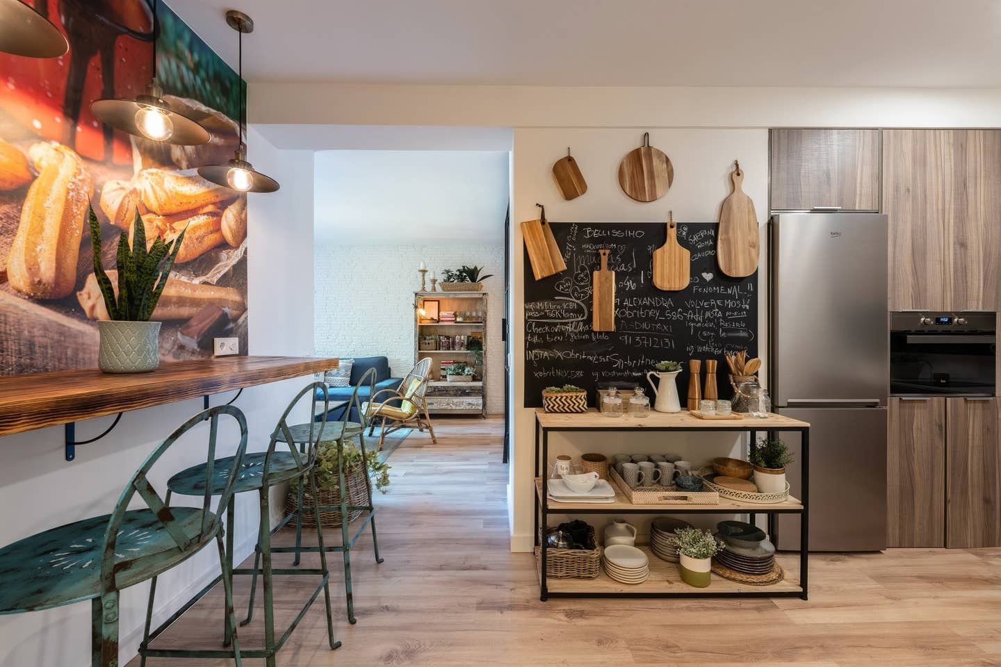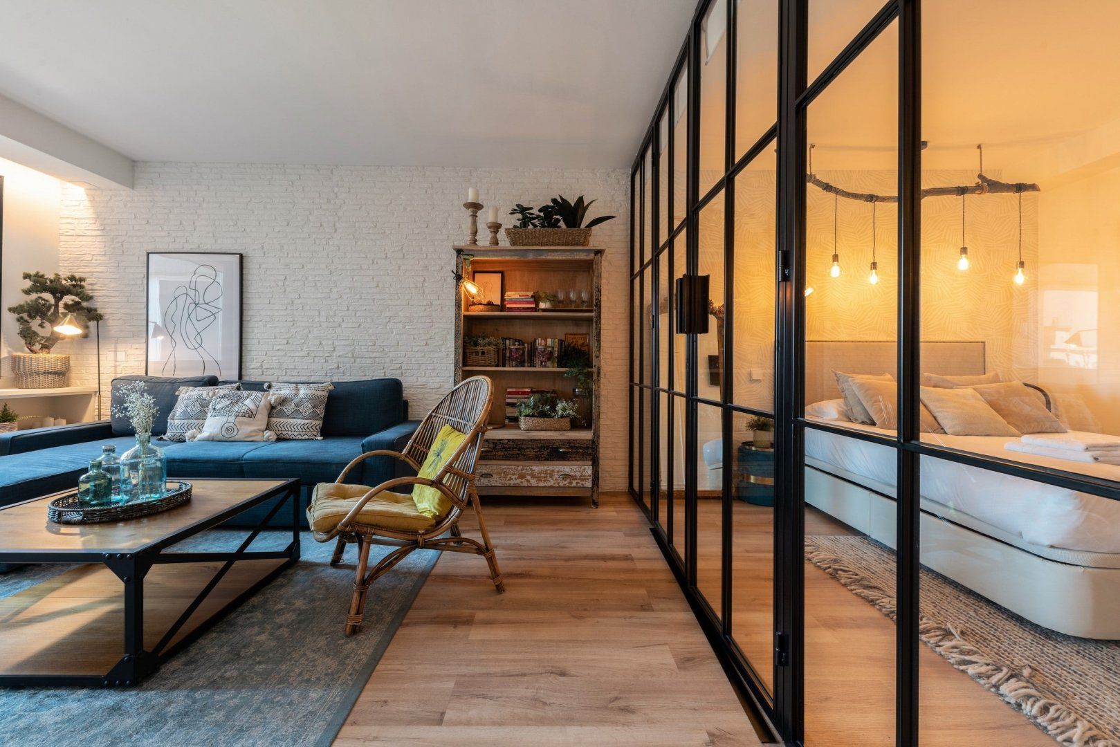 With elegant finishes, from the chic artwork adorning the exposed, white brick walls, to the thoughtful choice of contemporary soft lighting, it is at once effortlessly cool and cosy. The combination of wooden and metal fittings, mixed with rustic design elements creates a blissful feeling of tranquillity. Enjoy your morning coffee at the charming wooden breakfast bar, or take an afternoon siesta, opening up the beautiful floor-to-ceiling glass doors.