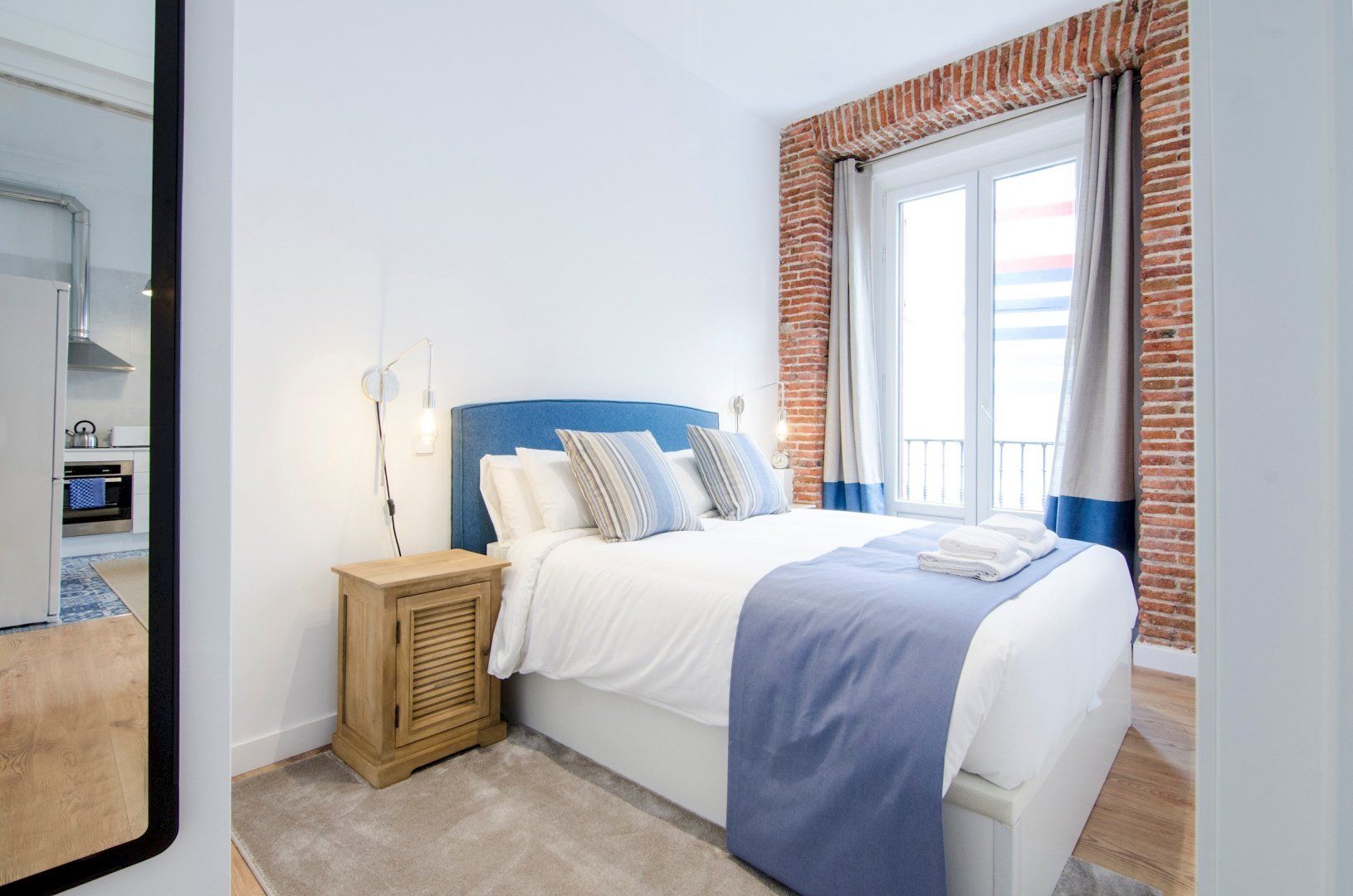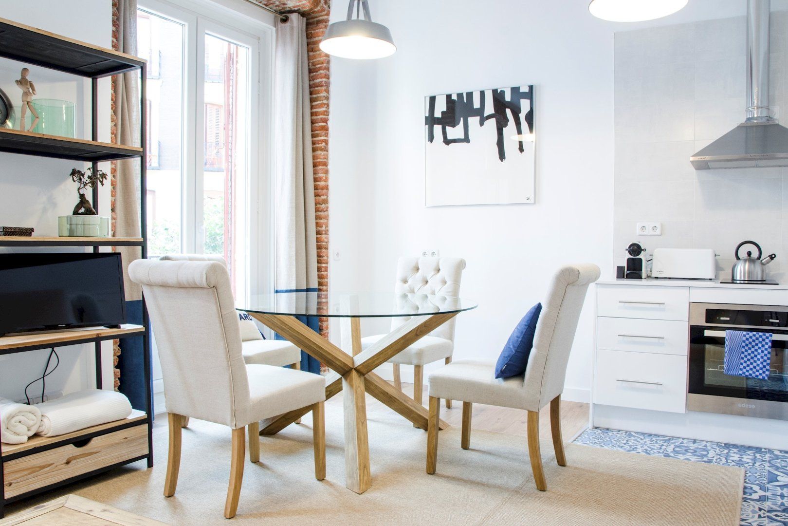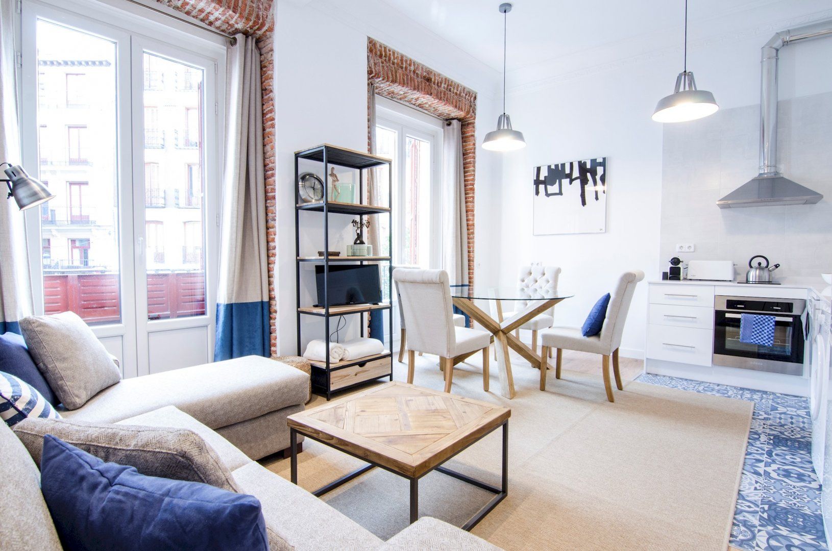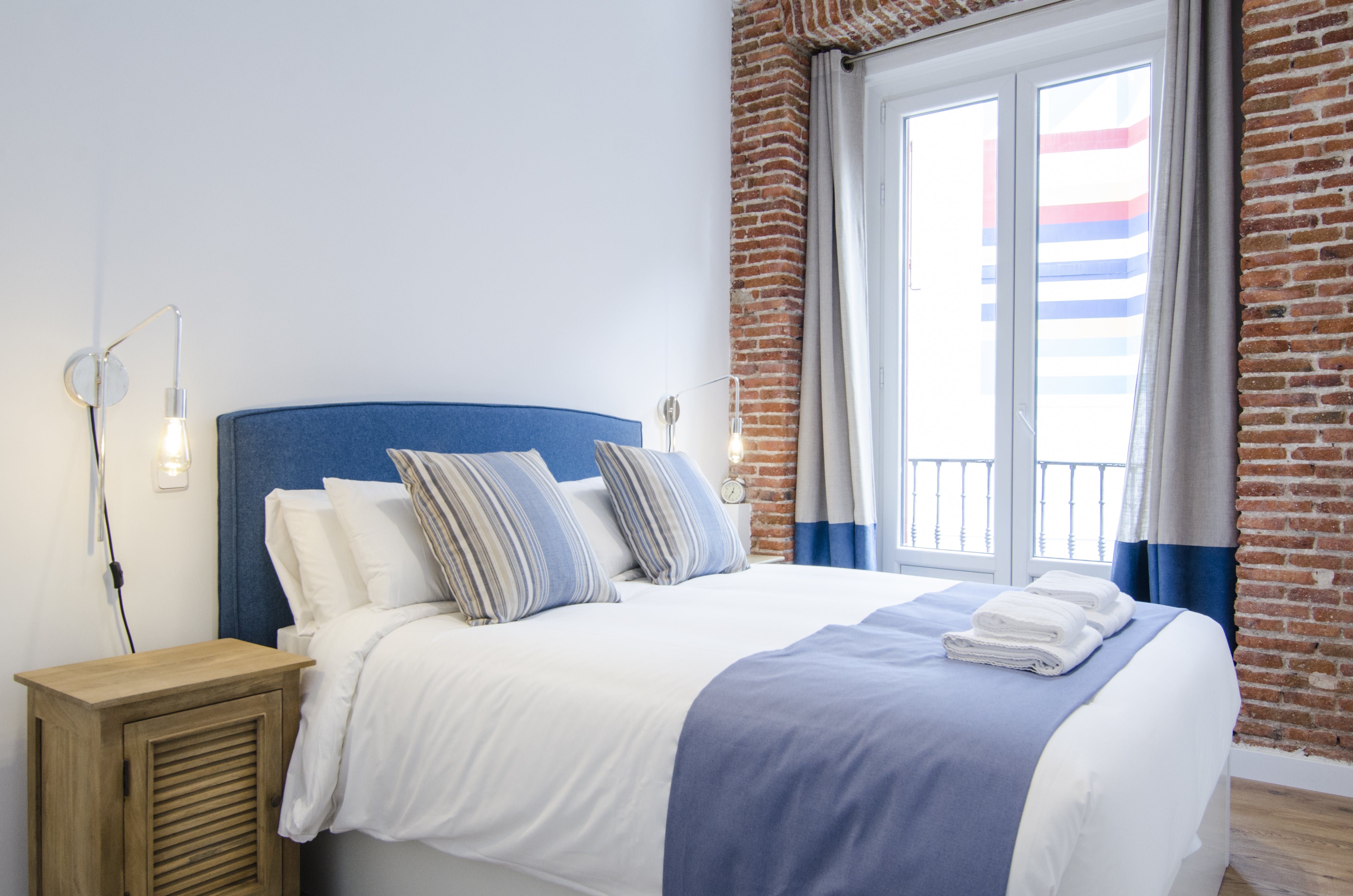 With its blue and white colour scheme, exposed brick details and open-plan layout, it embodies city living in chic, cool style. Open up the bedroom’s French doors to look out over the city from the Juliet balcony first thing in the morning before ambling into the living room where another pair of Juliet balconies await. Kick back on the sofa with your coffee, letting the breeze sweep in through the open doors, then set out for a day of sightseeing – Plaza Mayor is just a seven-minute walk away, Gran Vía is a ten-minute stroll, while both the Royal Palace of Madrid and the world-famous Museo Nacional del Prado are fifteen minutes away on foot.