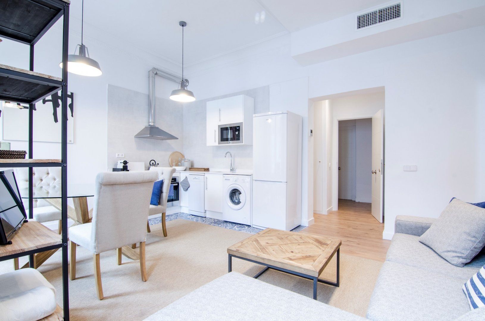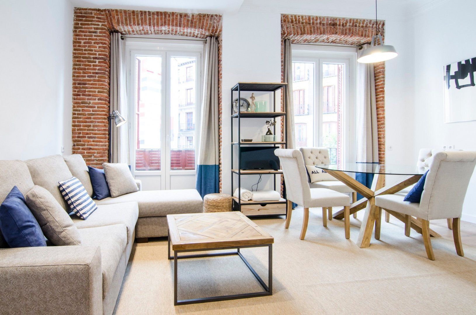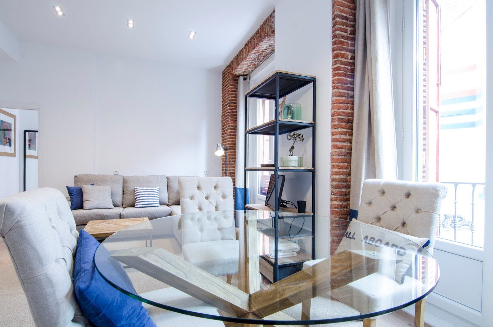 With its blue and white colour scheme, exposed brick details and open-plan layout, it embodies city living in chic, cool style. Open up the bedroom’s French doors to look out over the city from the Juliet balcony first thing in the morning before ambling into the living room where another pair of Juliet balconies await. Kick back on the sofa with your coffee, letting the breeze sweep in through the open doors, then set out for a day of sightseeing – Plaza Mayor is just a seven-minute walk away, Gran Vía is a ten-minute stroll, while both the Royal Palace of Madrid and the world-famous Museo Nacional del Prado are fifteen minutes away on foot.