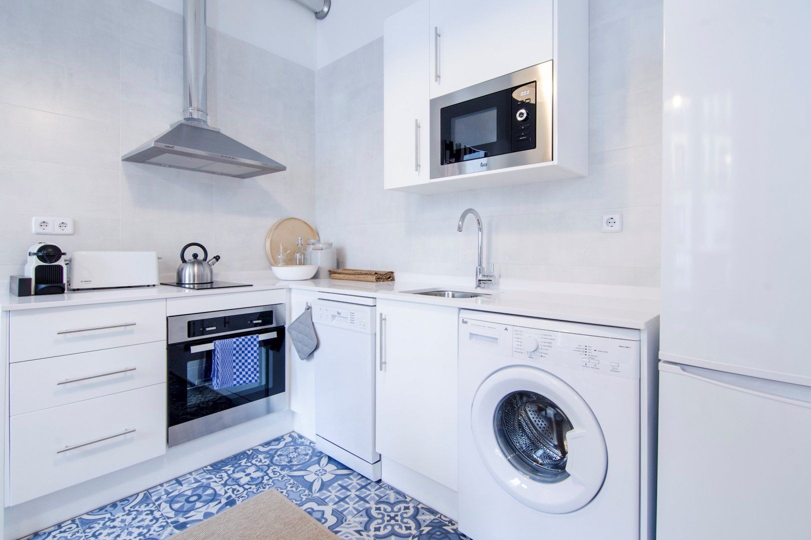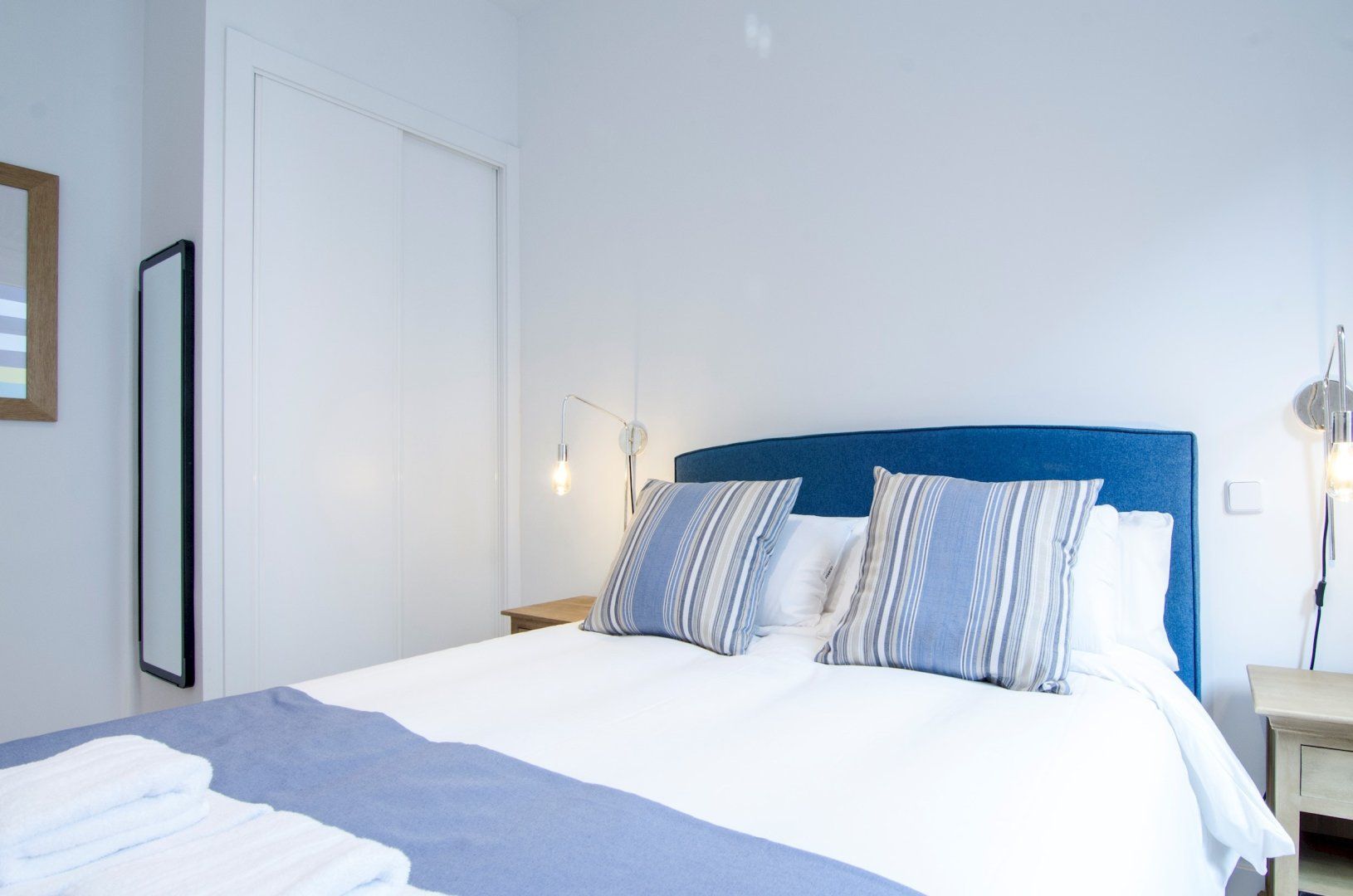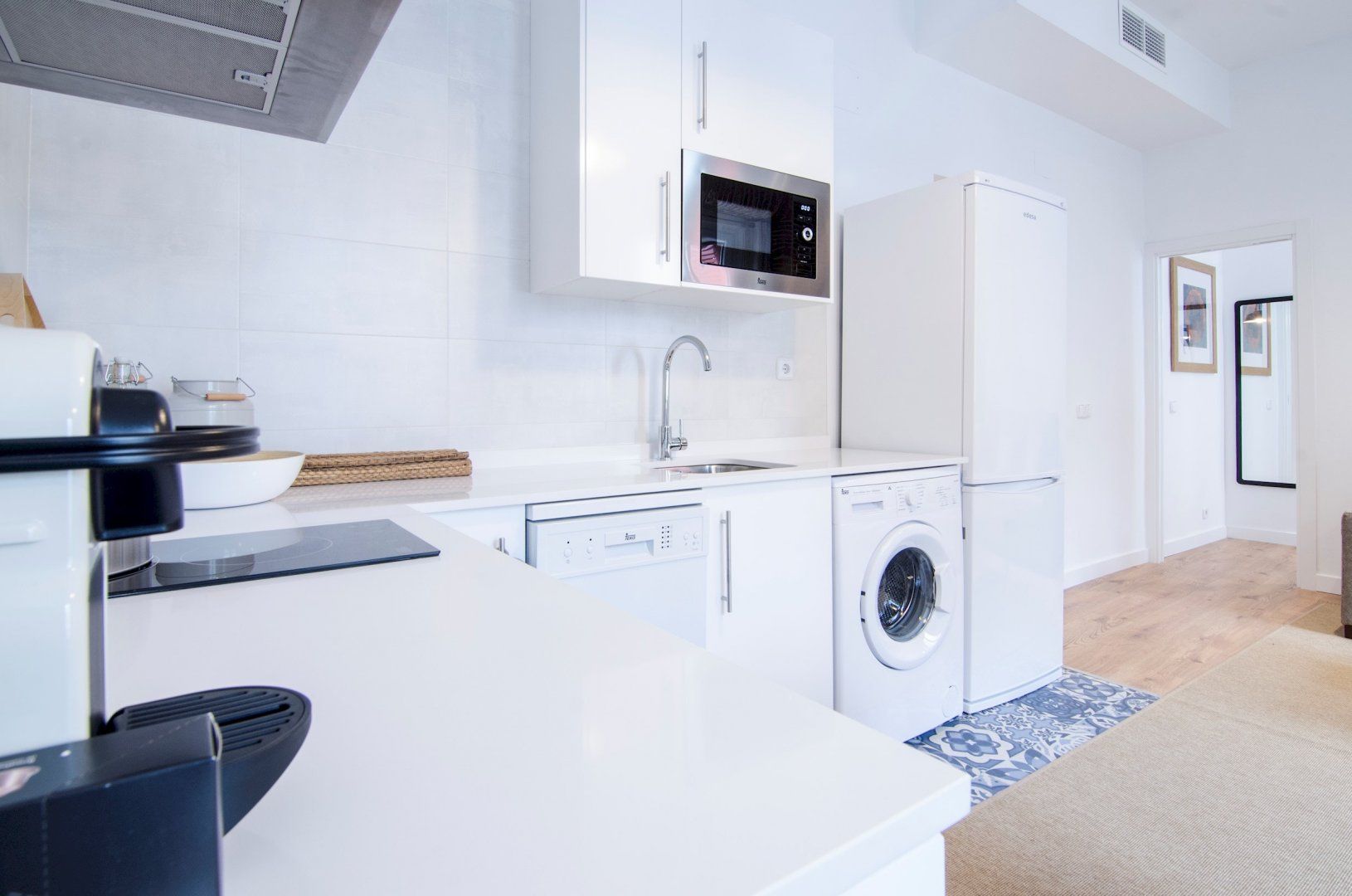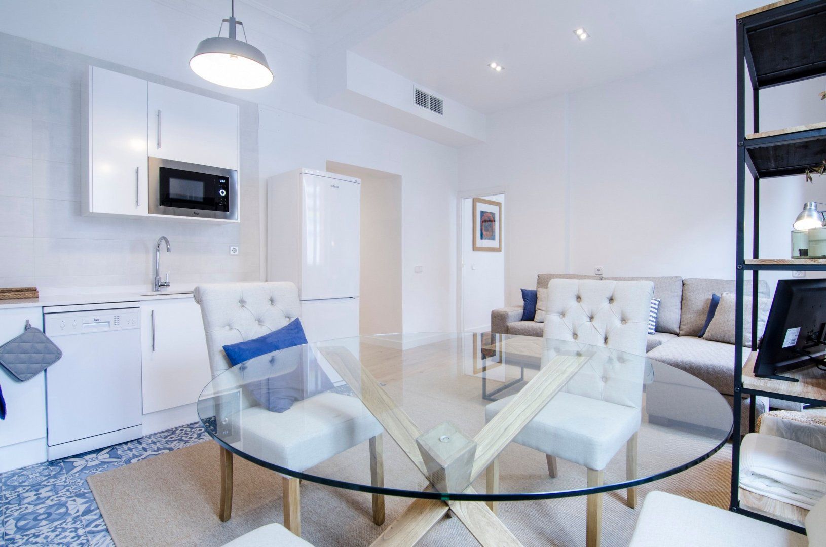 With its blue and white colour scheme, exposed brick details and open-plan layout, it embodies city living in chic, cool style. Open up the bedroom’s French doors to look out over the city from the Juliet balcony first thing in the morning before ambling into the living room where another pair of Juliet balconies await. Kick back on the sofa with your coffee, letting the breeze sweep in through the open doors, then set out for a day of sightseeing – Plaza Mayor is just a seven-minute walk away, Gran Vía is a ten-minute stroll, while both the Royal Palace of Madrid and the world-famous Museo Nacional del Prado are fifteen minutes away on foot.