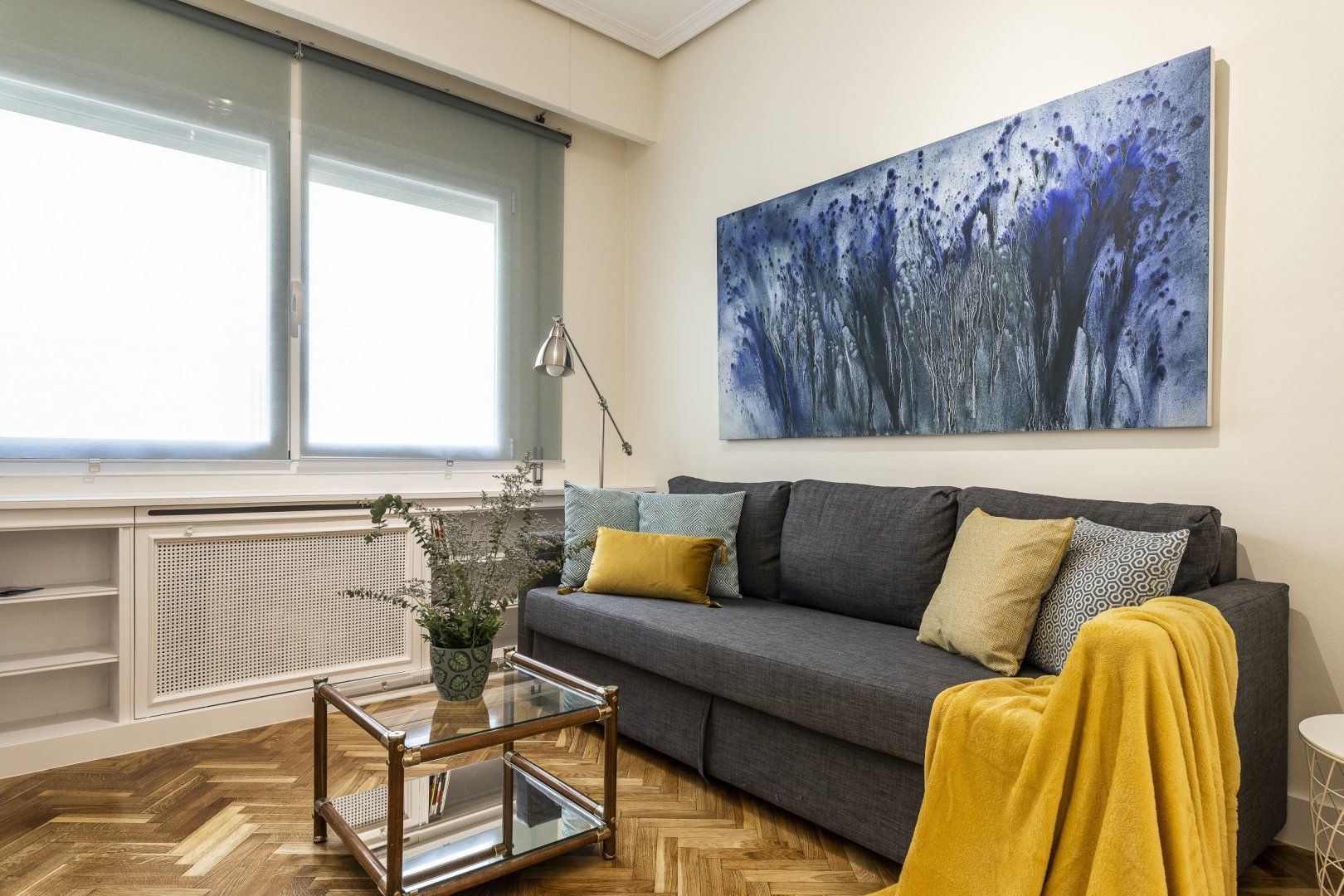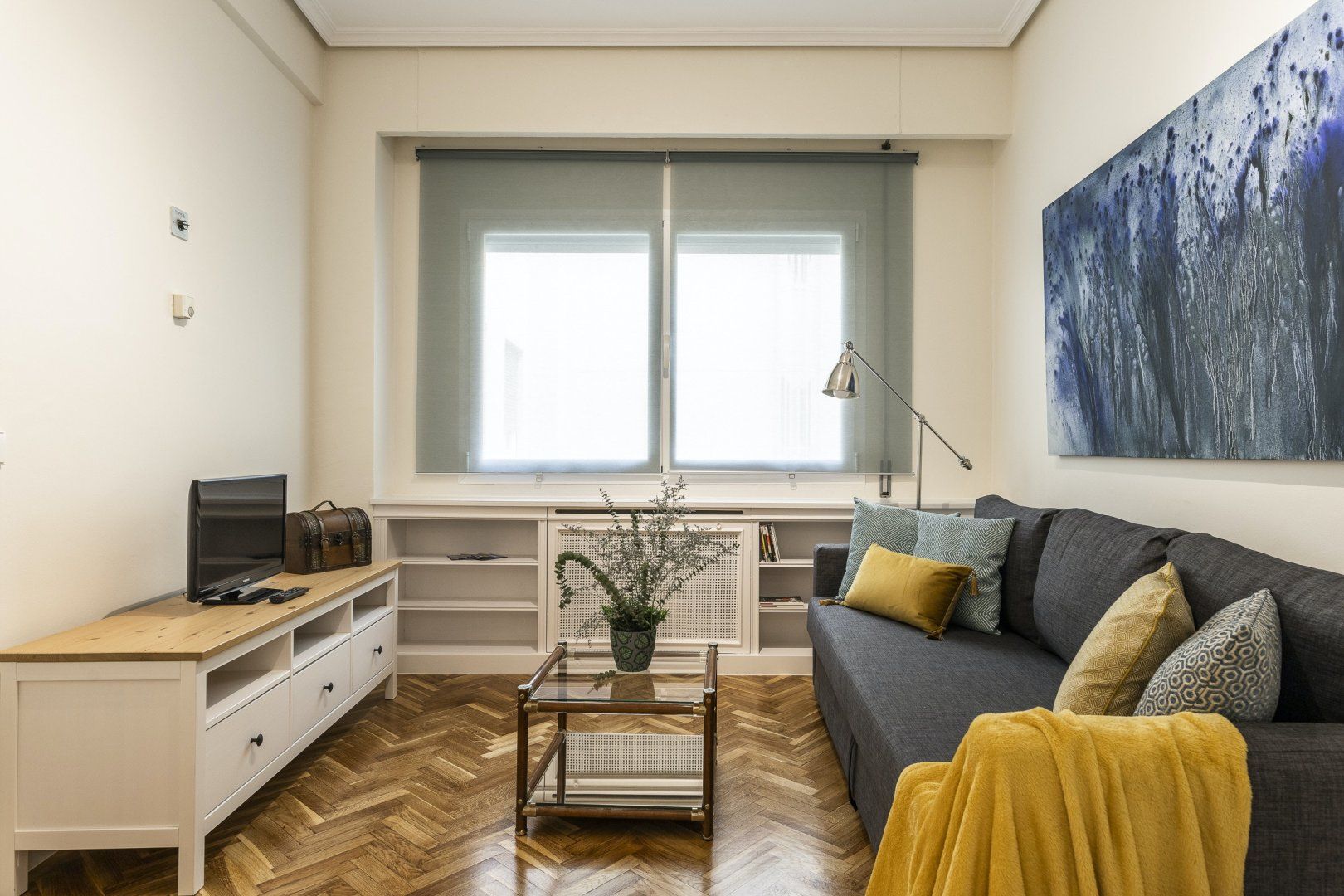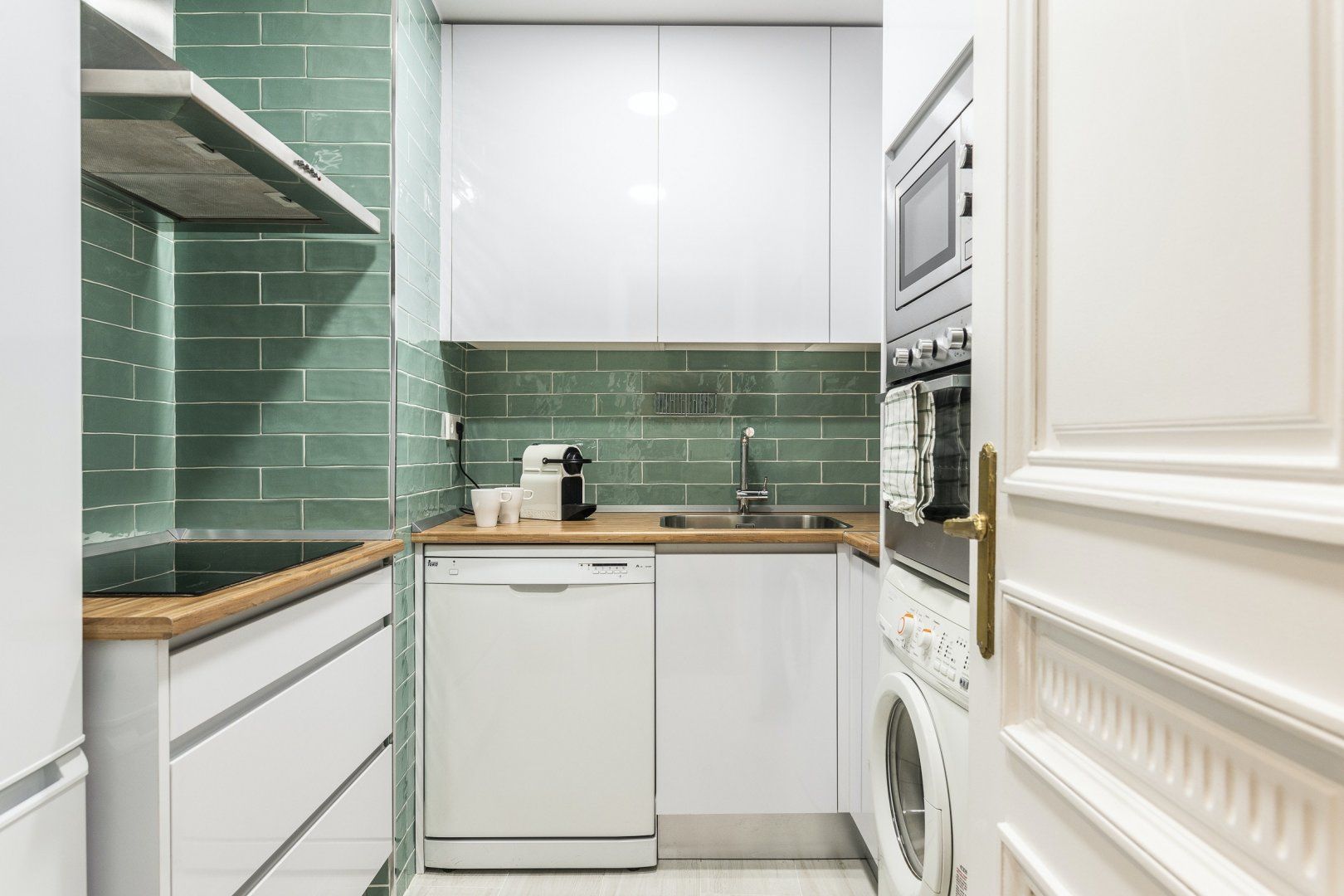 Step inside, and you'll find a sleek, modern space with parquet flooring and high ceilings. The sofa is great for relaxing in the evening and folds out into a bed, for flexible sleeping arrangements. There's also a little dining table and a chic green-tiled kitchen, where you can whip up tasty meals to refuel after a busy day. And, the stylish blue and mustard yellow colour scheme throughout the apartment creates a sense of calm that will make you feel right at home.