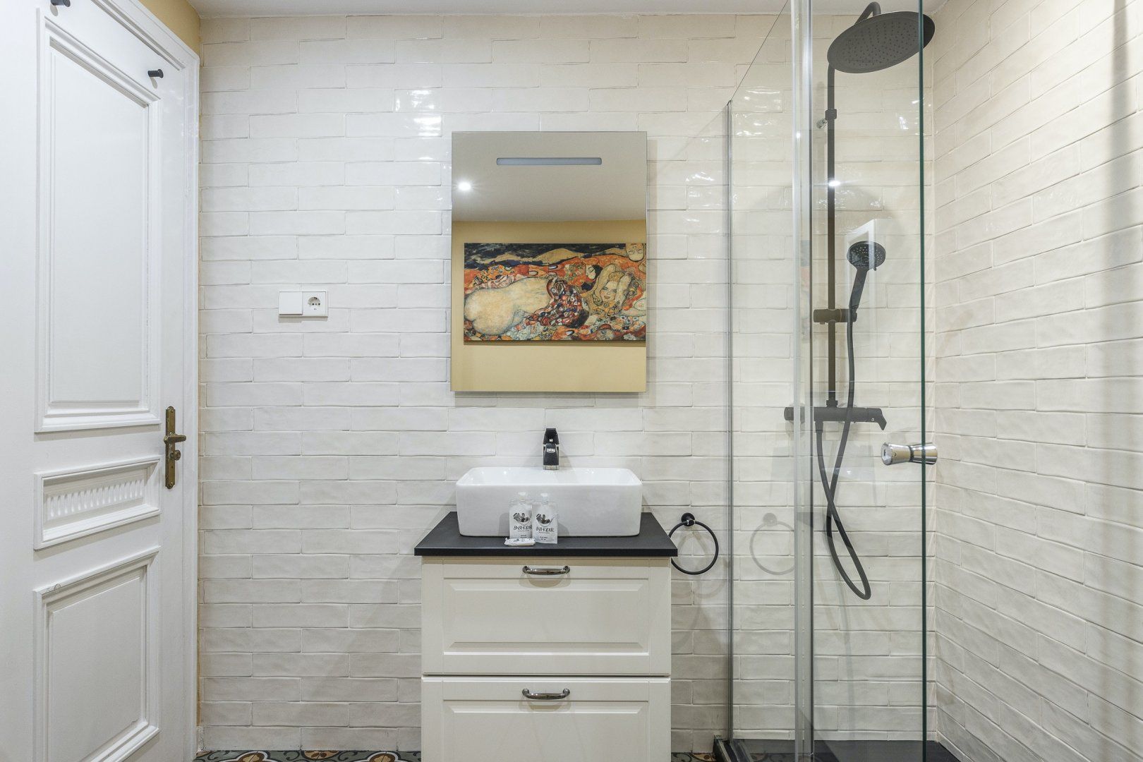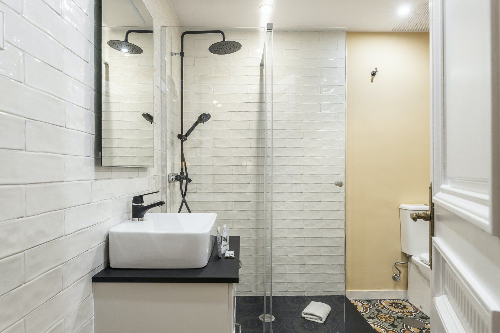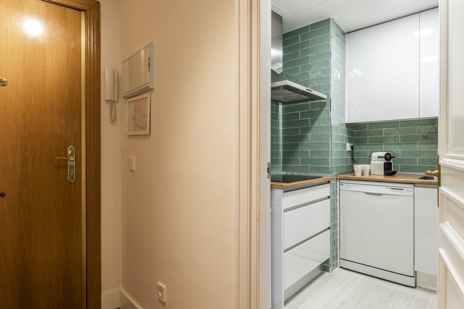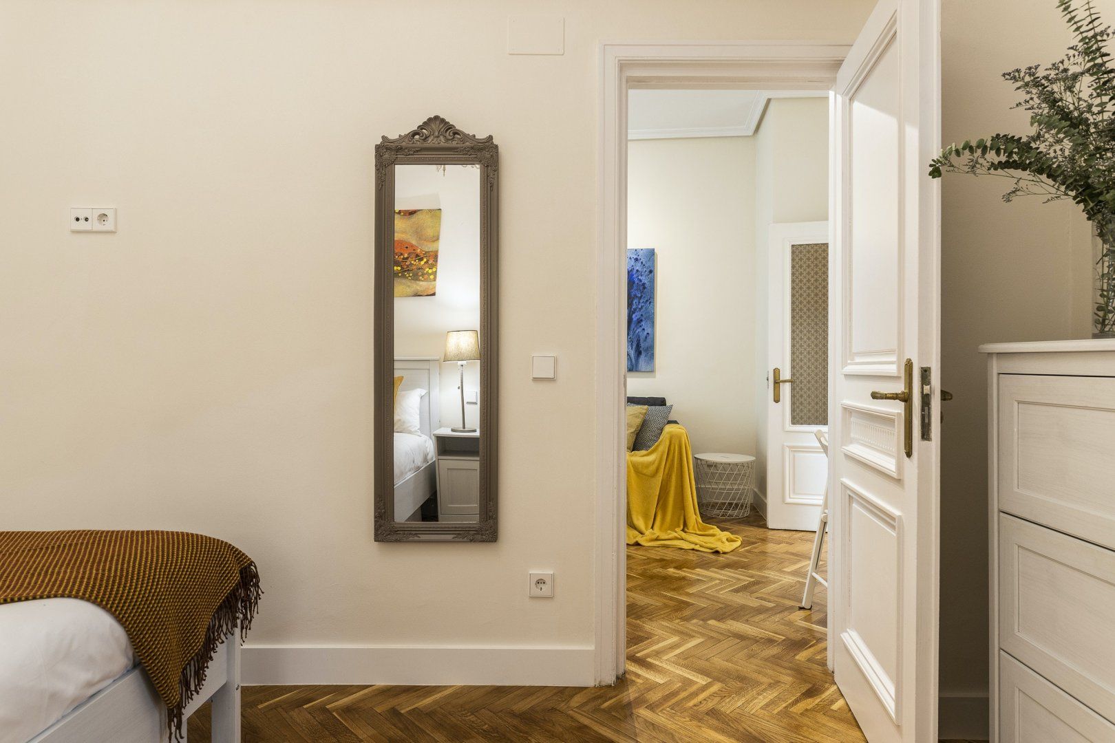 Step inside, and you'll find a sleek, modern space with parquet flooring and high ceilings. The sofa is great for relaxing in the evening and folds out into a bed, for flexible sleeping arrangements. There's also a little dining table and a chic green-tiled kitchen, where you can whip up tasty meals to refuel after a busy day. And, the stylish blue and mustard yellow colour scheme throughout the apartment creates a sense of calm that will make you feel right at home.