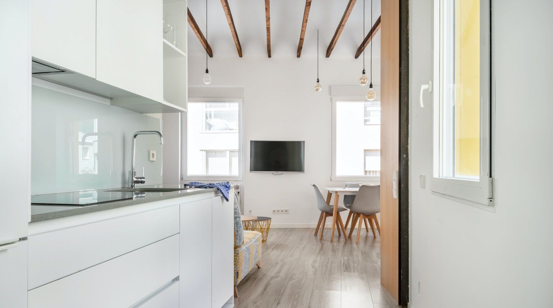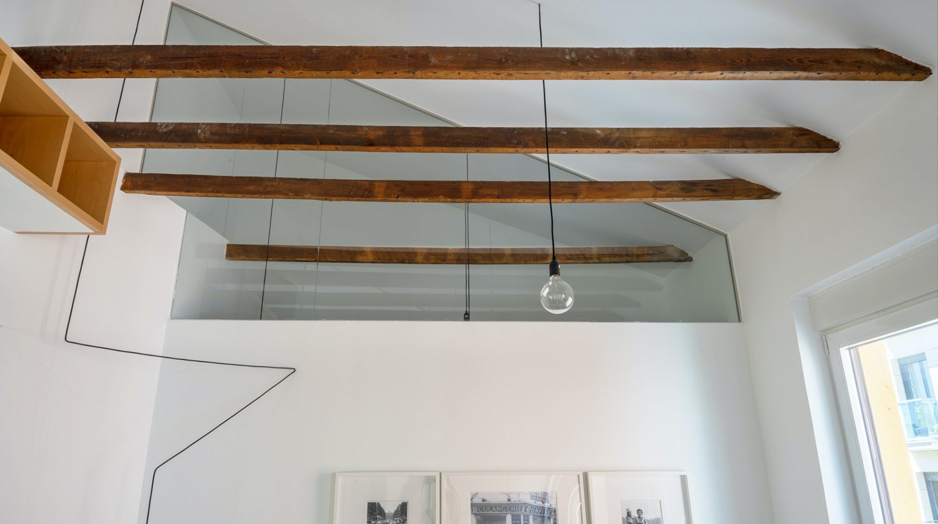 This striking flat combines historic originals and modern fixtures in the most tasteful way. Bright windows and white walls exaggerate the sense of space, alongside high ceilings with rustic timber beams. We love the use of glass panels above the bedroom partitions, as well as the wooden cabinet with all sorts of books and trinkets within.