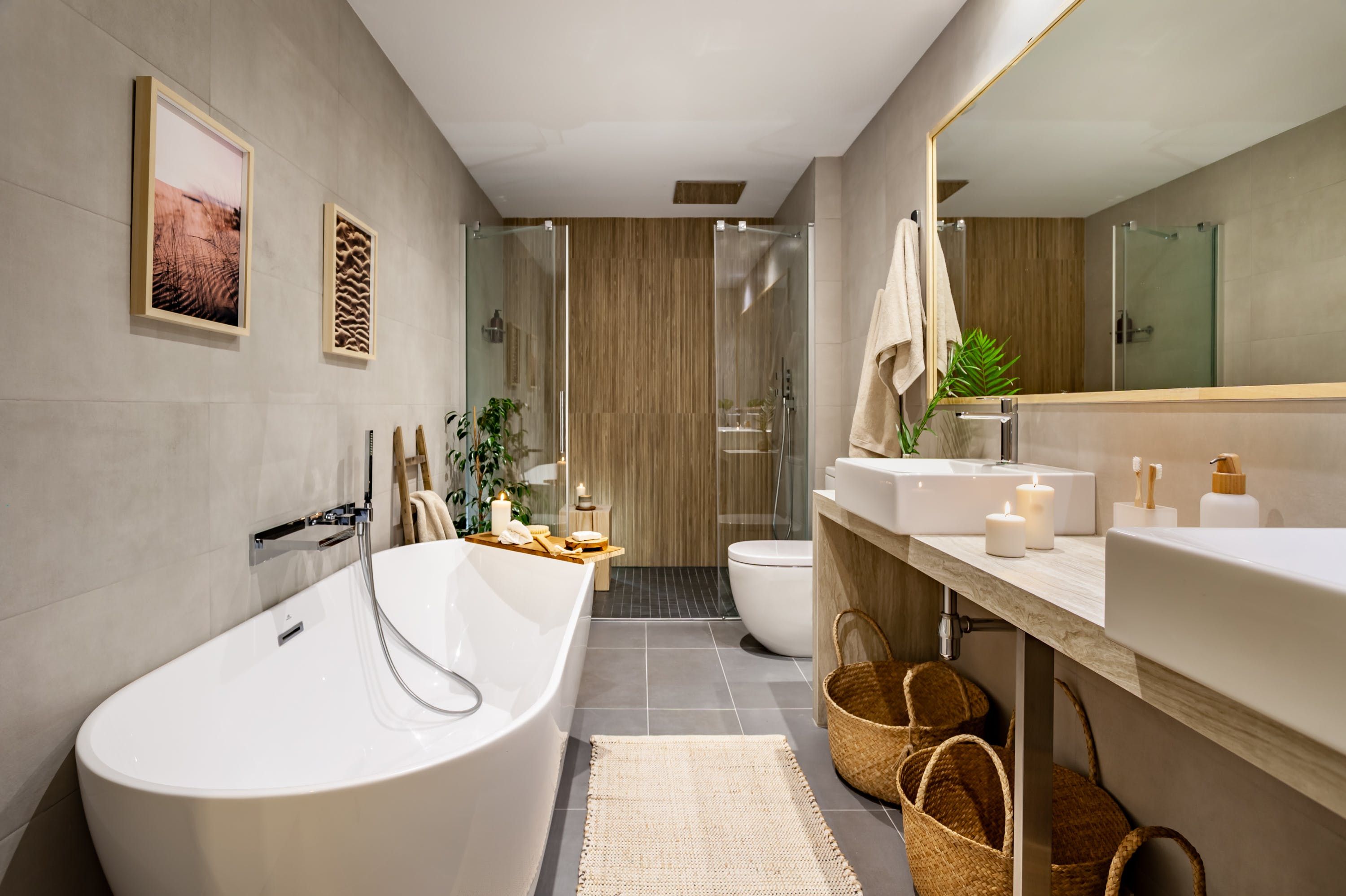 Cool, stylish and modern, this apartment in Madrid's Almagro neighbourhood delivers in spades. Step inside, and you'll feel instantly at ease, with the neutral colour palette, hemp furnishings and green houseplants. Relax with a glass of Spanish wine in the bright open-plan living space while the record player serenades your afternoon lounging. We particularly liked the crittall-style window finish that cleverly divides the kitchen up, while keeping things sociable. Through to the bedrooms and en-suite bathrooms, where this home really becomes a sanctuary of rest and relaxation. Treat yourself to an indulgent bubble bath in the freestanding tub or wrap yourself up in a soft throw and enjoy a sneaky siesta. Those keeping one eye on work during their stay will find the dedicated office spaces perfectly suited for client catch-ups and quiet moments.