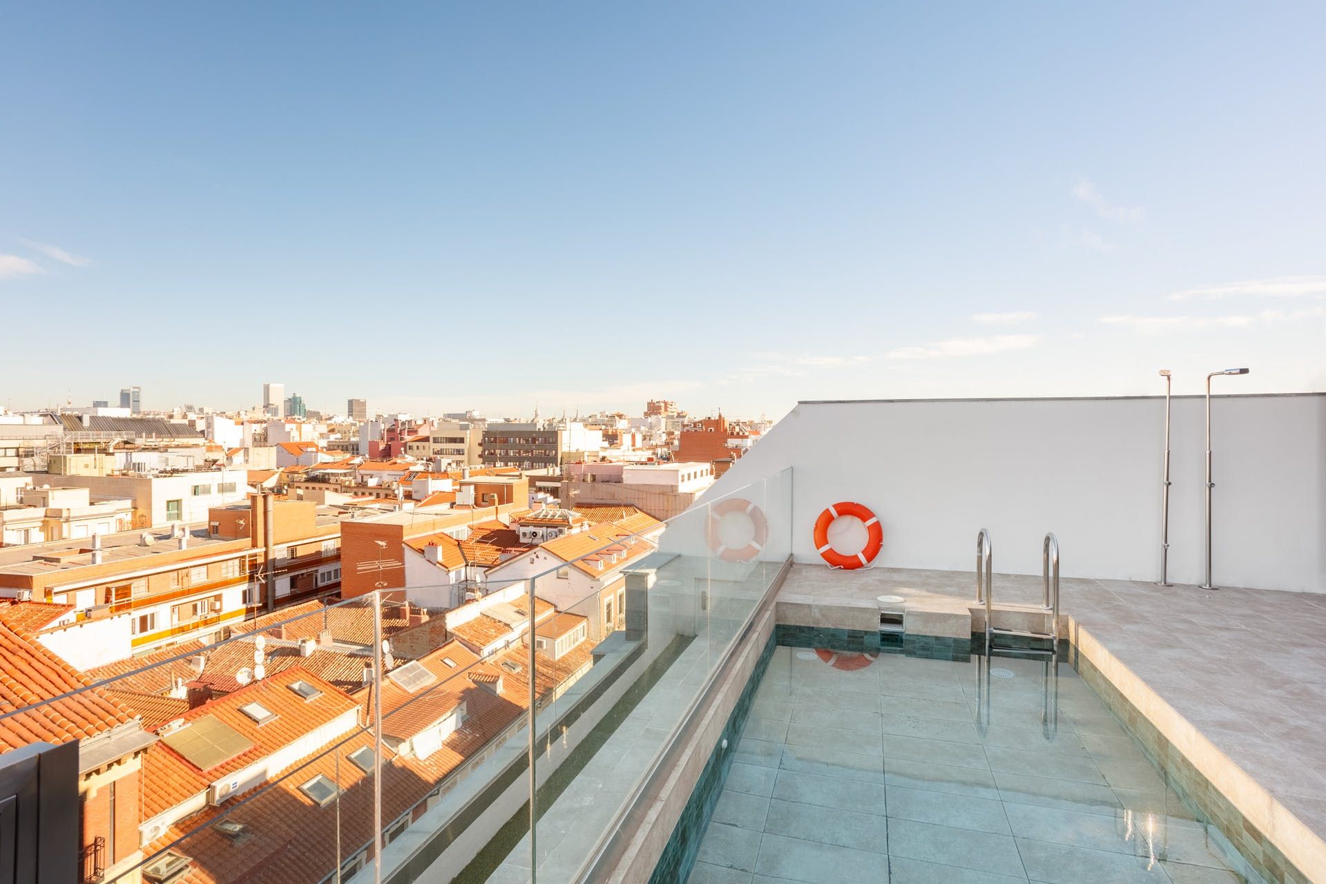 But the real highlight of this home is upstairs on the building's communal roof terrace, where you can cool off with a dip in the pool while looking over the city's terracotta-hued skyline. Pre-dinnner drinks go down a treat up here too – we recommend gathering together for jugs of sangria and sunset views. Below, it's only twenty-six minutes on foot or seventeen minutes by public transport to the Plaza Mayor, lined with centuries-old buildings and traditional architecture. When you're not taking in the cultural attractions or tucking into a paella at one of the restaurants nearby, both El Retiro Park and the Prado Museum are under thirty minutes away by metro or on foot.