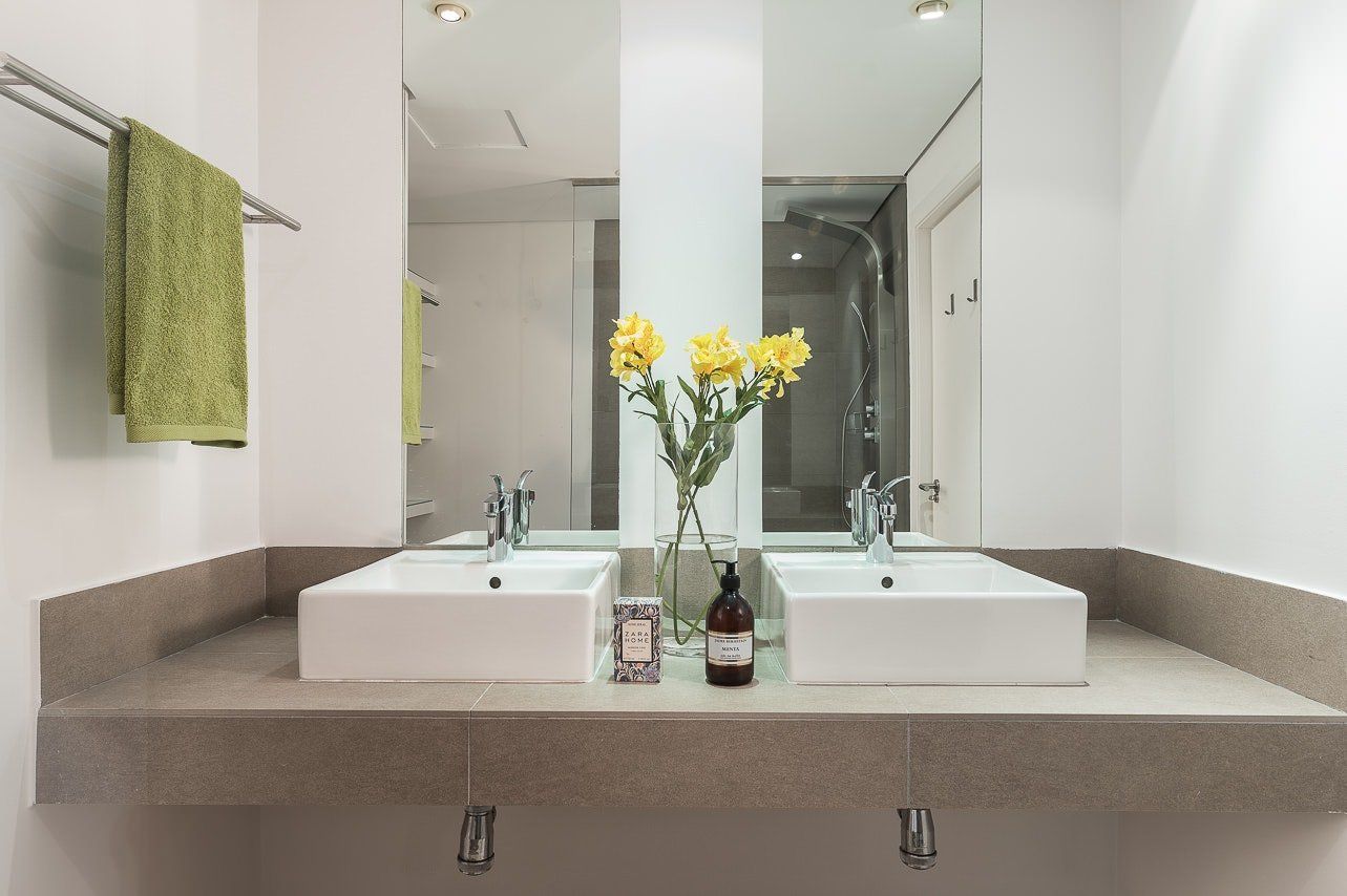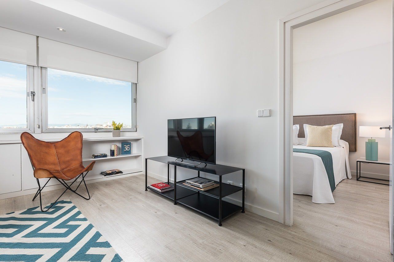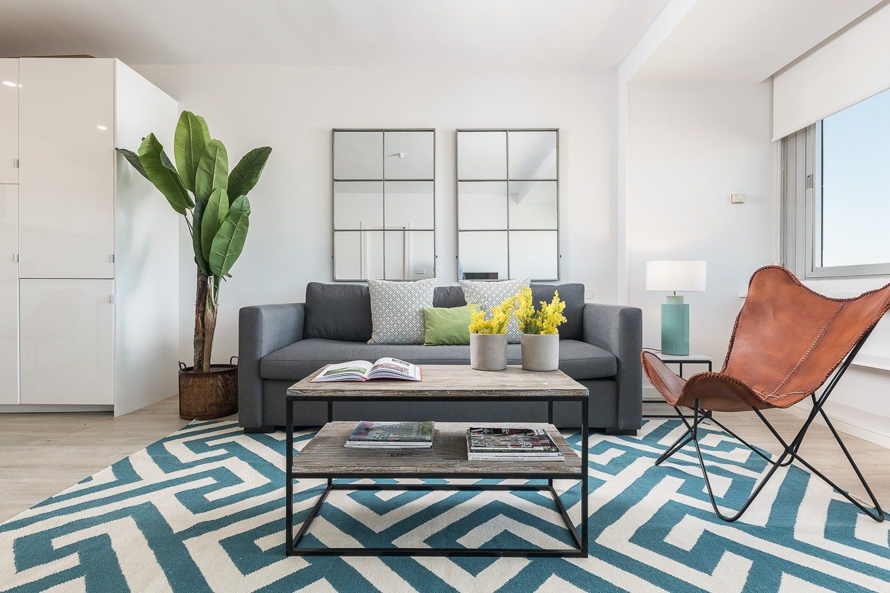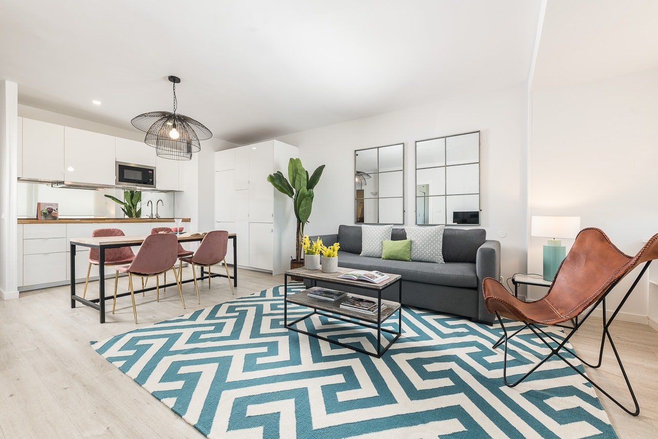 A soft muted colour palette is offset by bright pops of colour in the living area’s decorative rug and leafy houseplants, with the city just outside creating a dazzling backdrop from your ninth-floor vantage point. Make yourself at home on the comfortable sofa – a glass of Spanish wine in hand – or gather together at the table for an intimate soirée when you’re not out sampling the local tapas bars.