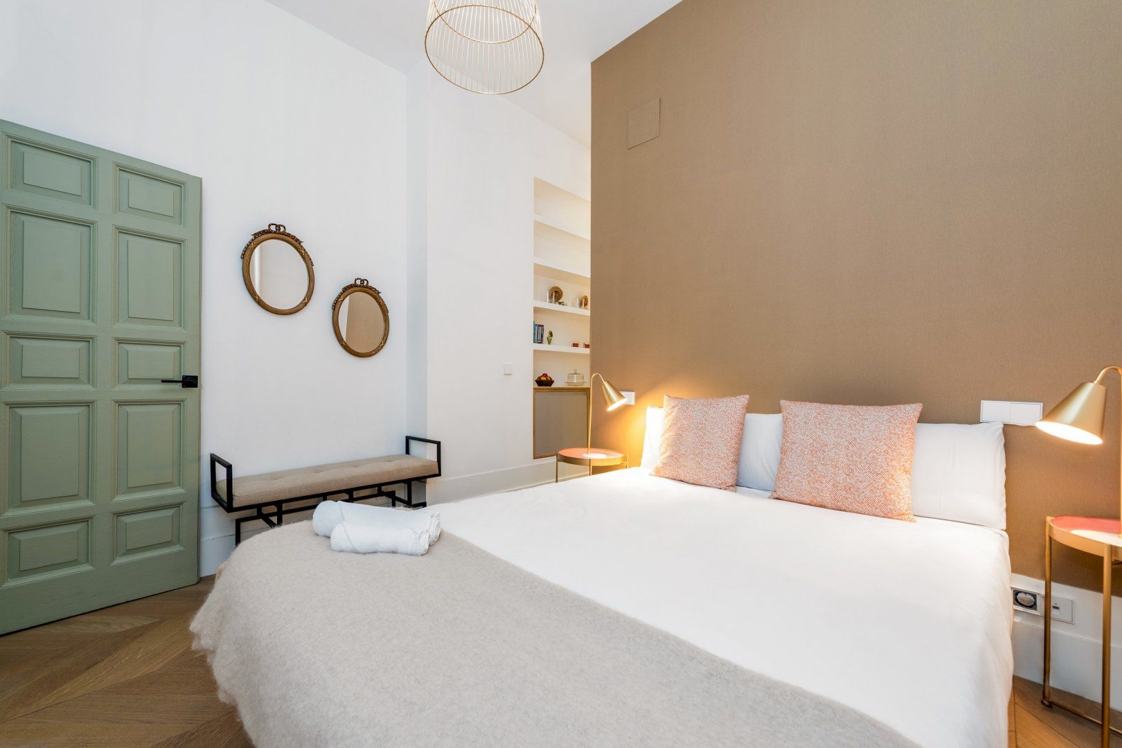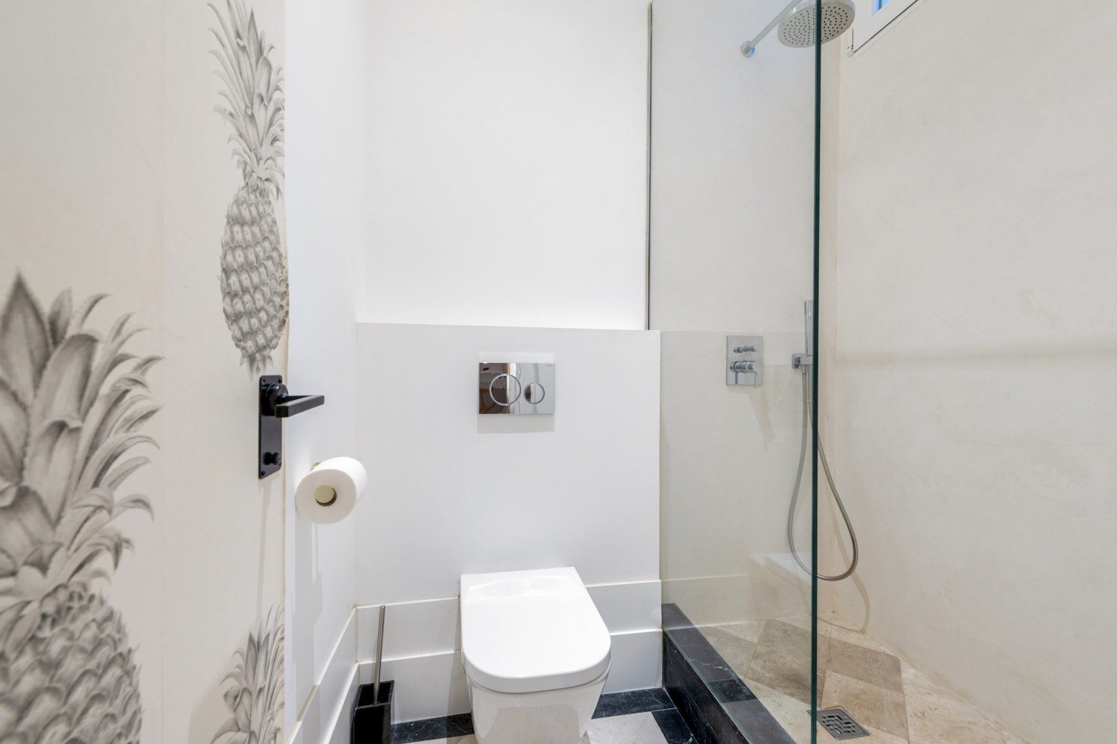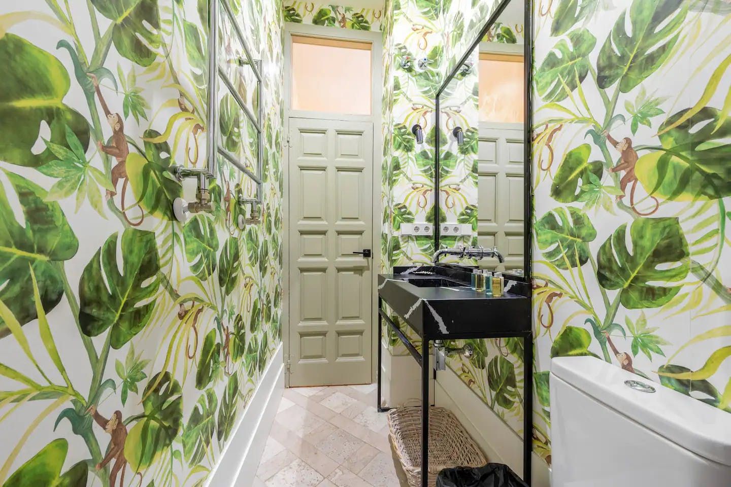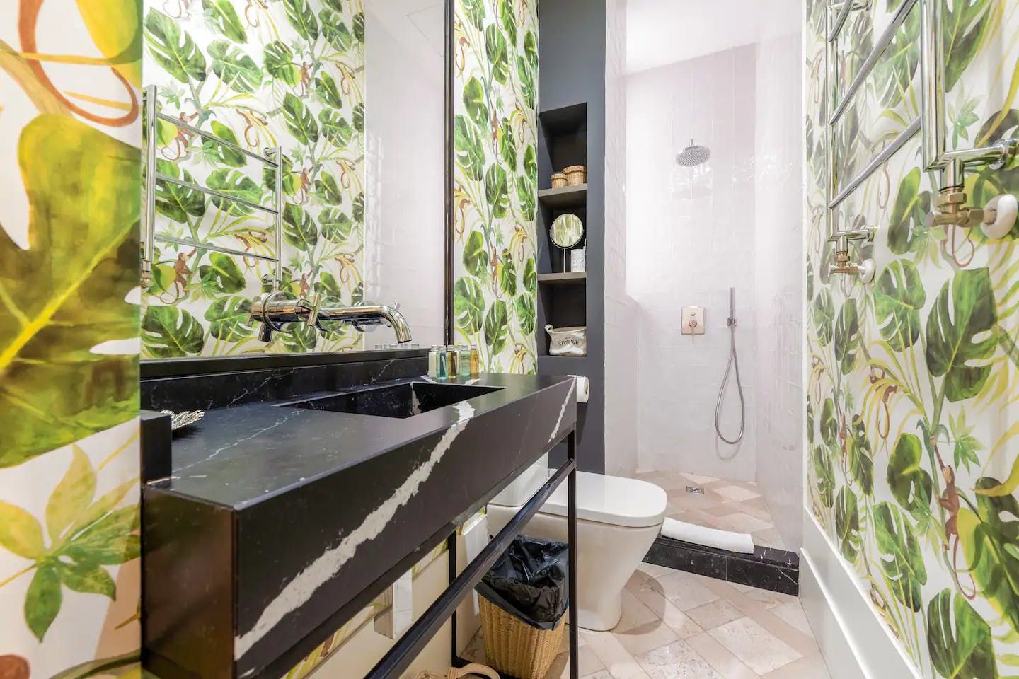 Or, if you're partial to homecooked meals, make your way back to this stylish flat and rustle up something tasty in the kitchen. It has everything you'll need – a large island, built-in appliances and plenty of counter space. The rest of the flat is impeccable, too – two glossy bathrooms (one decked out with bold palm leaf wallpaper, another en-suite) feature rainfall showers, the comfortable bedrooms are cosy and pared-back and the bright living area boats a squishy sofa and a lovely Juliet balcony that floods the room with light. We think you'll love calling this apartment home, whether you're in town for a few days or a few weeks.
