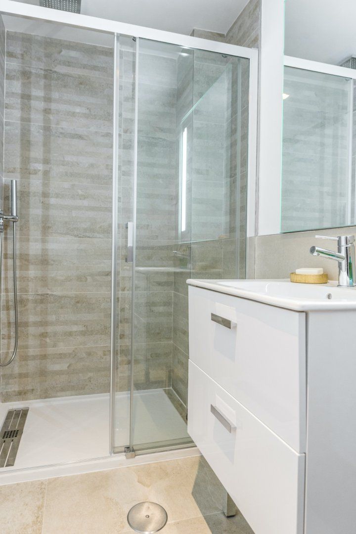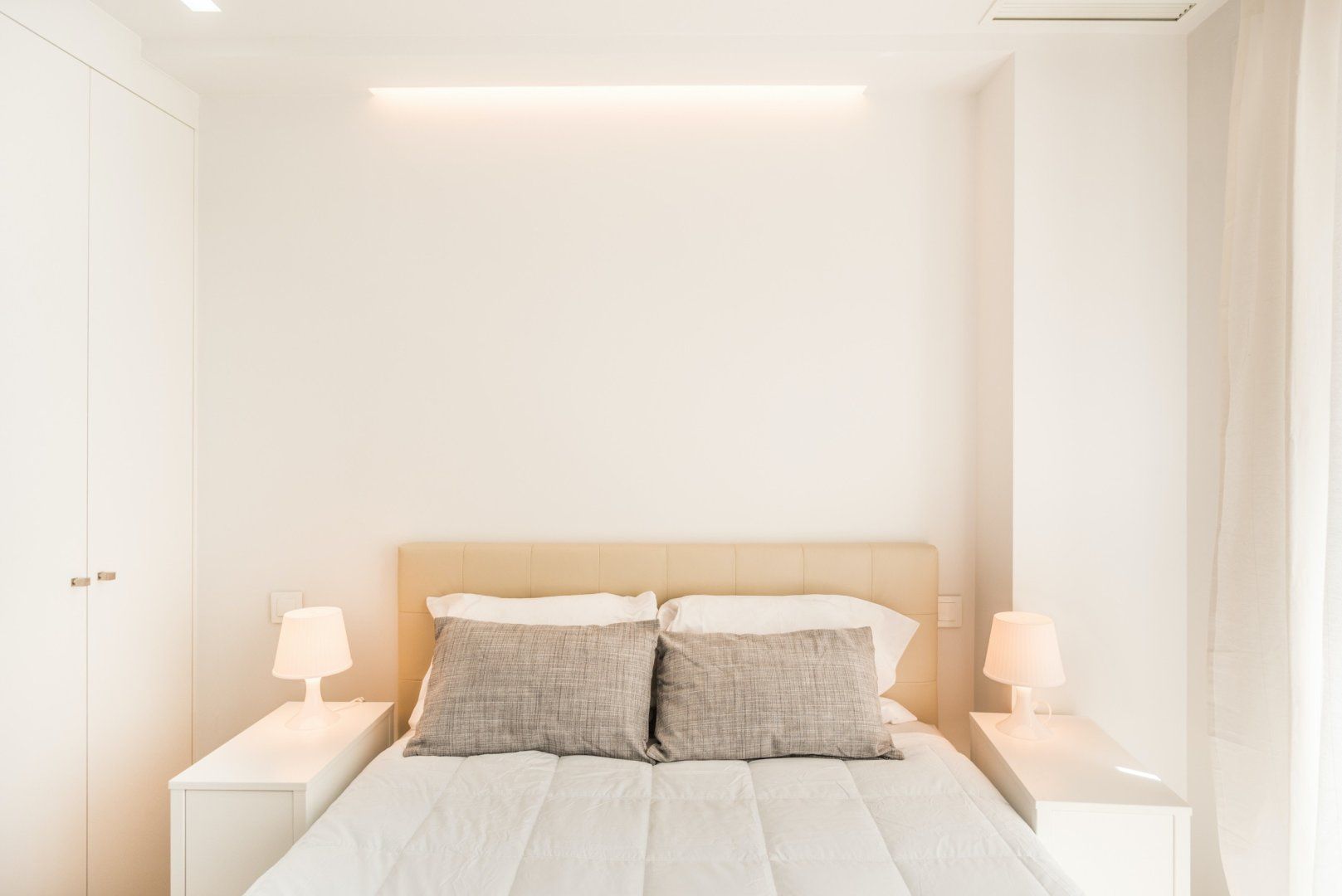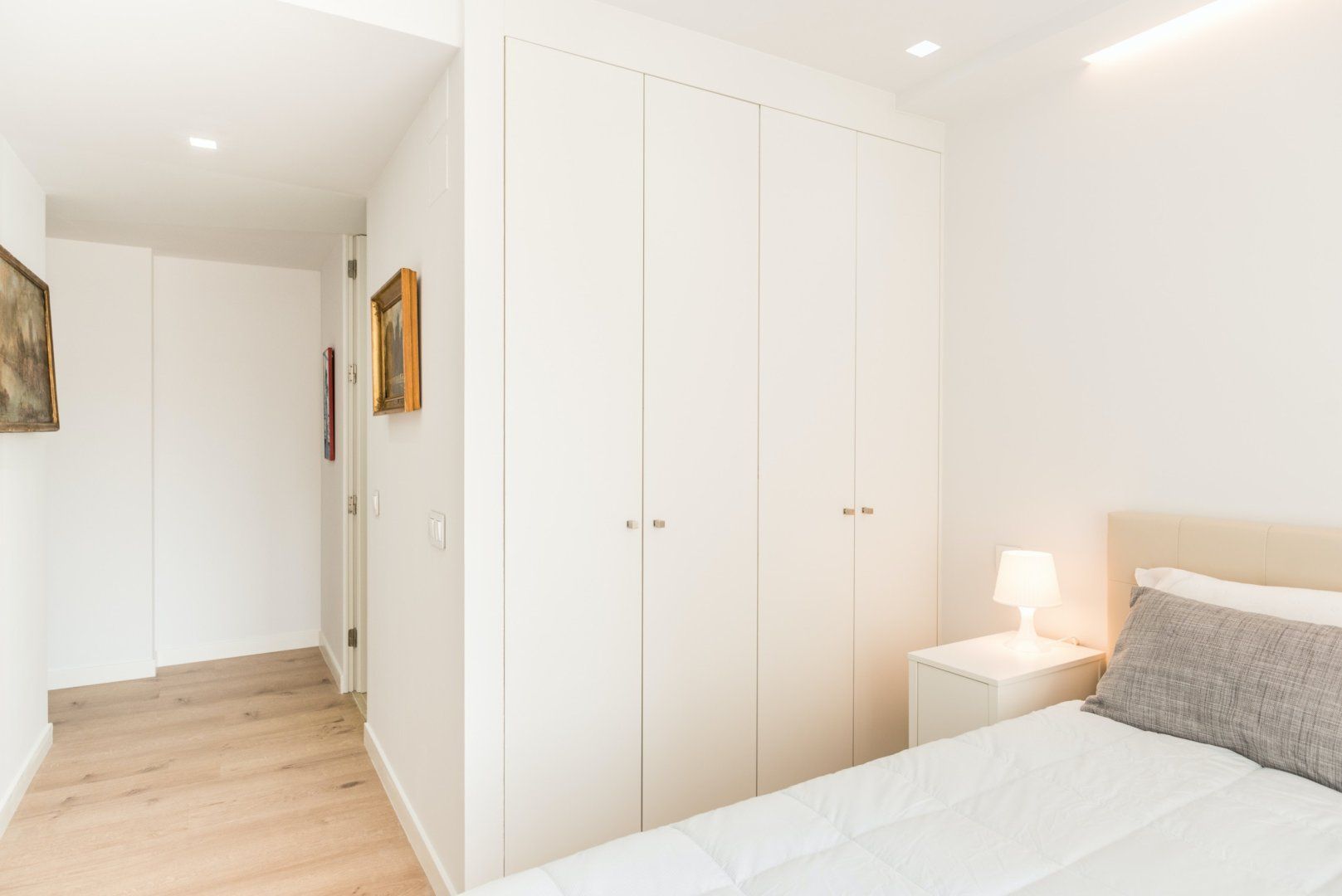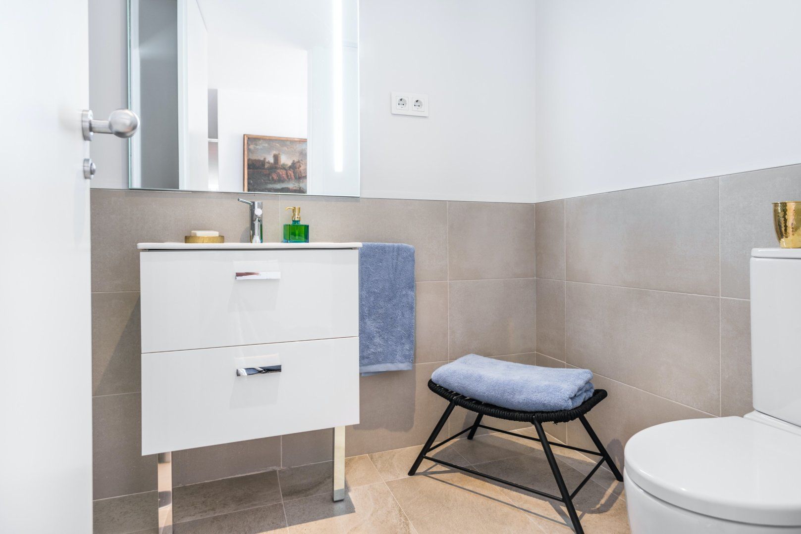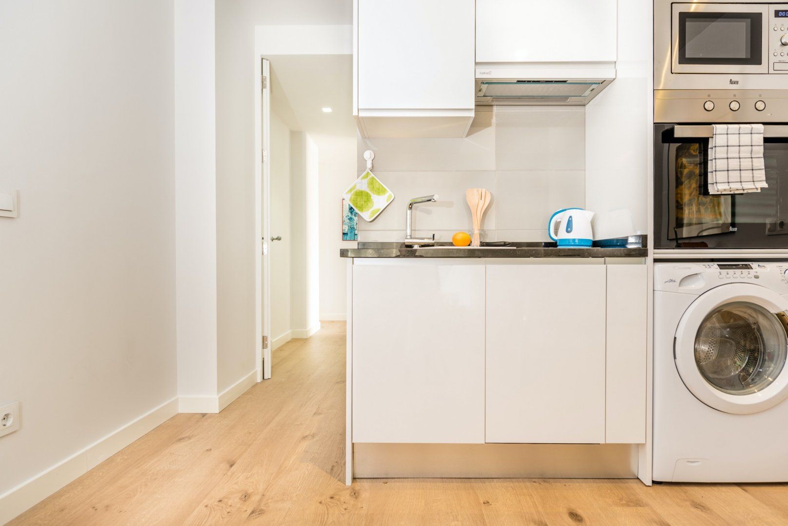 Wood floors, bright white walls and contemporary furnishings make a cheerful welcome in the open-plan living area. Unwind on the comfy sectional sofa with a glass of Spanish wine and gather for a celebratory meal at the glass dining table with its multicoloured seats.