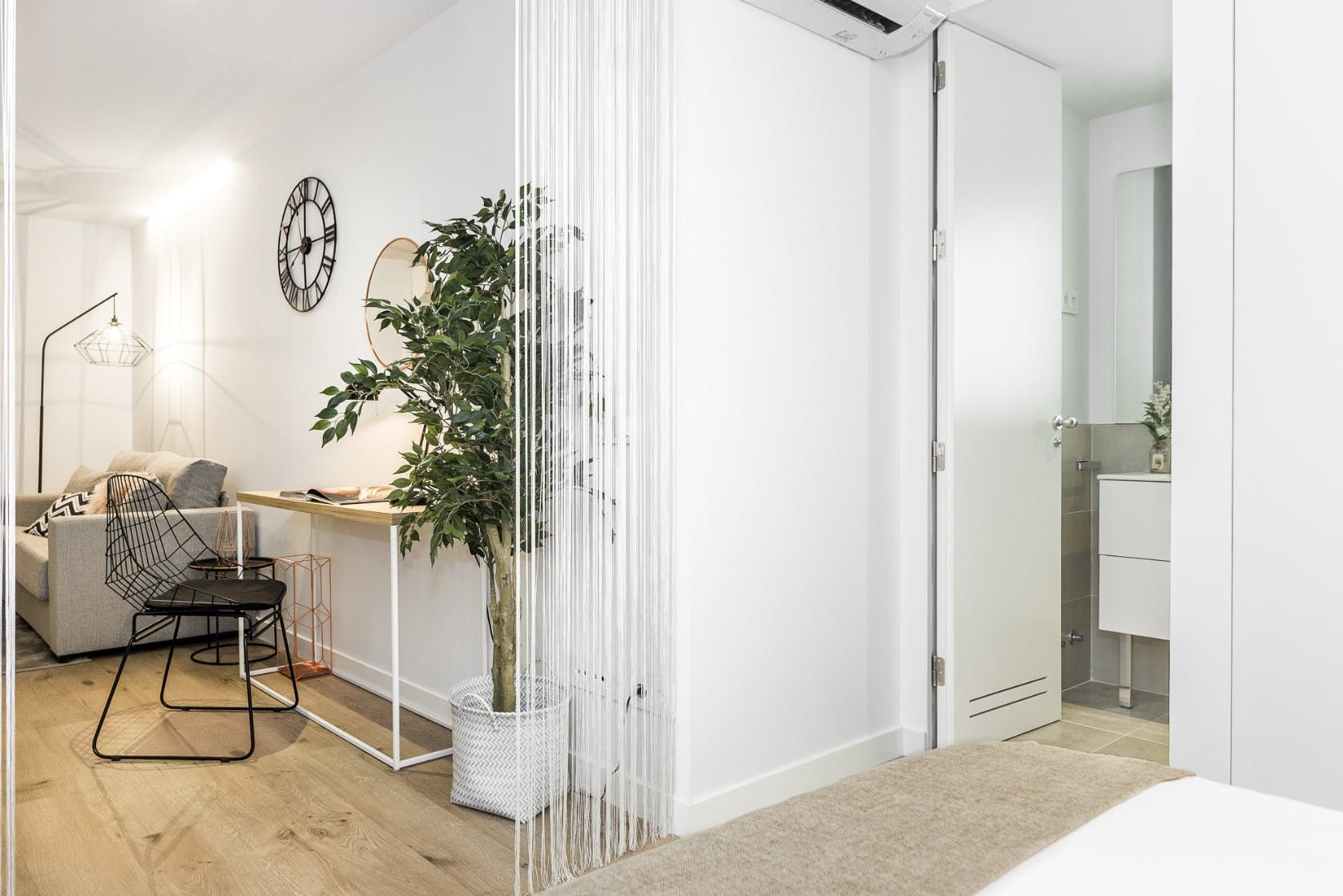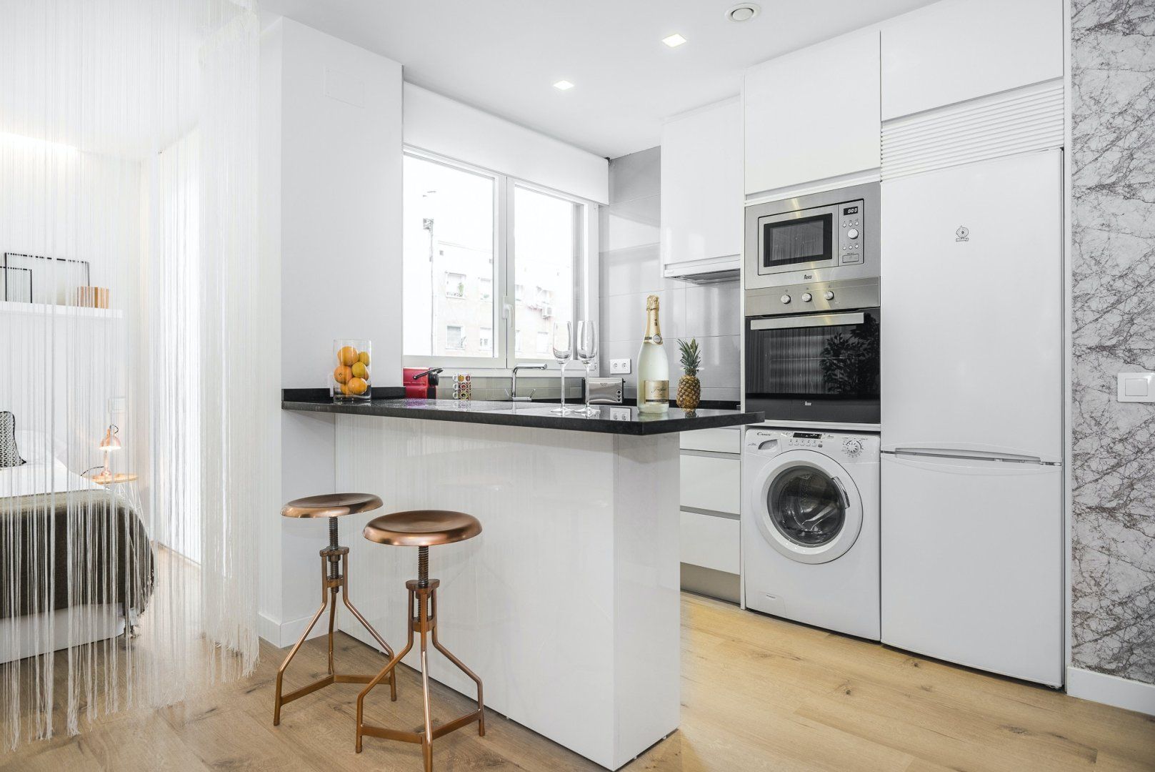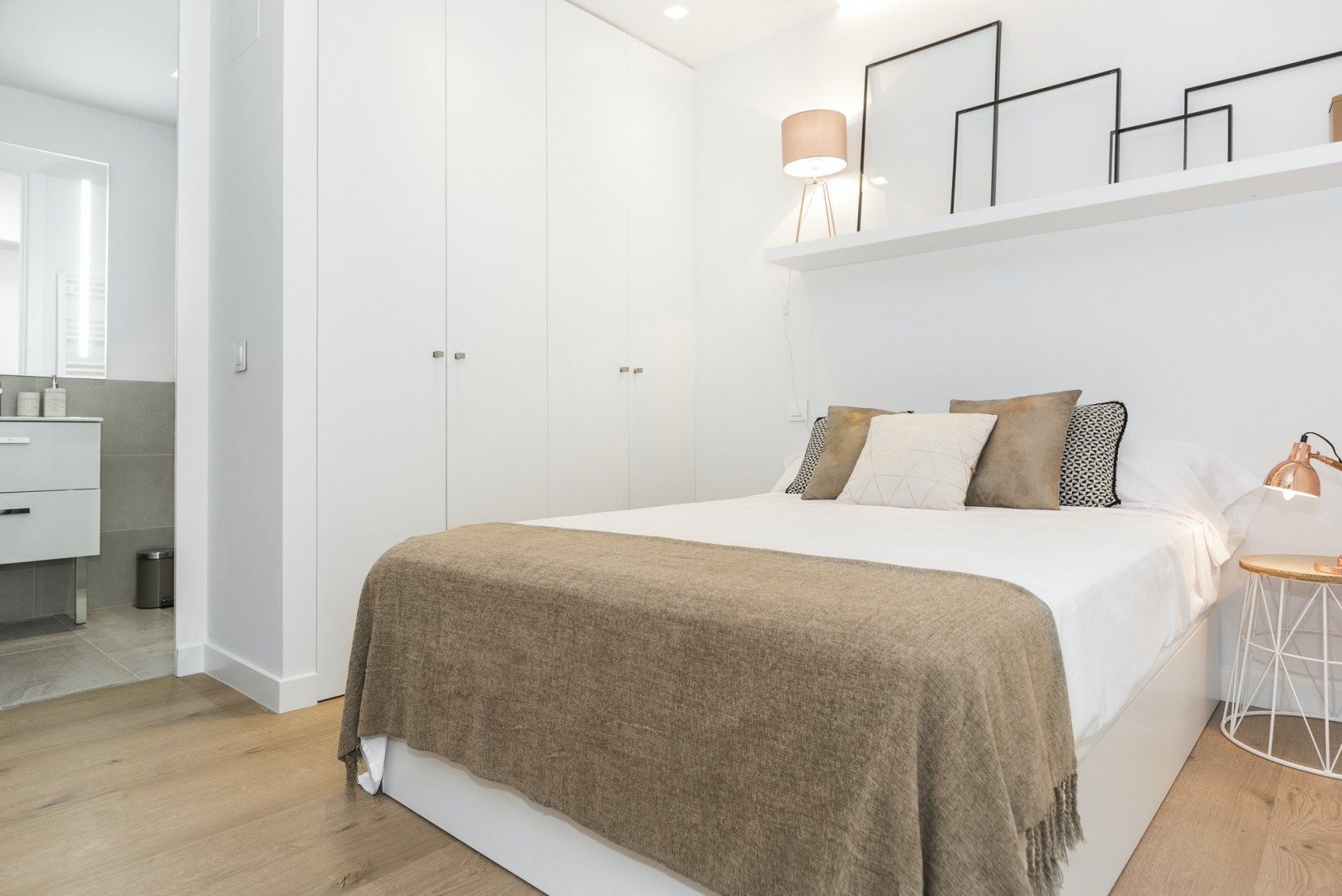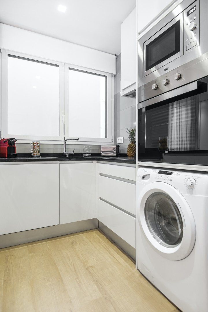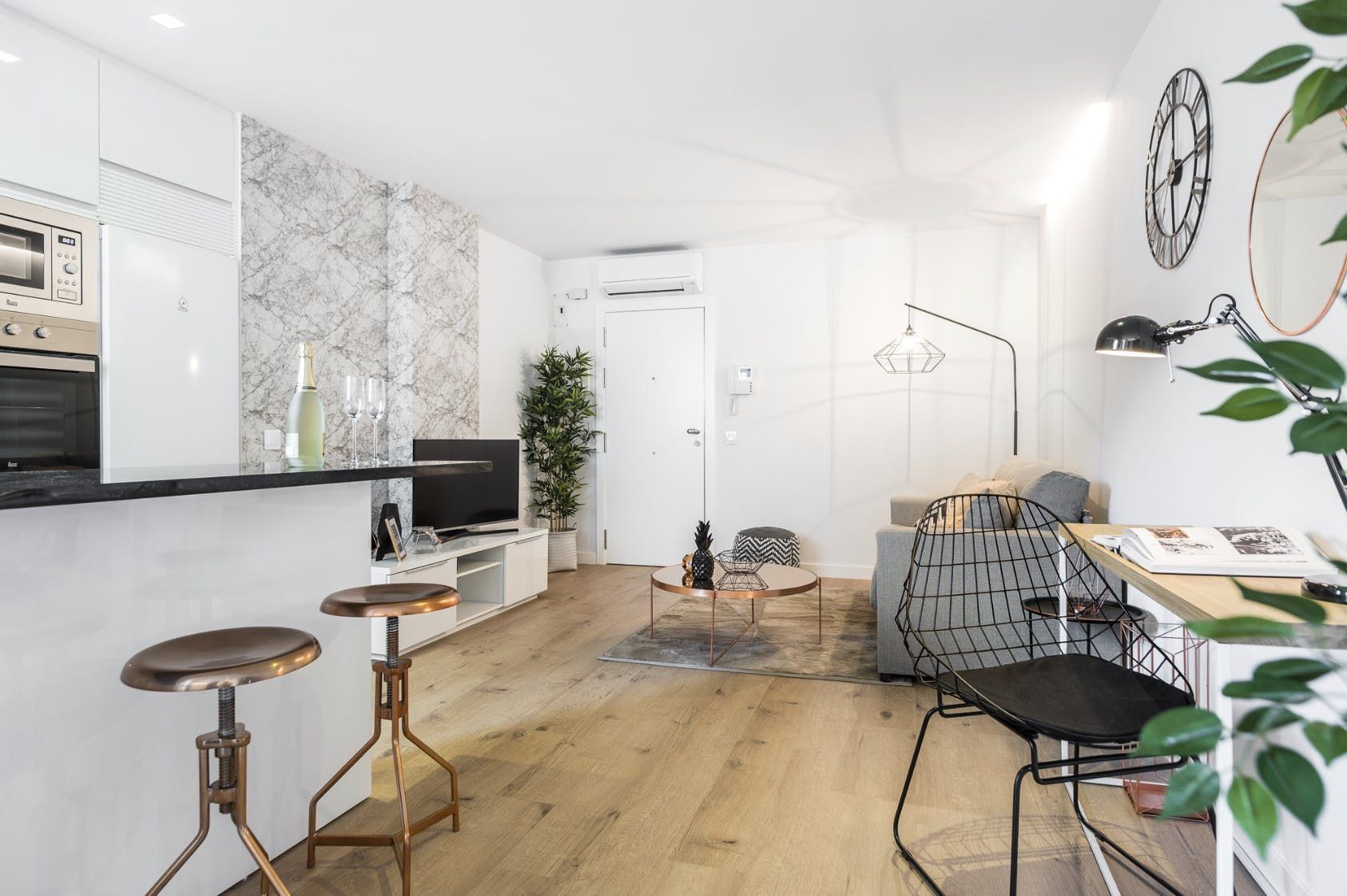 Wood floors, contemporary furnishings and a glossy white finish create a strikingly fashionable welcome in the open-plan living area. We love the carefully chosen ornaments that give the space plenty of character – like the shiny copper coffee table, the freestanding lamp, as well as the assortment of throw pillows on the plump sofa. Kick back with a glass of Spanish wine after a long day of sightseeing, or if you have work to catch up on, you’ll find a desk space here ready to make working from home a breeze.