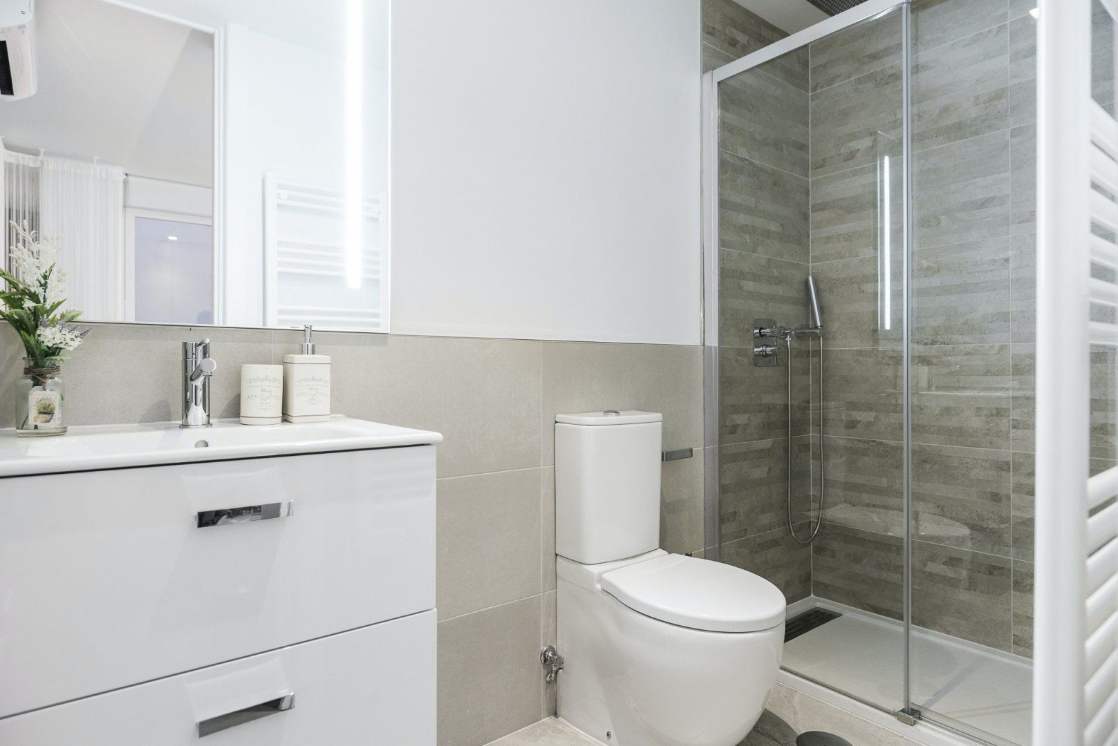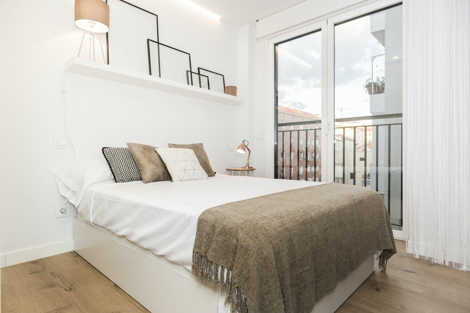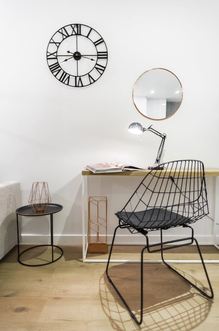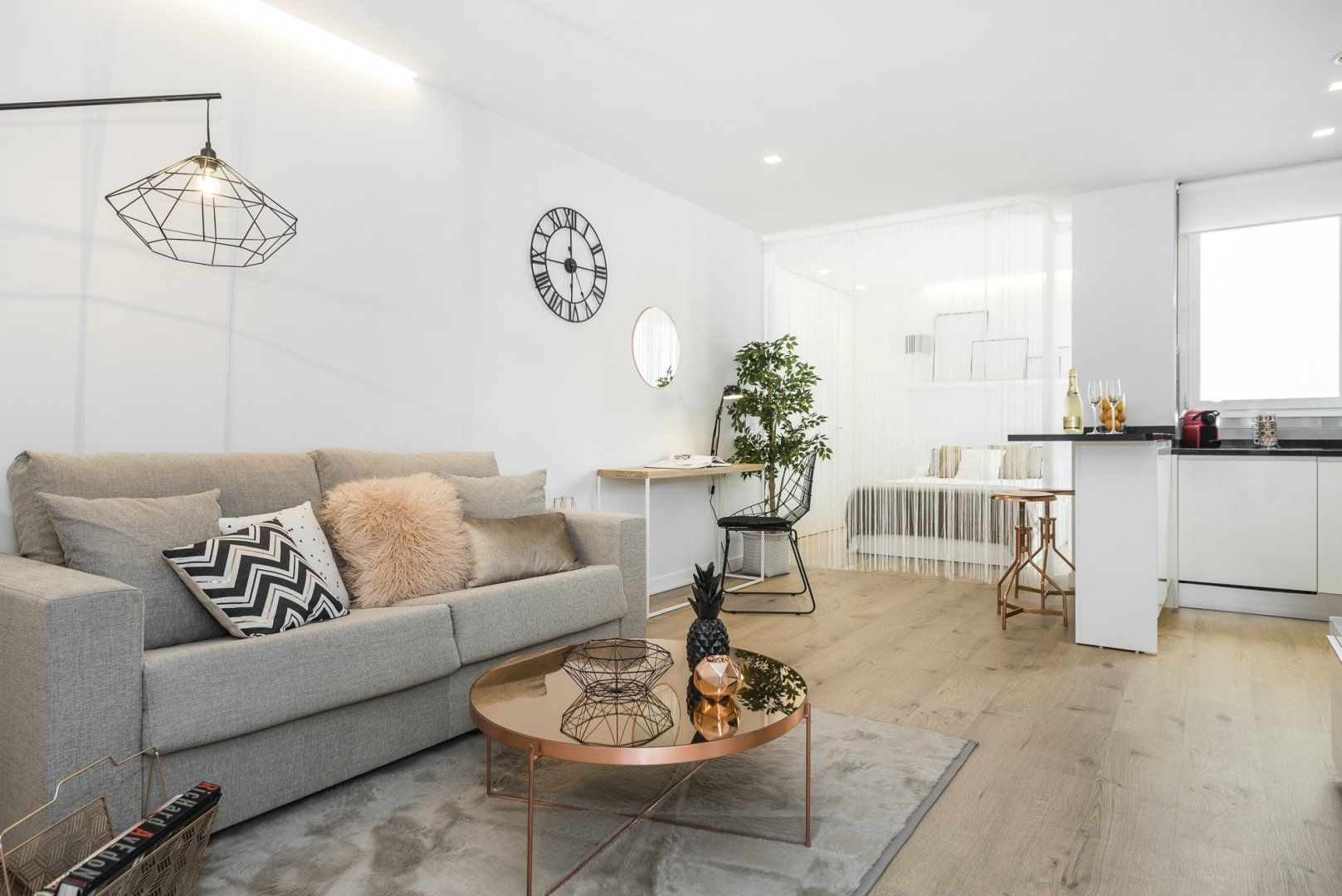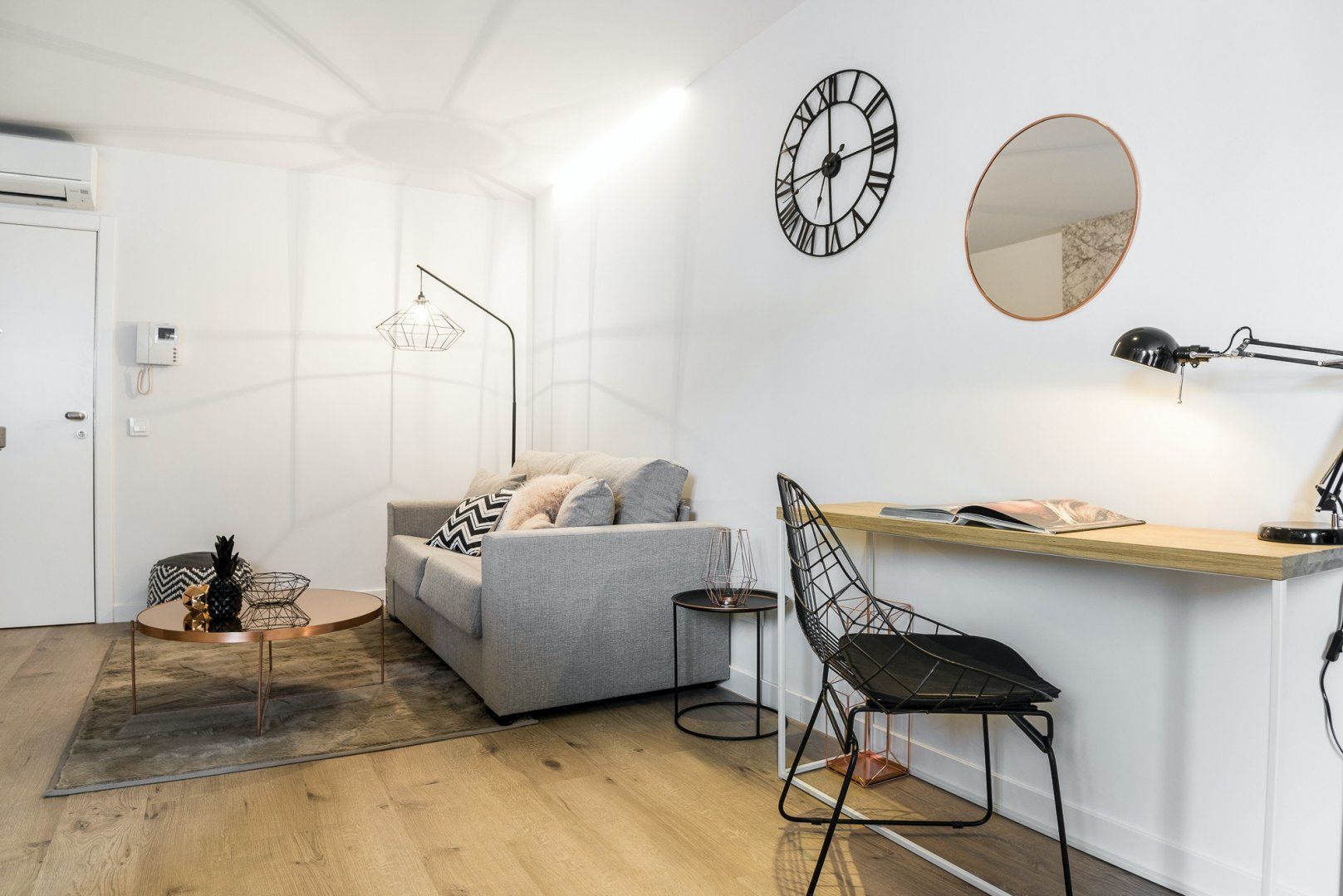 Wood floors, contemporary furnishings and a glossy white finish create a strikingly fashionable welcome in the open-plan living area. We love the carefully chosen ornaments that give the space plenty of character – like the shiny copper coffee table, the freestanding lamp, as well as the assortment of throw pillows on the plump sofa. Kick back with a glass of Spanish wine after a long day of sightseeing, or if you have work to catch up on, you’ll find a desk space here ready to make working from home a breeze.