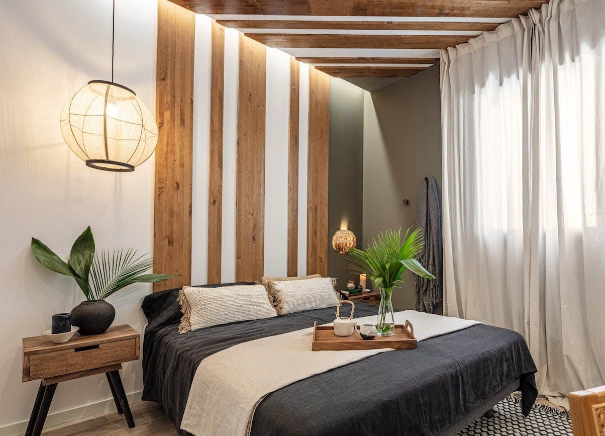 There's a natural theme running throughout this home’s design aesthetic – an ivory colour scheme, eucalyptus-toned accent walls, jute textures, wooden furnishings and tropical house plants all come together to create an inner city oasis. The living space is the perfect spot to unwind after a day exploring Real Jardin Botanico and El Retiro Park – pop a vinyl on the record player and sip a glass of orange wine for a special night in with your loved ones. There are two elegant workspaces primed for productivity so you can catch up on projects eagerly before stepping outside for a well-earned vermouth on the rocks at one of the neighbourhood’s charming tapas bars and order some croquetas de jamón Serrano – you’ll be living like a true Madrileño.