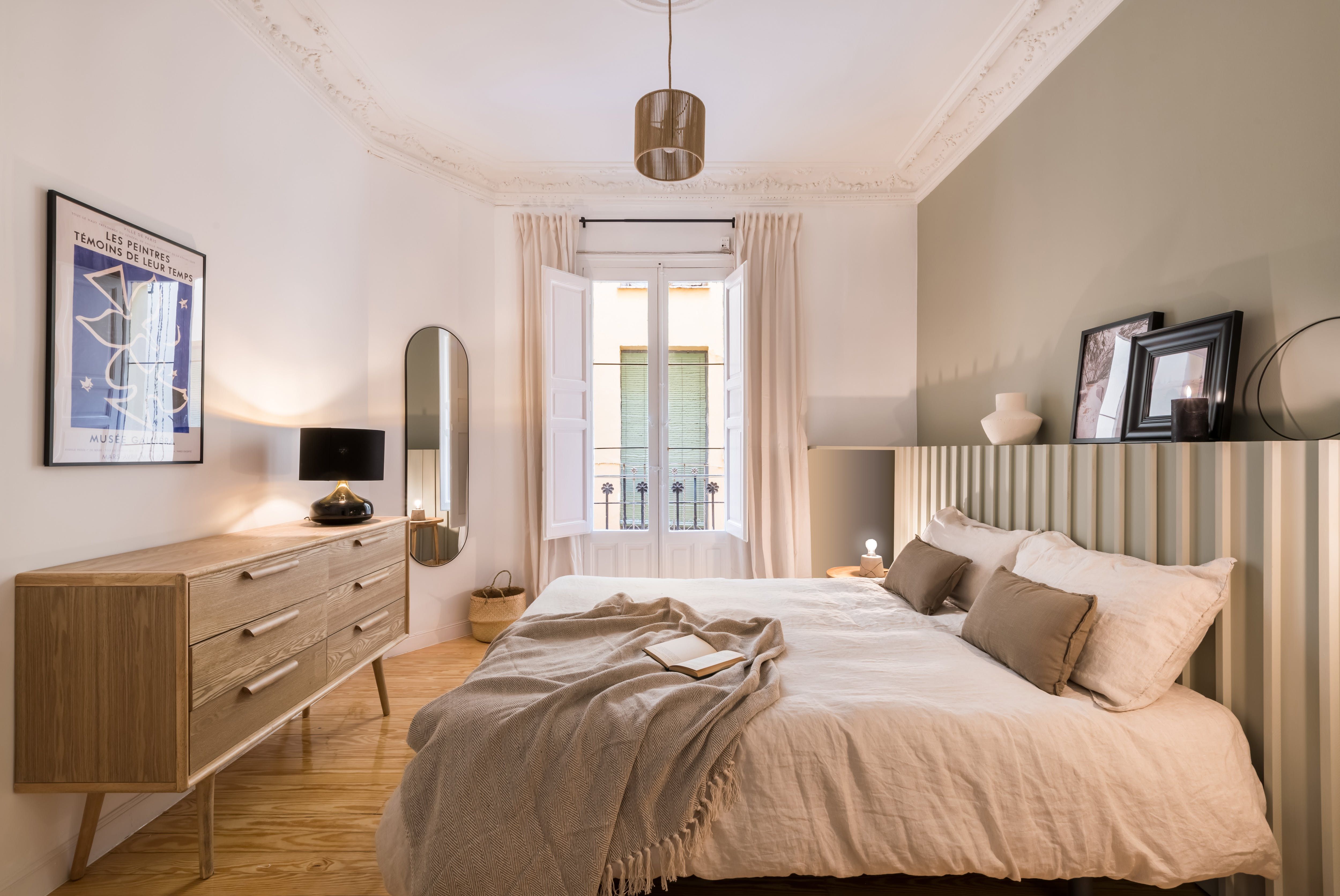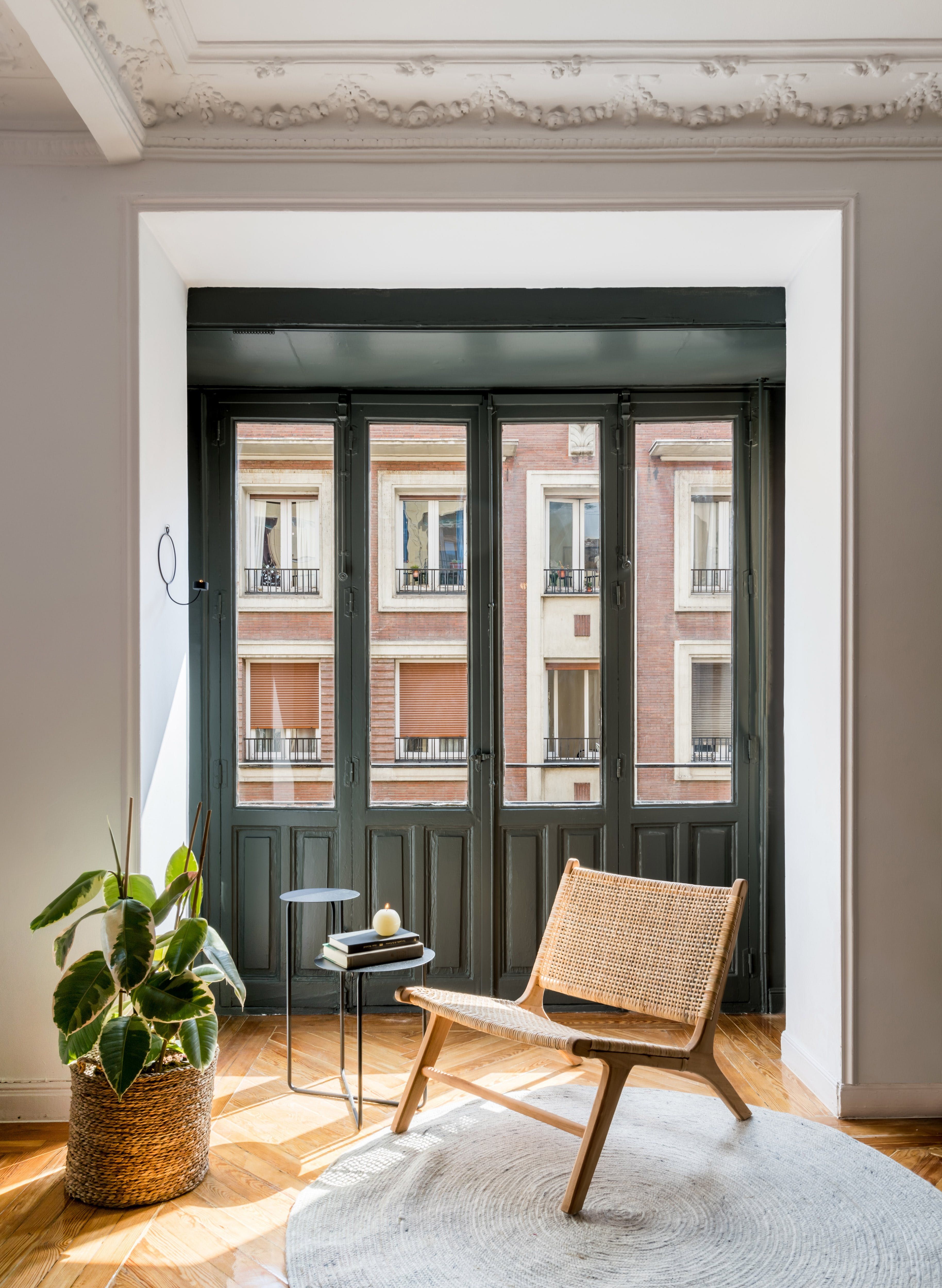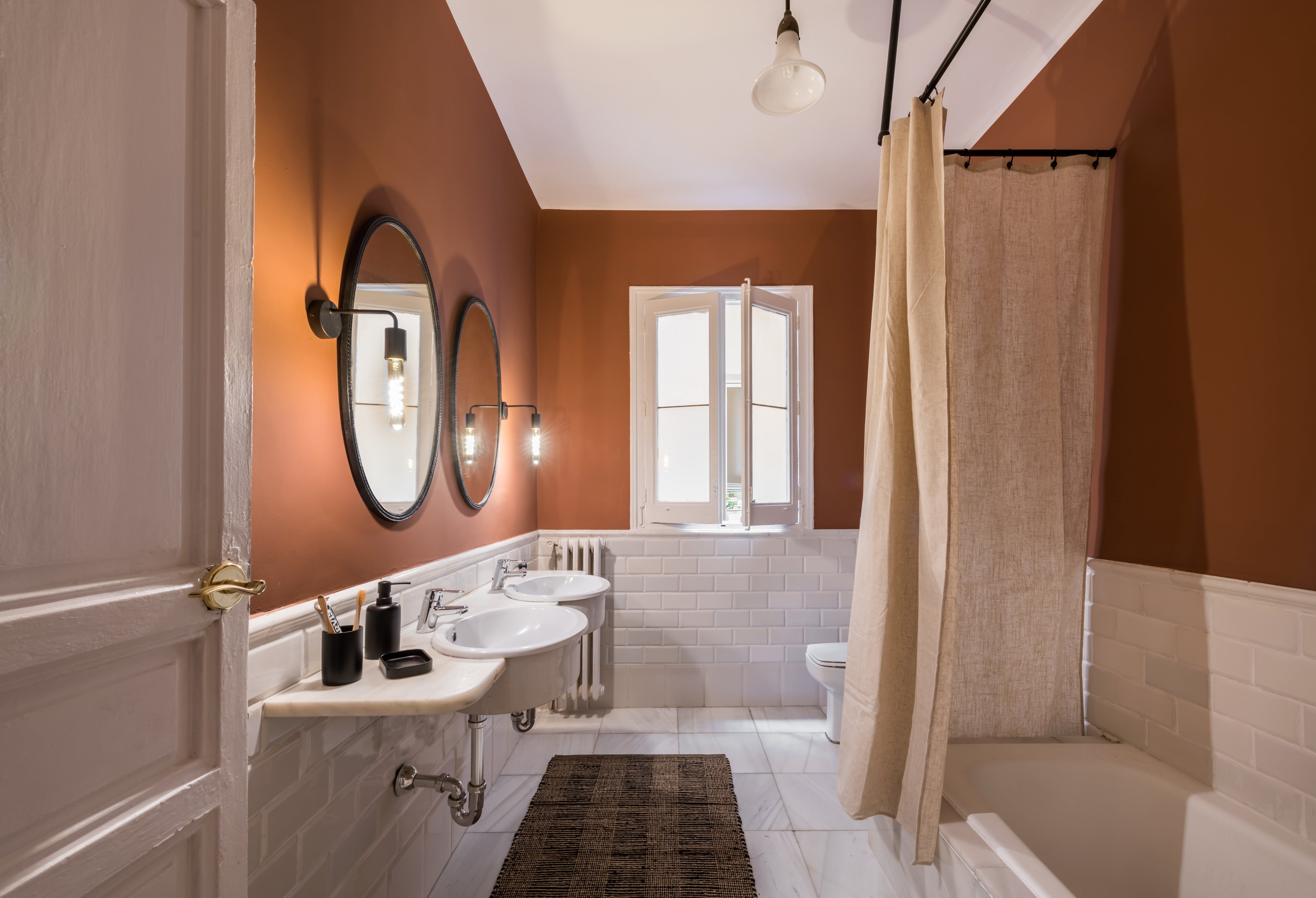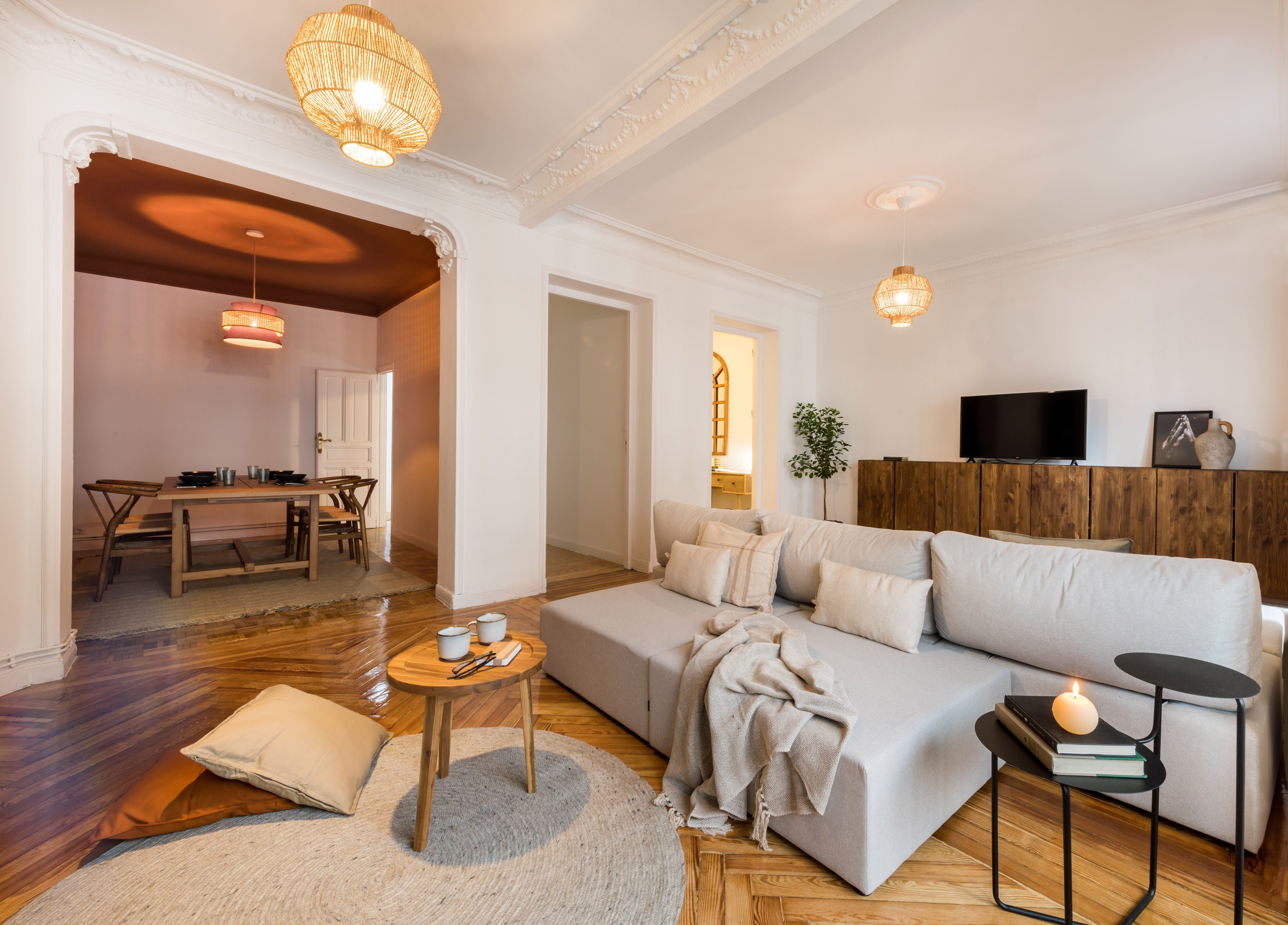 Step into a world of old-school elegance and modern design at this stunning apartment in Madrid’s stylish Salamanca neighbourhood. Inspired by the landscapes of Calabrian vineyards, this home’s main living space is large and bright with tall corniced ceilings and earthy tones giving it a soothing, welcoming feel. We love the dual-facing sofa in the centre of the room, and the large green shelves that match the French doors leading out onto a beautiful Juliet balcony. Soak up some rays on the perfectly positioned seat here, either sipping on your morning coffee with a good book or enjoying the sunset with a glass of wine. You’ll relish gathering together in the grand burgundy-coloured dining room with its wooden dining table and feasting on homemade tapas made in the pretty tiled kitchen. With a separate office as well as a dressing room, you’re all set whether you’re getting ready to work or to go out on the town, while the two bedrooms dazzle with a delicate bohemian softness that provides the ideal canvas for a dreamy night’s sleep. Factor in the gorgeous terracotta-coloured bathroom with its bathtub – the perfect way to end the night with a glass of bubbly – and you’ve got everything you need for a relaxing stay. Outside of your home, you’re a fifteen-minute walk from El Retiro Park, a thirty-minute stroll from Gran Vía’s shops and the Sorolla Museum is twenty-five minutes on foot from your door.