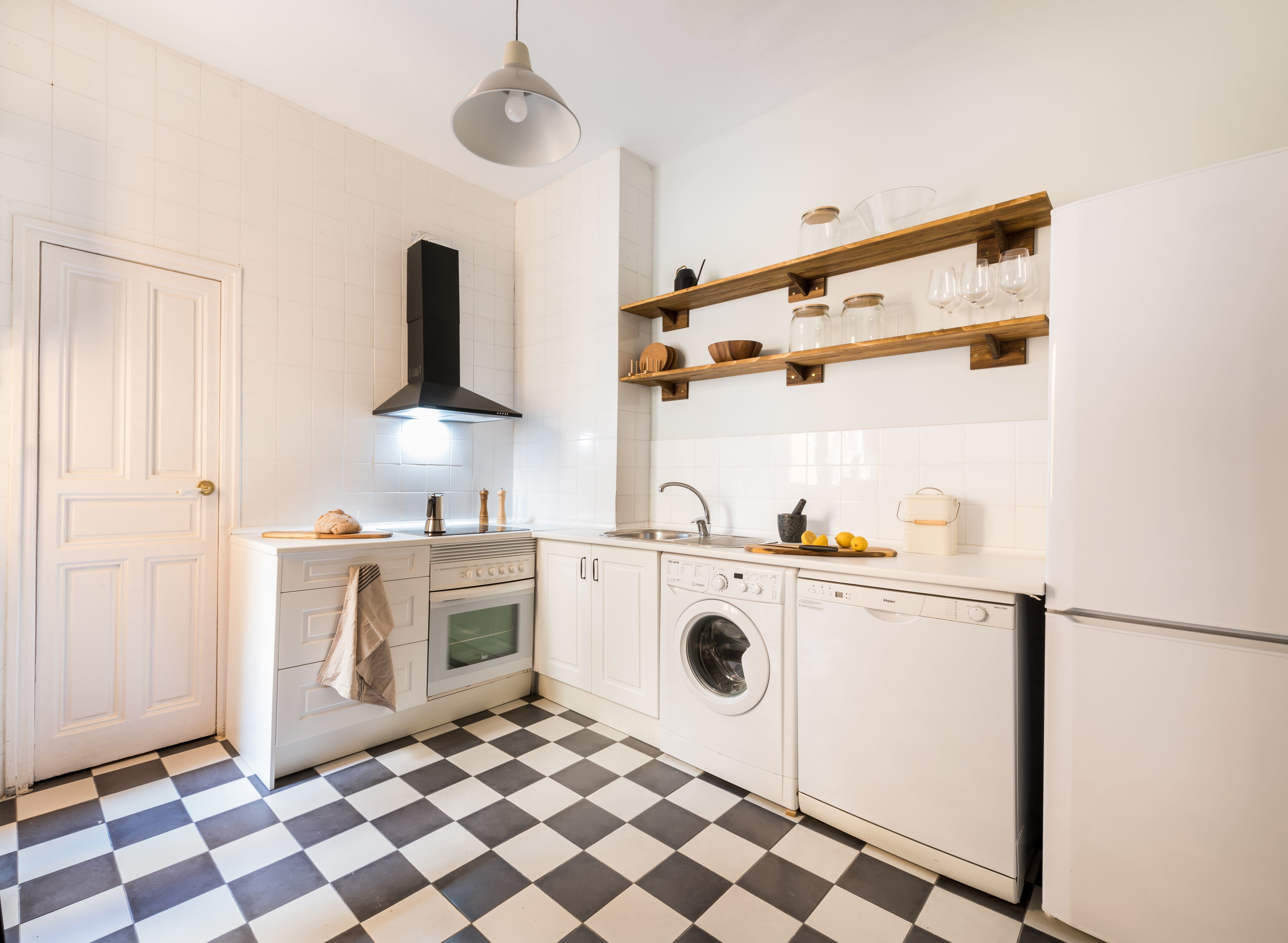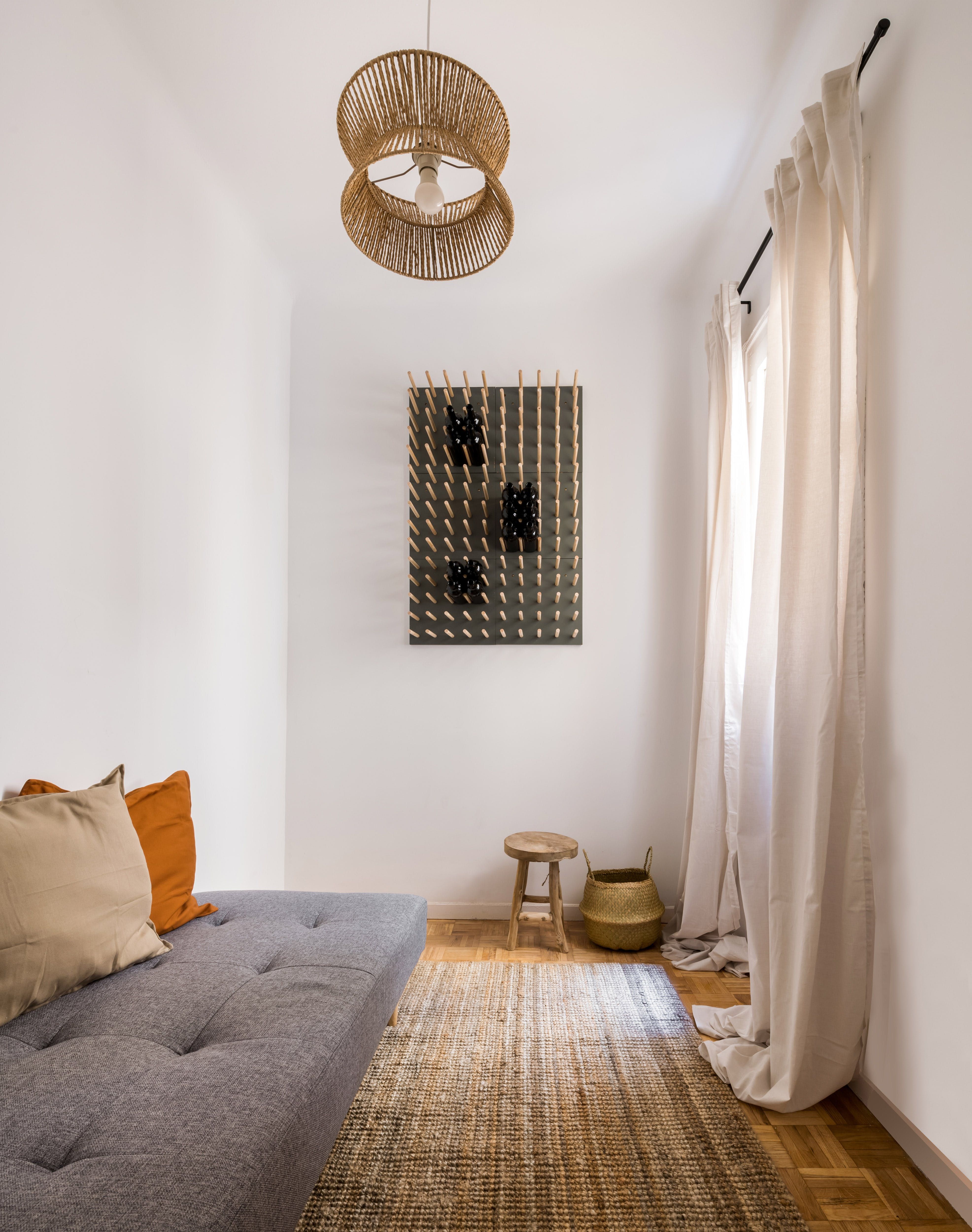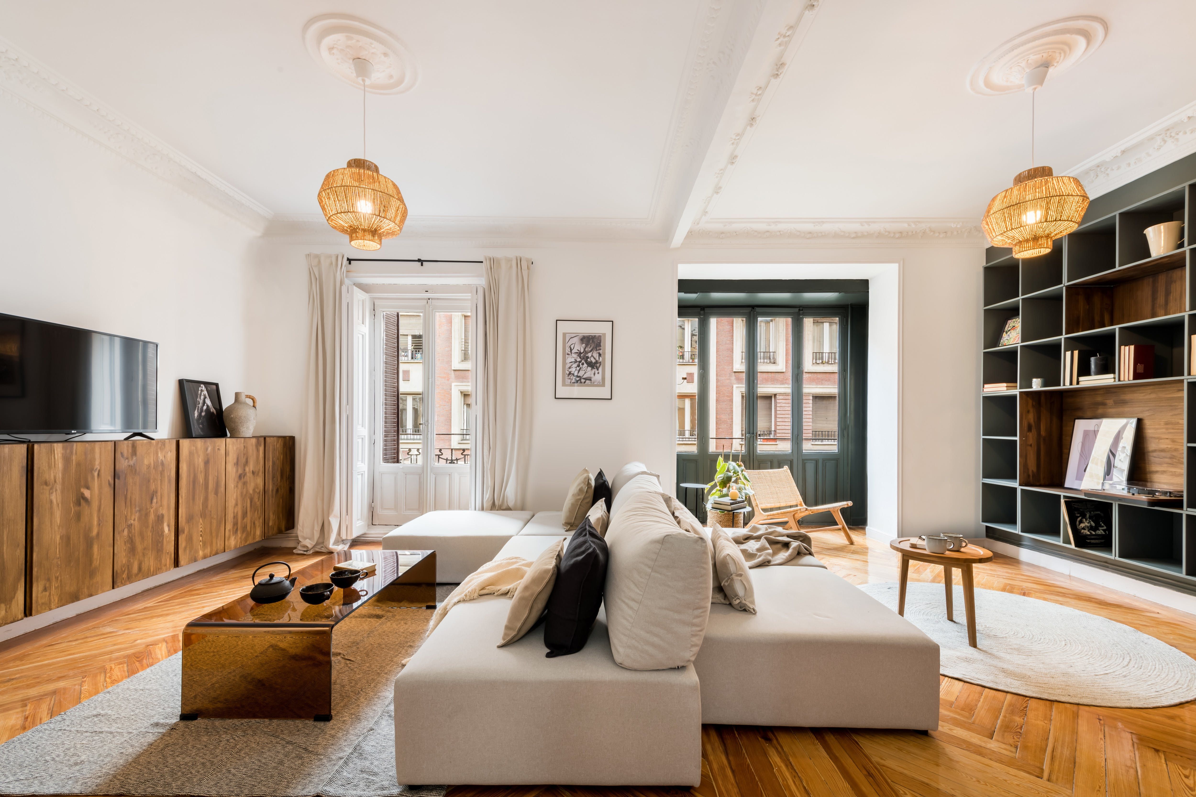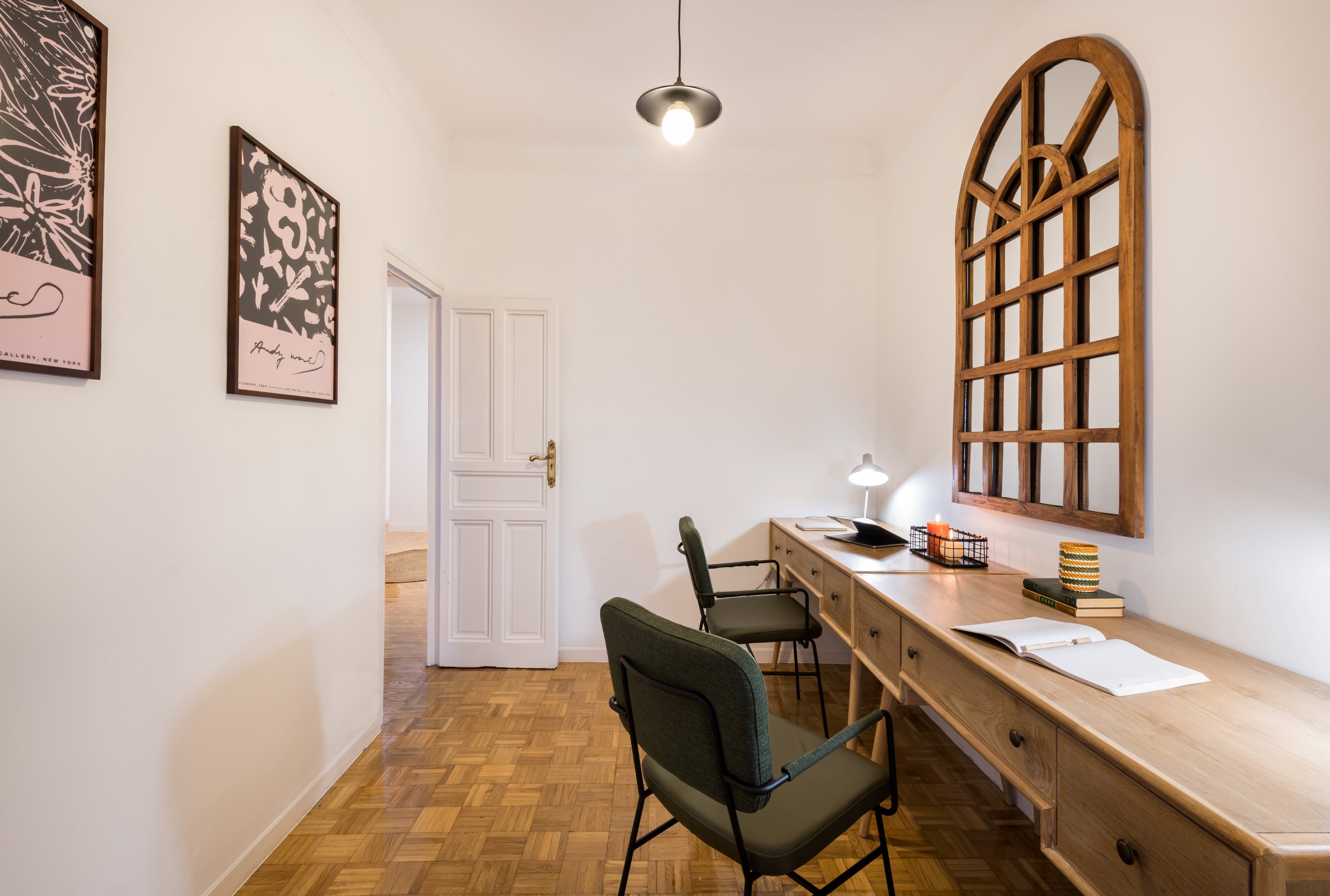 Step into a world of old-school elegance and modern design at this stunning apartment in Madrid’s stylish Salamanca neighbourhood. Inspired by the landscapes of Calabrian vineyards, this home’s main living space is large and bright with tall corniced ceilings and earthy tones giving it a soothing, welcoming feel. We love the dual-facing sofa in the centre of the room, and the large green shelves that match the French doors leading out onto a beautiful Juliet balcony. Soak up some rays on the perfectly positioned seat here, either sipping on your morning coffee with a good book or enjoying the sunset with a glass of wine. You’ll relish gathering together in the grand burgundy-coloured dining room with its wooden dining table and feasting on homemade tapas made in the pretty tiled kitchen. With a separate office as well as a dressing room, you’re all set whether you’re getting ready to work or to go out on the town, while the two bedrooms dazzle with a delicate bohemian softness that provides the ideal canvas for a dreamy night’s sleep. Factor in the gorgeous terracotta-coloured bathroom with its bathtub – the perfect way to end the night with a glass of bubbly – and you’ve got everything you need for a relaxing stay. Outside of your home, you’re a fifteen-minute walk from El Retiro Park, a thirty-minute stroll from Gran Vía’s shops and the Sorolla Museum is twenty-five minutes on foot from your door.