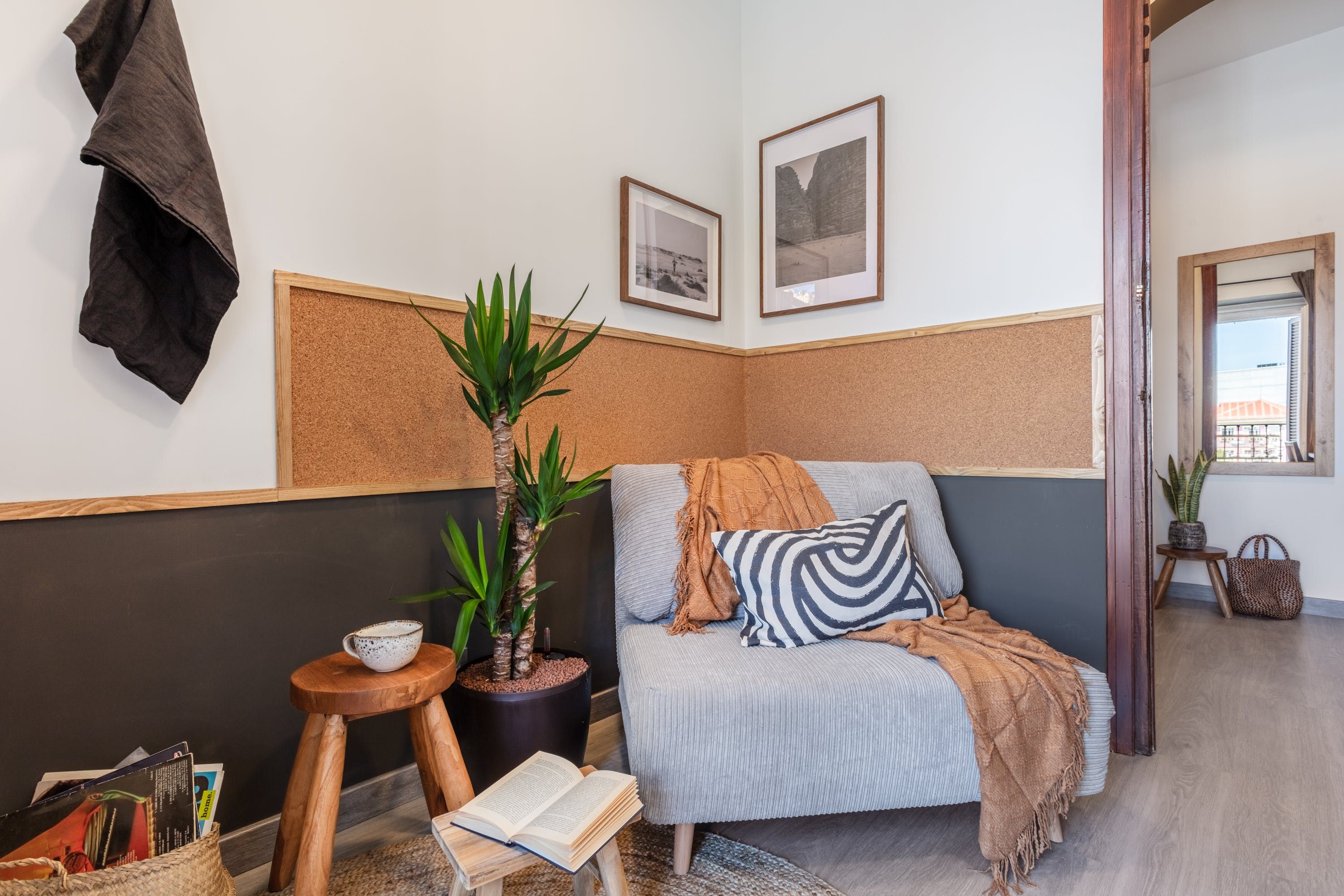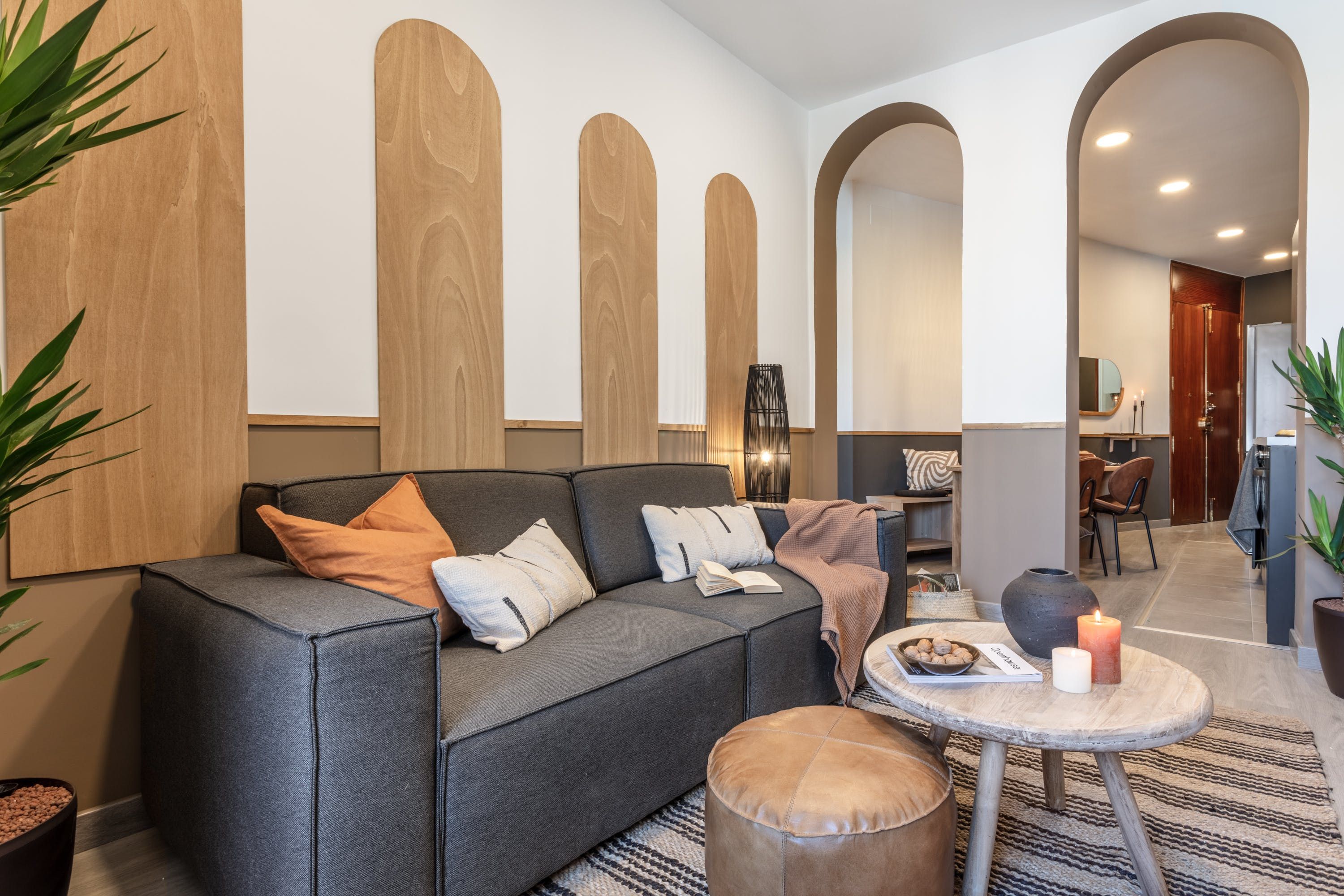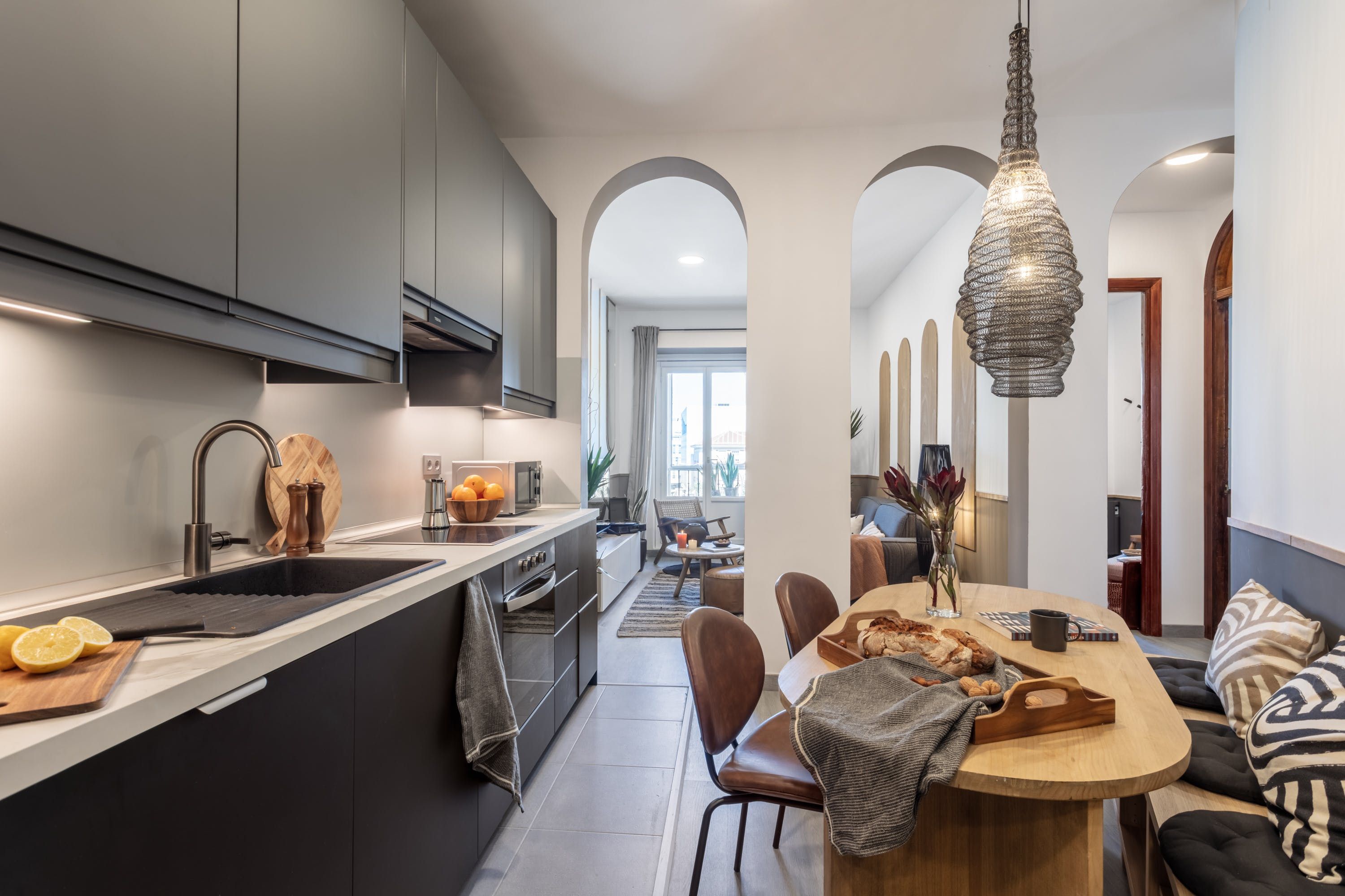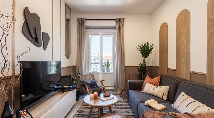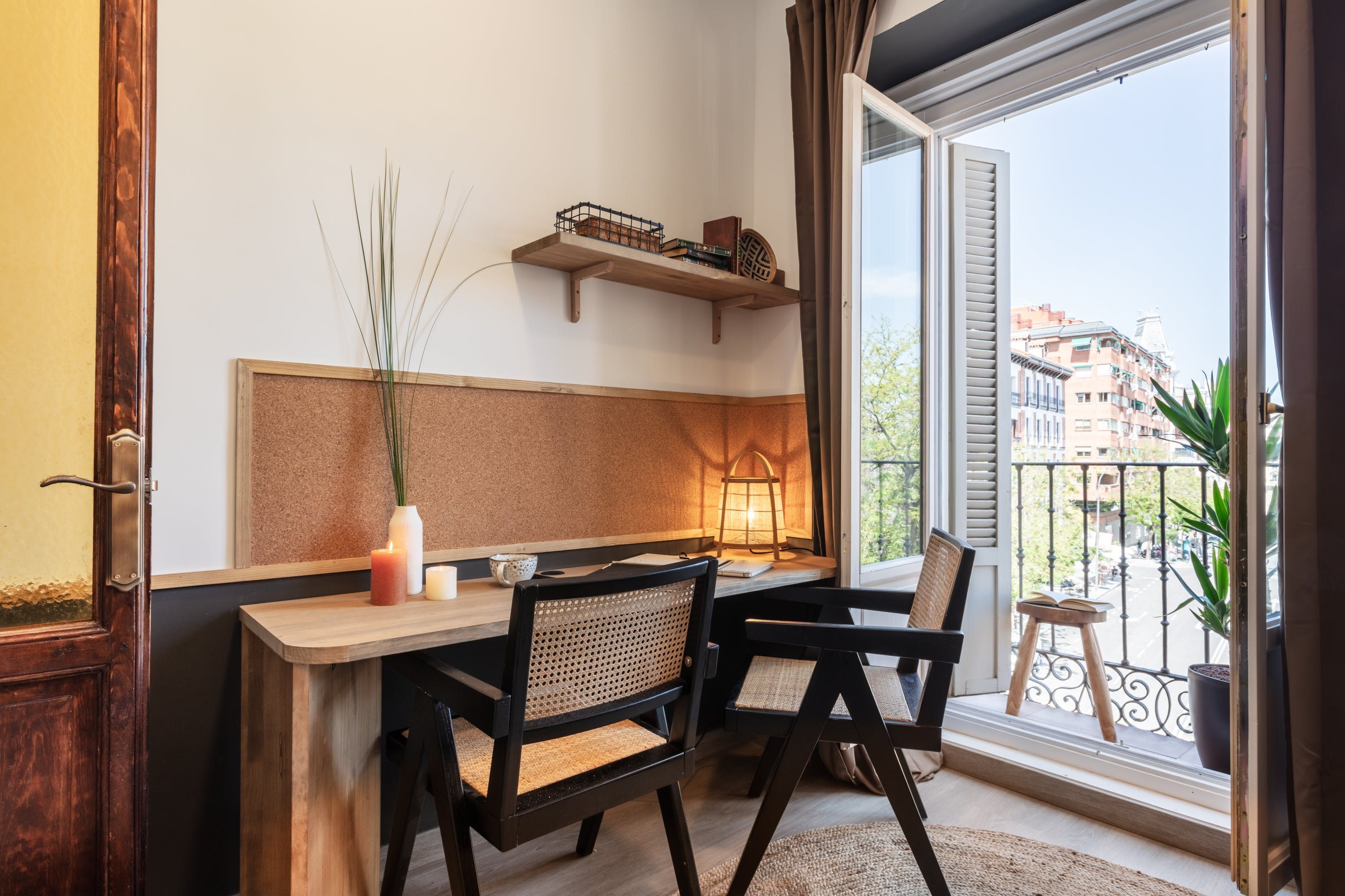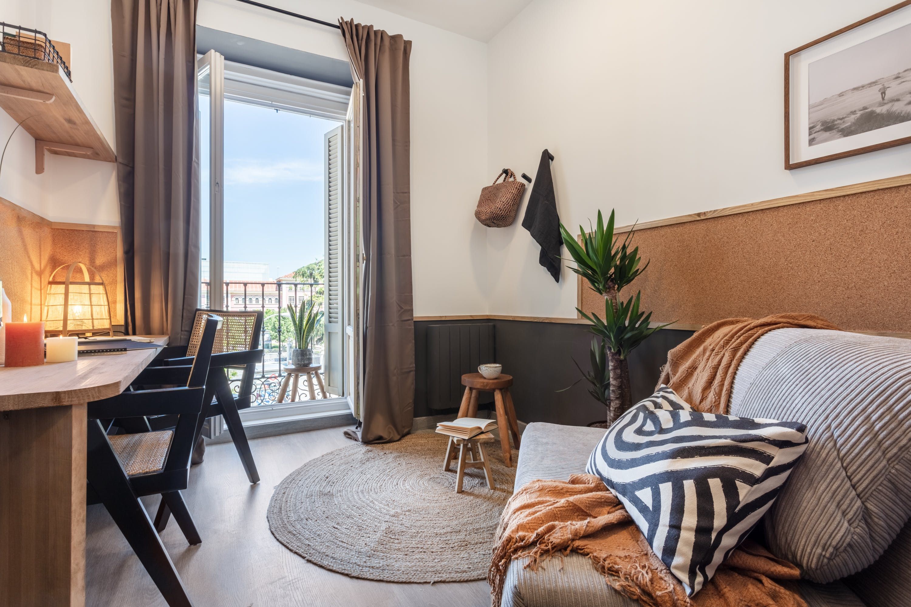 Remove yourself from the noise and bustle back home by stepping foot in this calming apartment made up of natural textiles, neutral tones and rattan furnishings in the heart of the Justicia District. We love the blend of modern design and old-world Saharan decor that makes for a zen and balanced space to kick back after a day of sightseeing. Curl up on the sofa with a good book, prepare meals in the marble-topped kitchen or keep an eye on work – there’s a dedicated desk for those who are visiting on business.