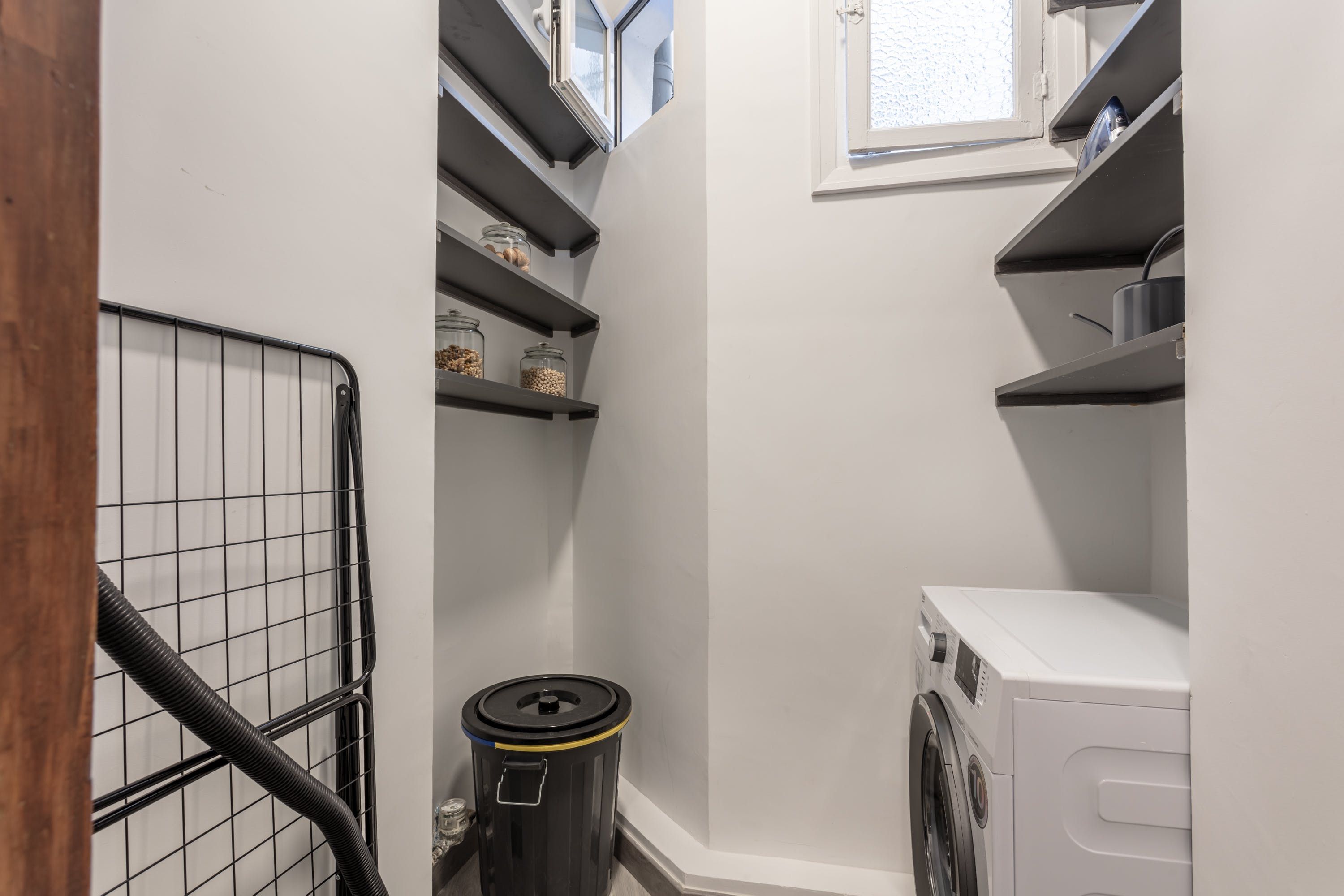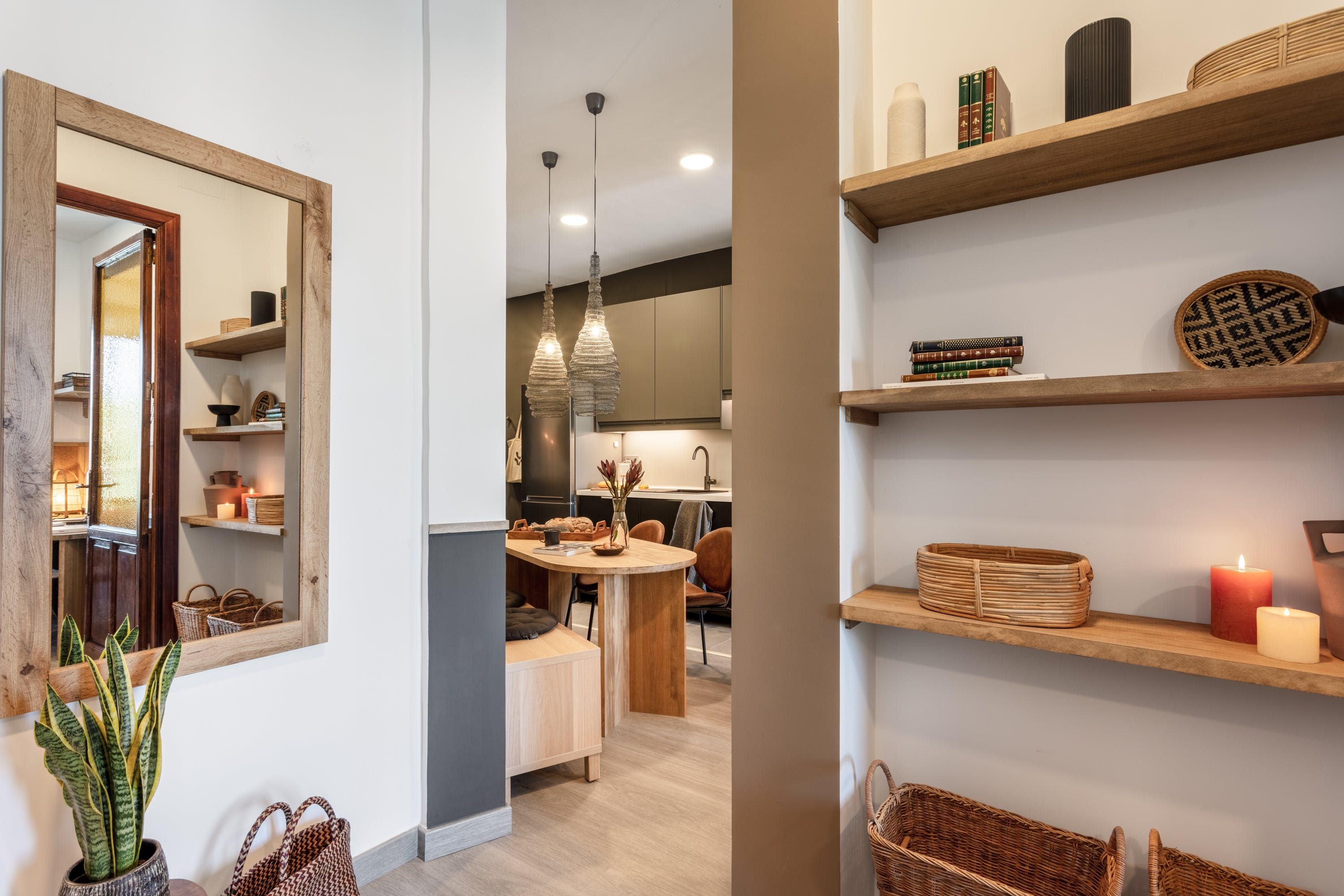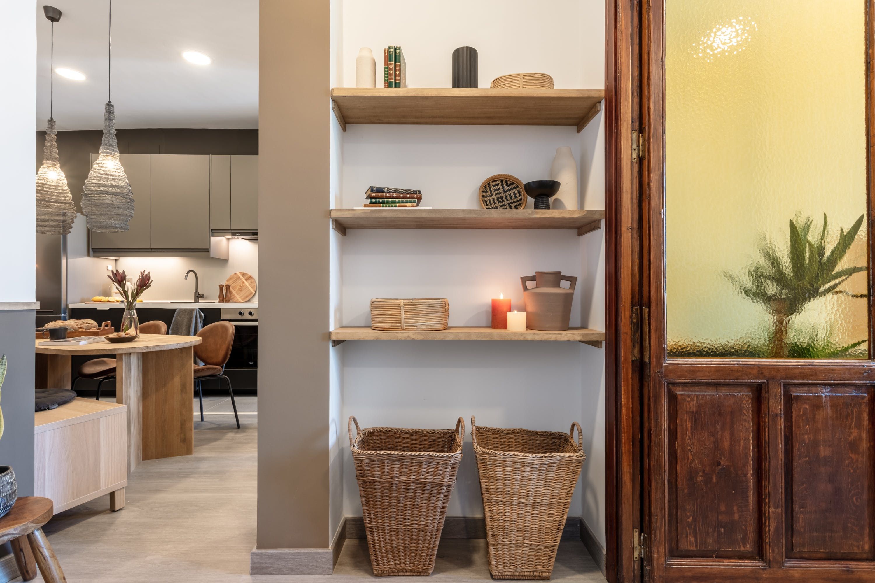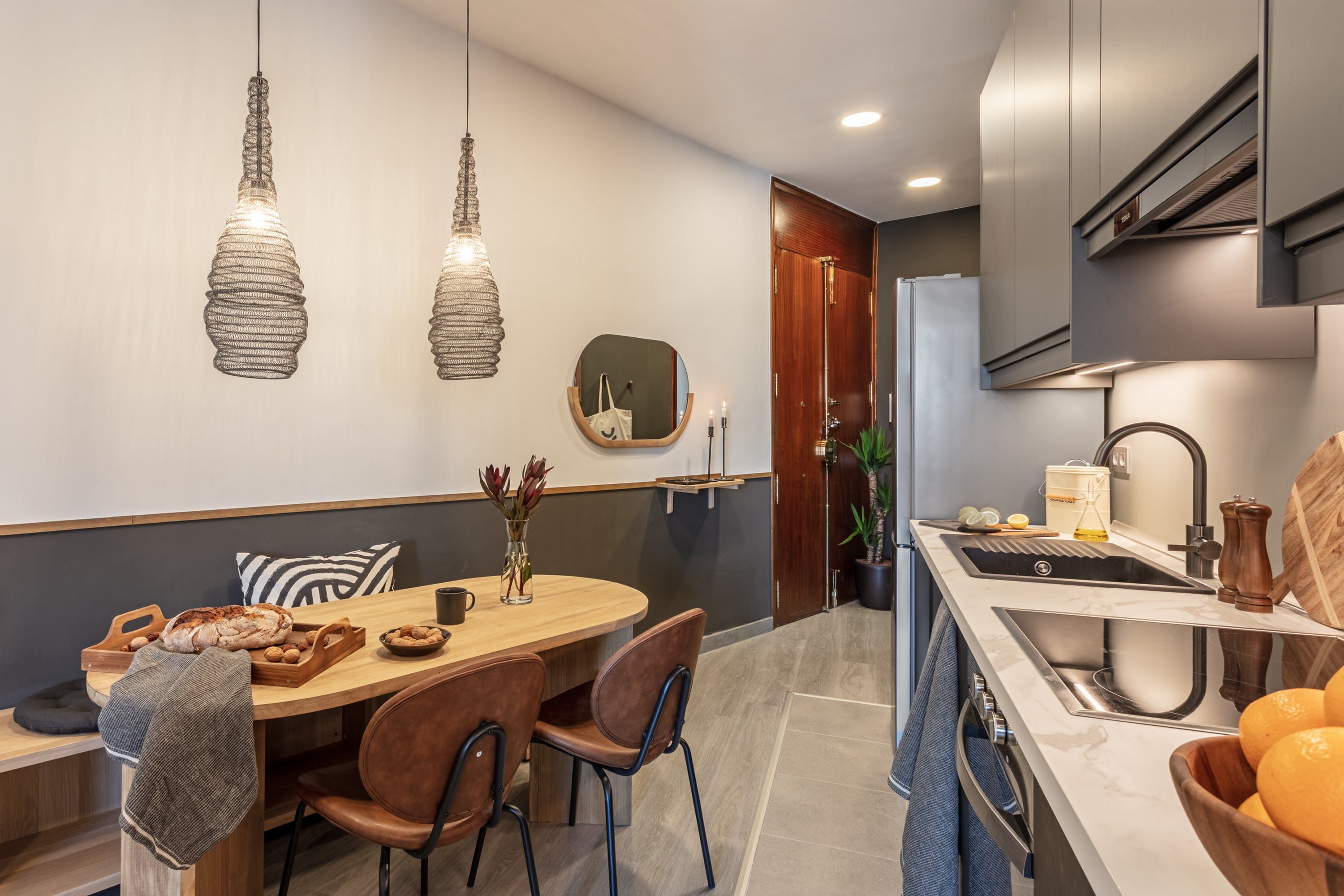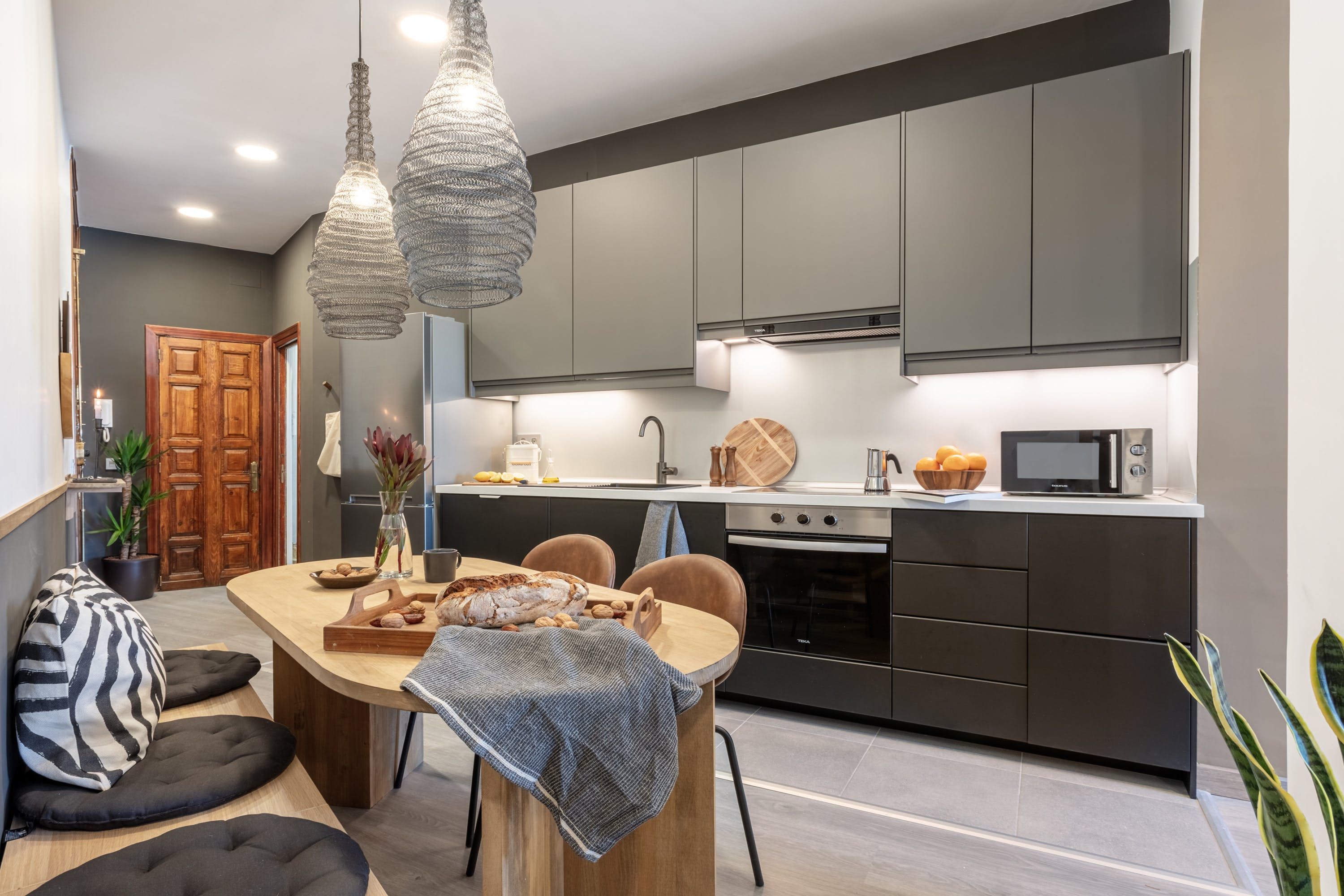 Remove yourself from the noise and bustle back home by stepping foot in this calming apartment made up of natural textiles, neutral tones and rattan furnishings in the heart of the Justicia District. We love the blend of modern design and old-world Saharan decor that makes for a zen and balanced space to kick back after a day of sightseeing. Curl up on the sofa with a good book, prepare meals in the marble-topped kitchen or keep an eye on work – there’s a dedicated desk for those who are visiting on business.