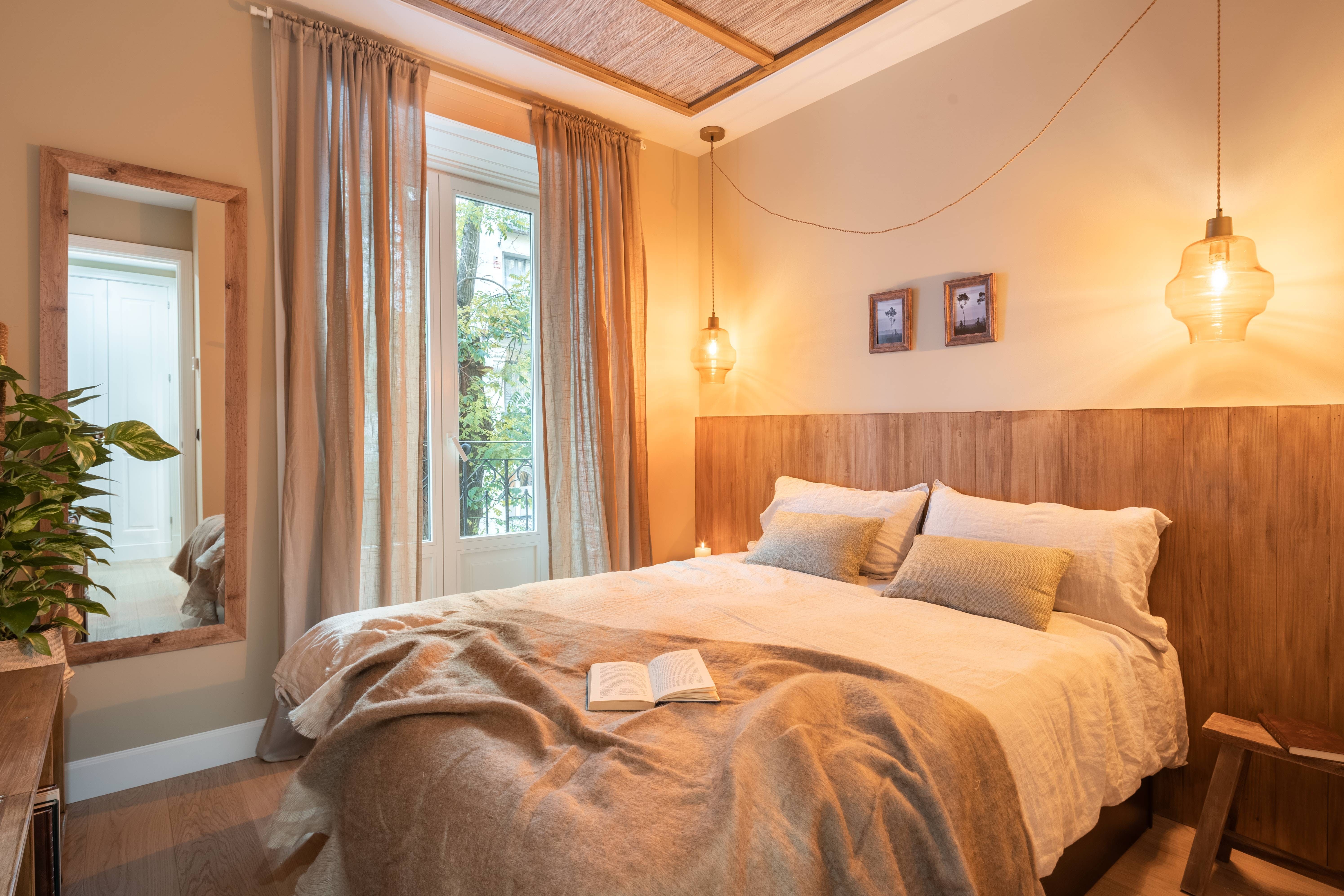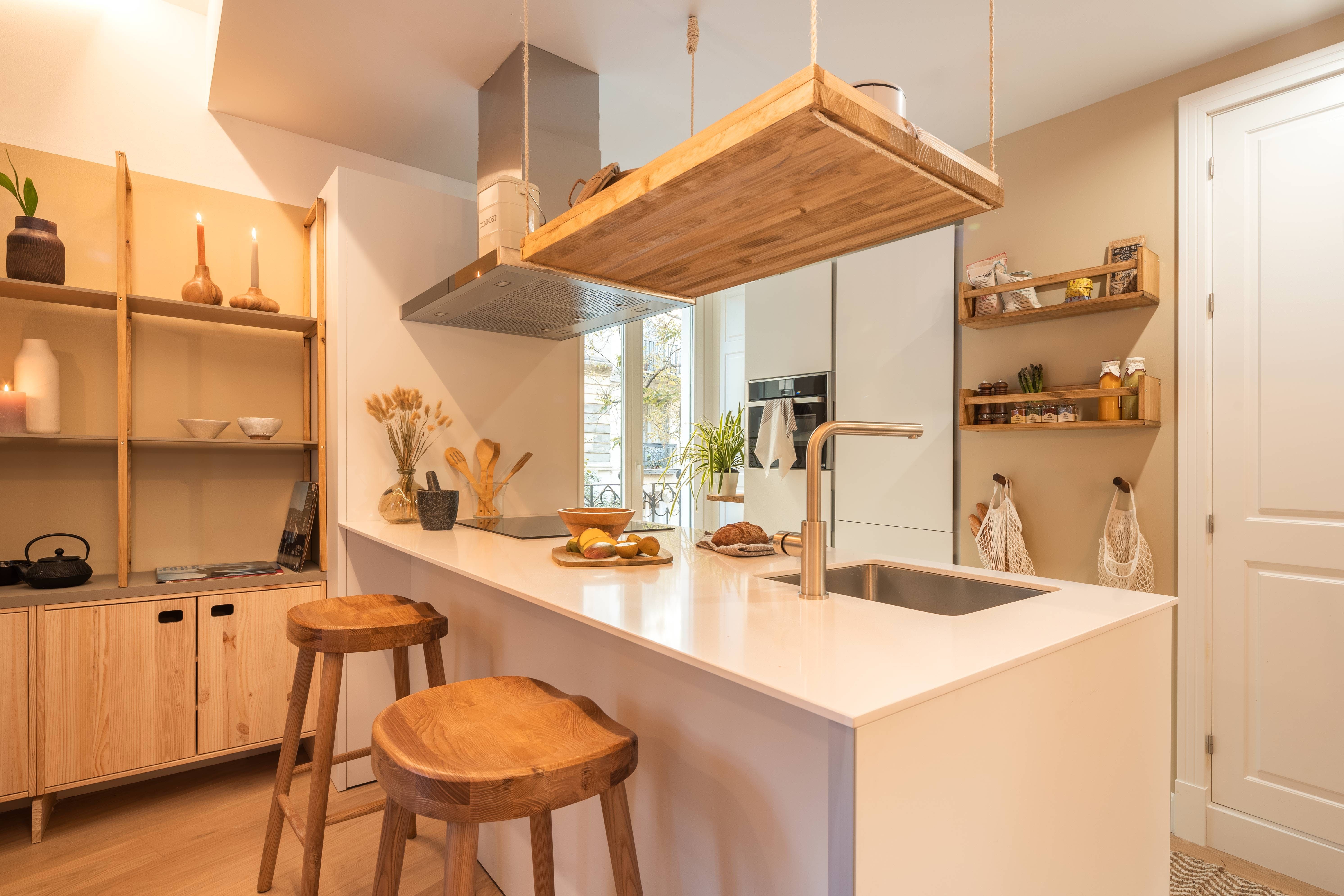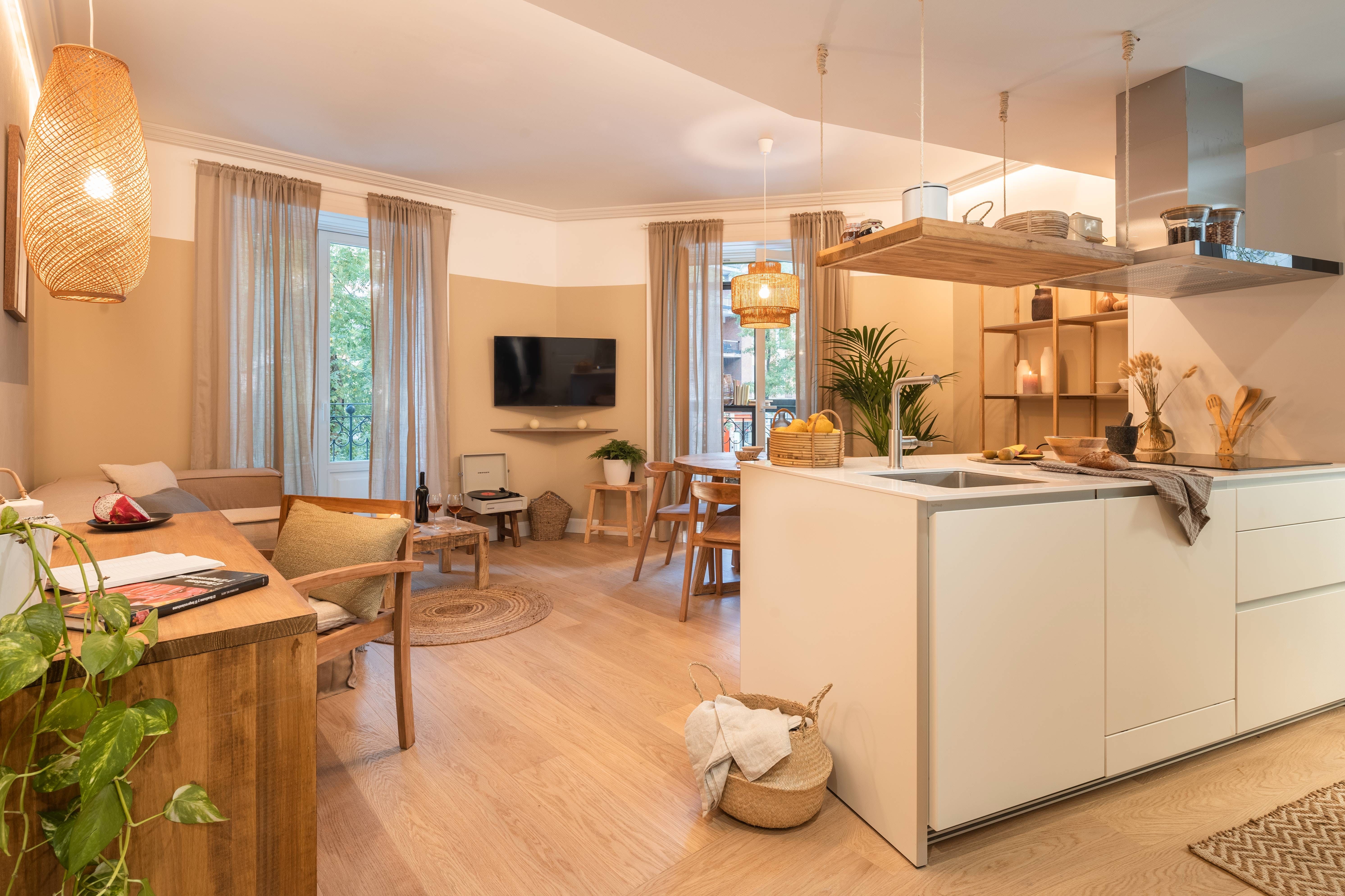 This home has not one or two but four balconies to enjoy. The French windows let light flood in, allowing the array of plants, including verdant palms, to thrive, creating a homely atmosphere. There's a distinct nod to the orient here, with the custom-made bamboo panelling on the bedroom ceiling – we love the attention to detail at this place. There's a desk too for working from home and a communal gym in the building if you want to keep up your fitness regime while away. Sit at the kitchen island with some churros and a hot chocolate for breakfast before heading out to explore Madrid.