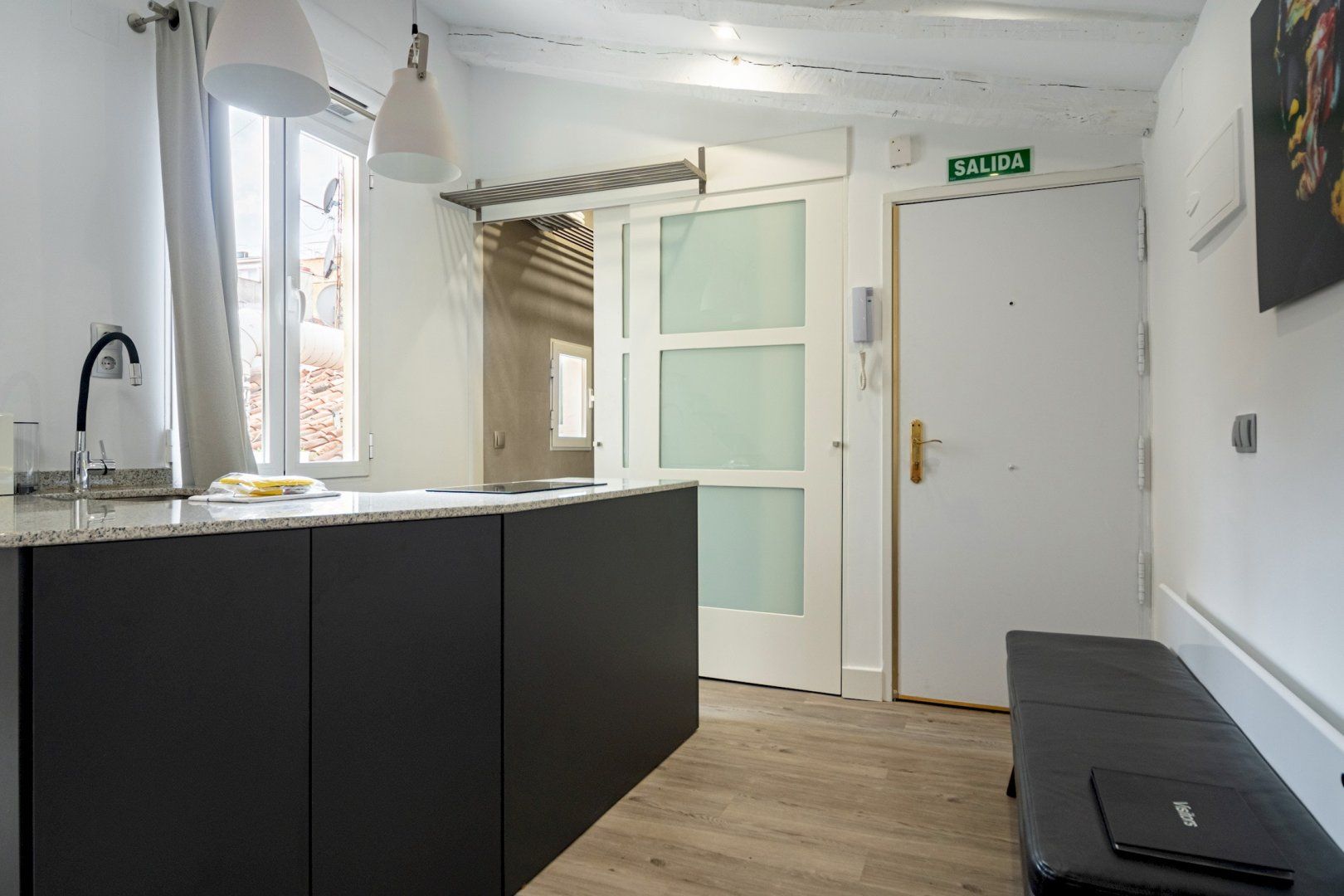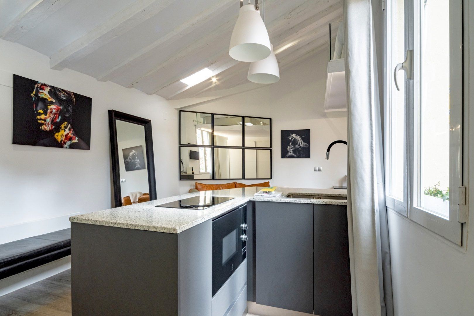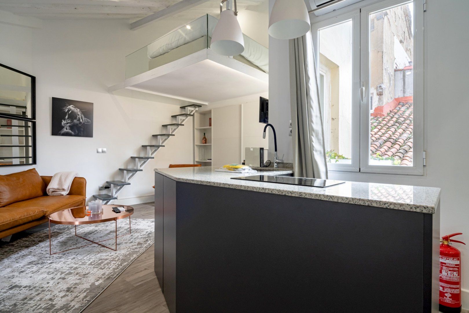 Setting the tone for a cool stay in the heart of Madrid, this newly renovated top floor apartment captures the charm of its historic setting. Leaving the busy streets behind, the front door opens onto a minimal and light-filled space. Features such as the mid-century modern furnishings and contemporary artwork create an eclectic ambience. It’s refreshingly simple and urban here. But there are all the amenities you could need for a comfortable city stay. From the living area, the striking staircase leads up to the bed, seemingly floating on a mezzanine. Soak in the vibrant atmosphere of the city and walk to iconic locations like La Plaza Mayor, La Puerta del Sol and the Royal Palace. The nearby metro also provides great connections to the rest of the city.