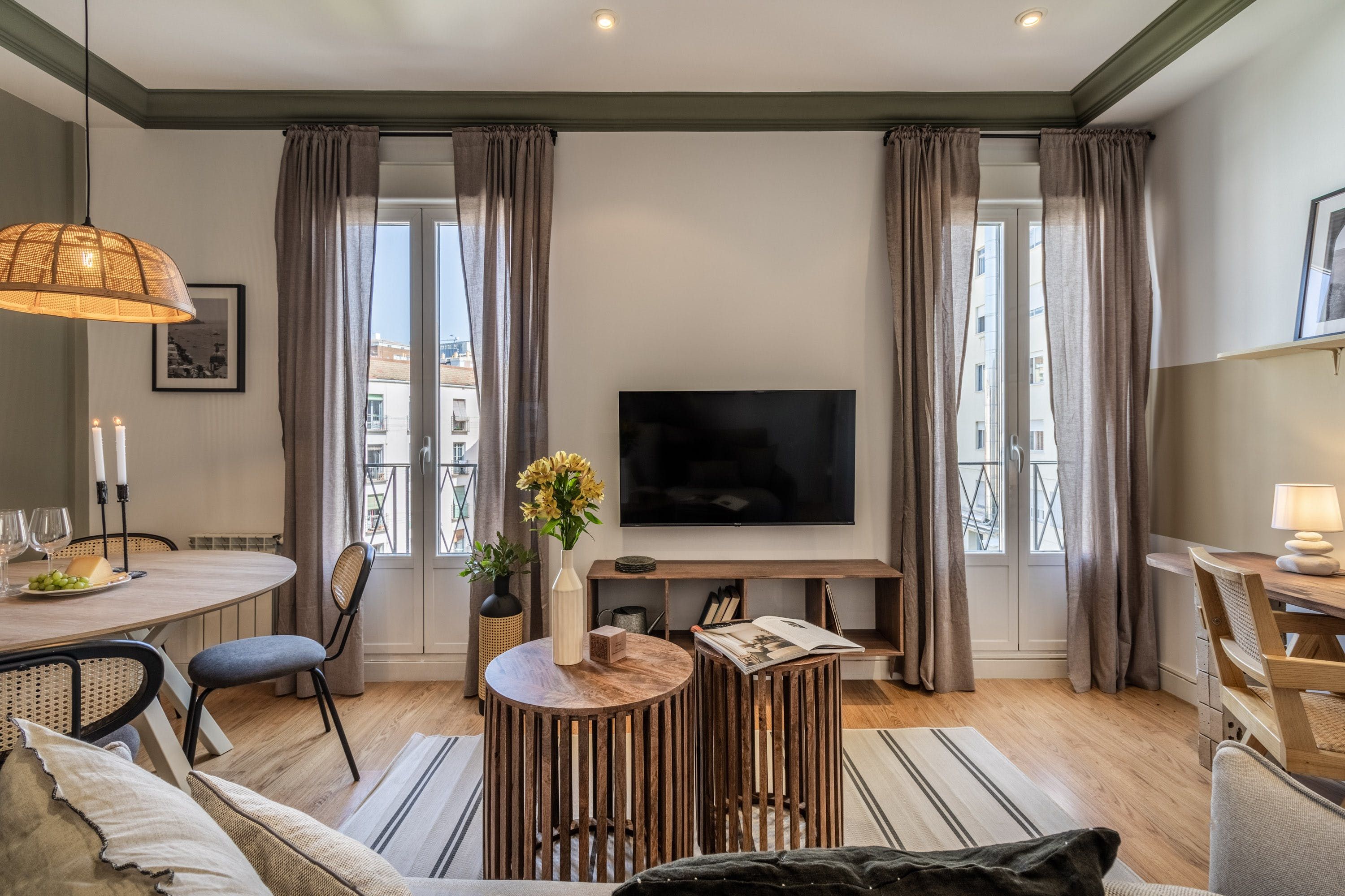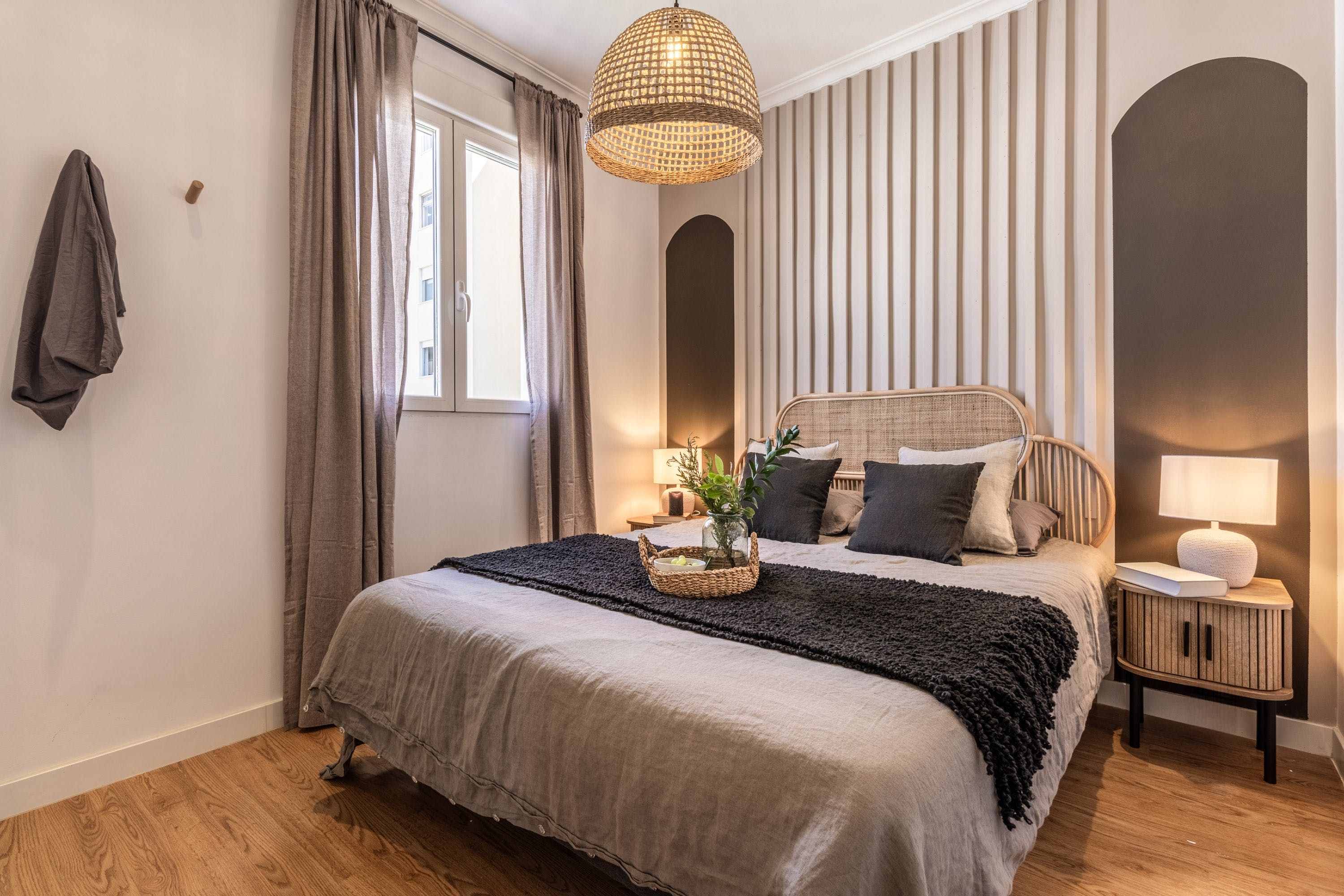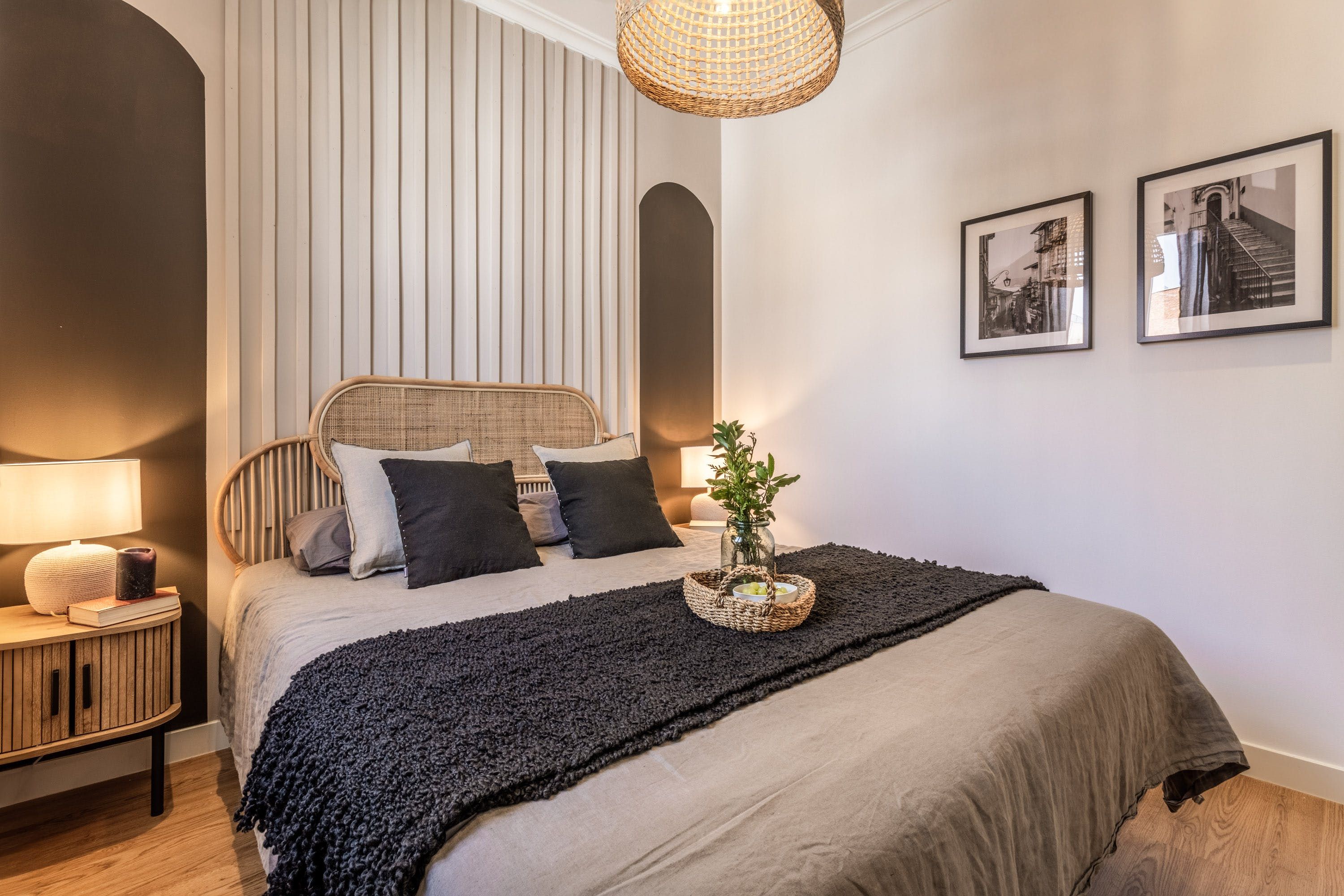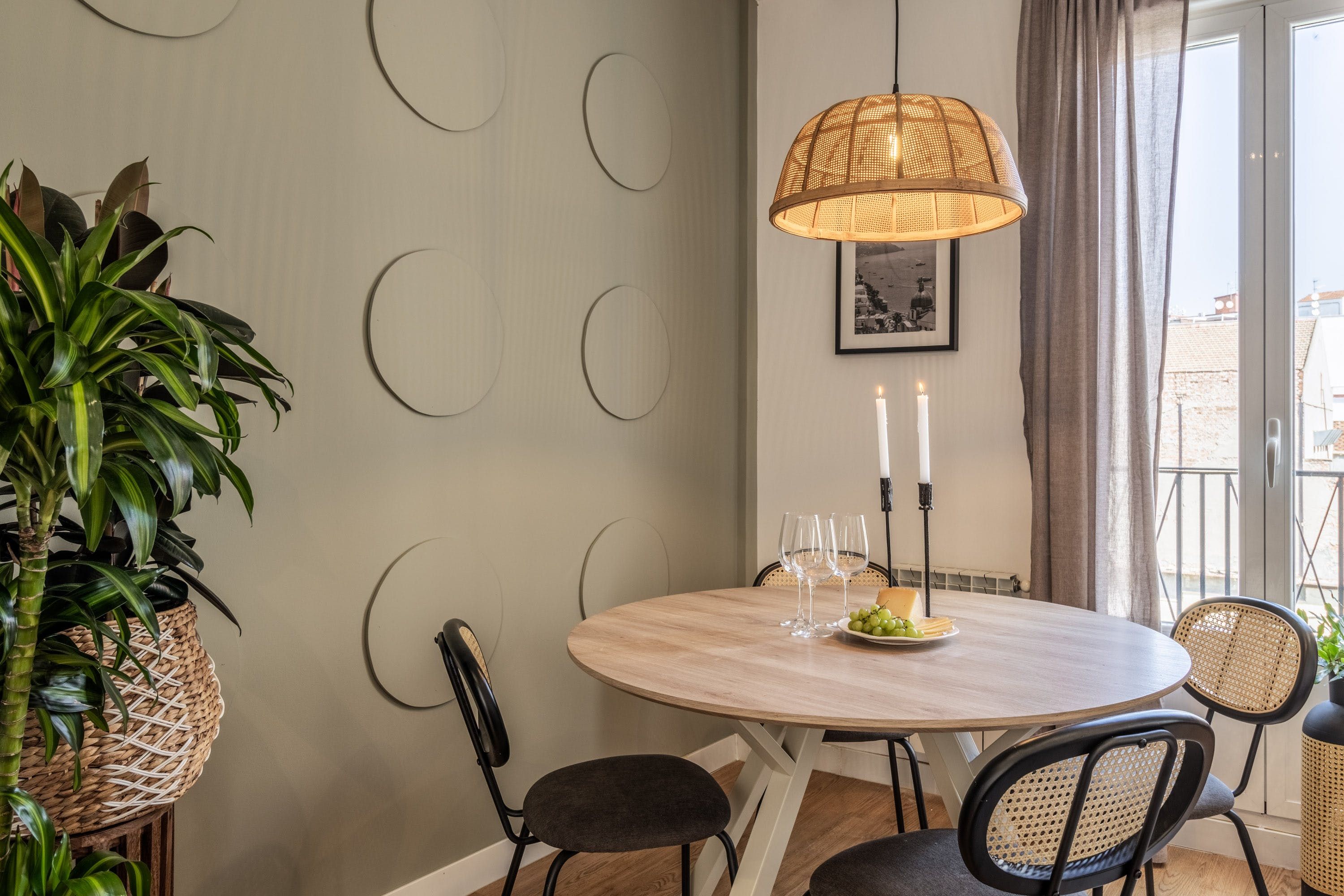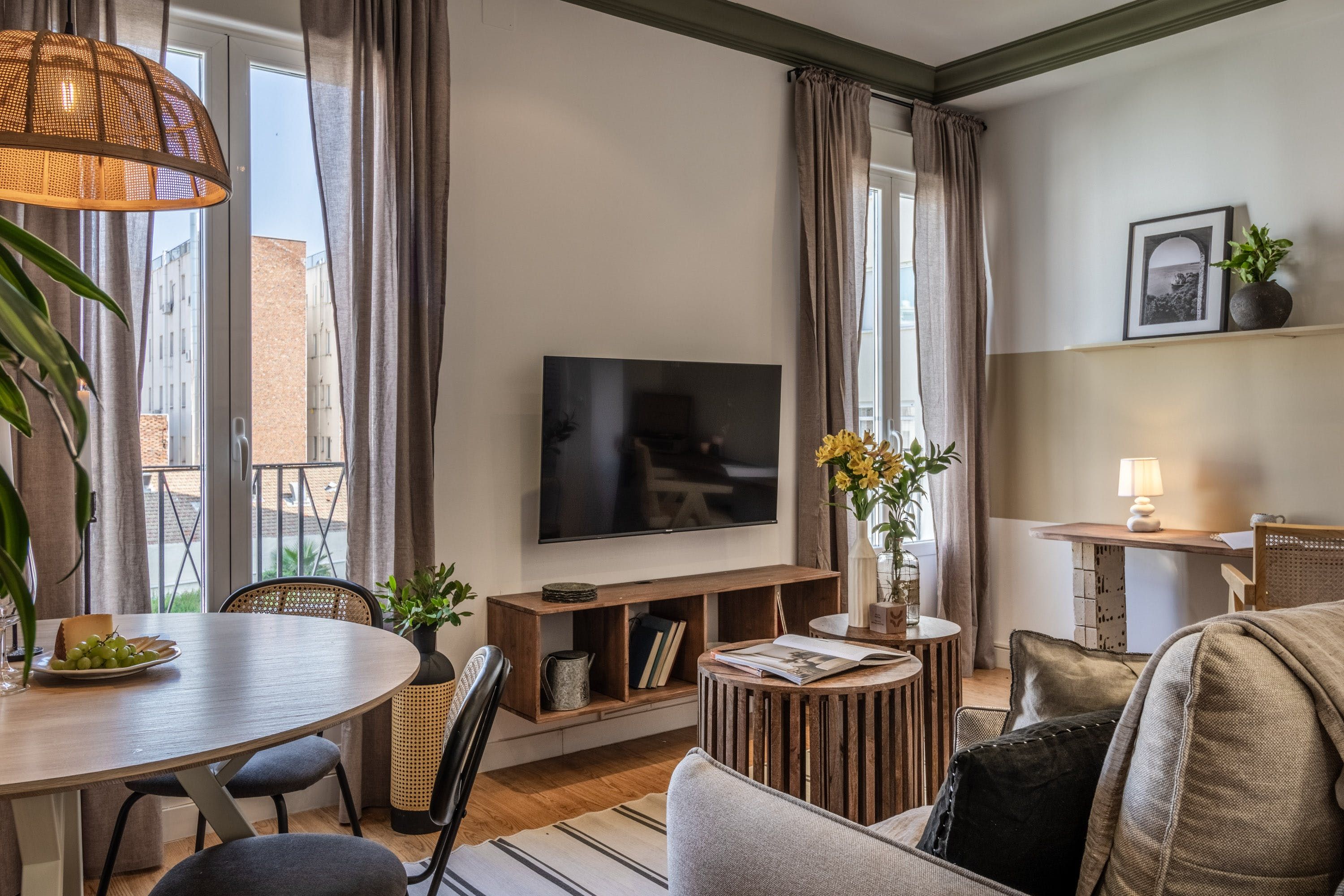 Combining comfort with style, this apartment makes a great base for an inspiring city stay. Outside, you can stroll to tapas bars, cafes and parks. There are also great public transport links – ensuring smooth connections with the rest of Madrid. Wherever the day takes you, this home welcomes you to switch off and unwind in the cosy living room. Remote workers will also appreciate the dedicated desk space, while the vinyl record player sets the tone for relaxing evenings at home. The building also includes a concierge service – delivering practical support throughout your stay.
