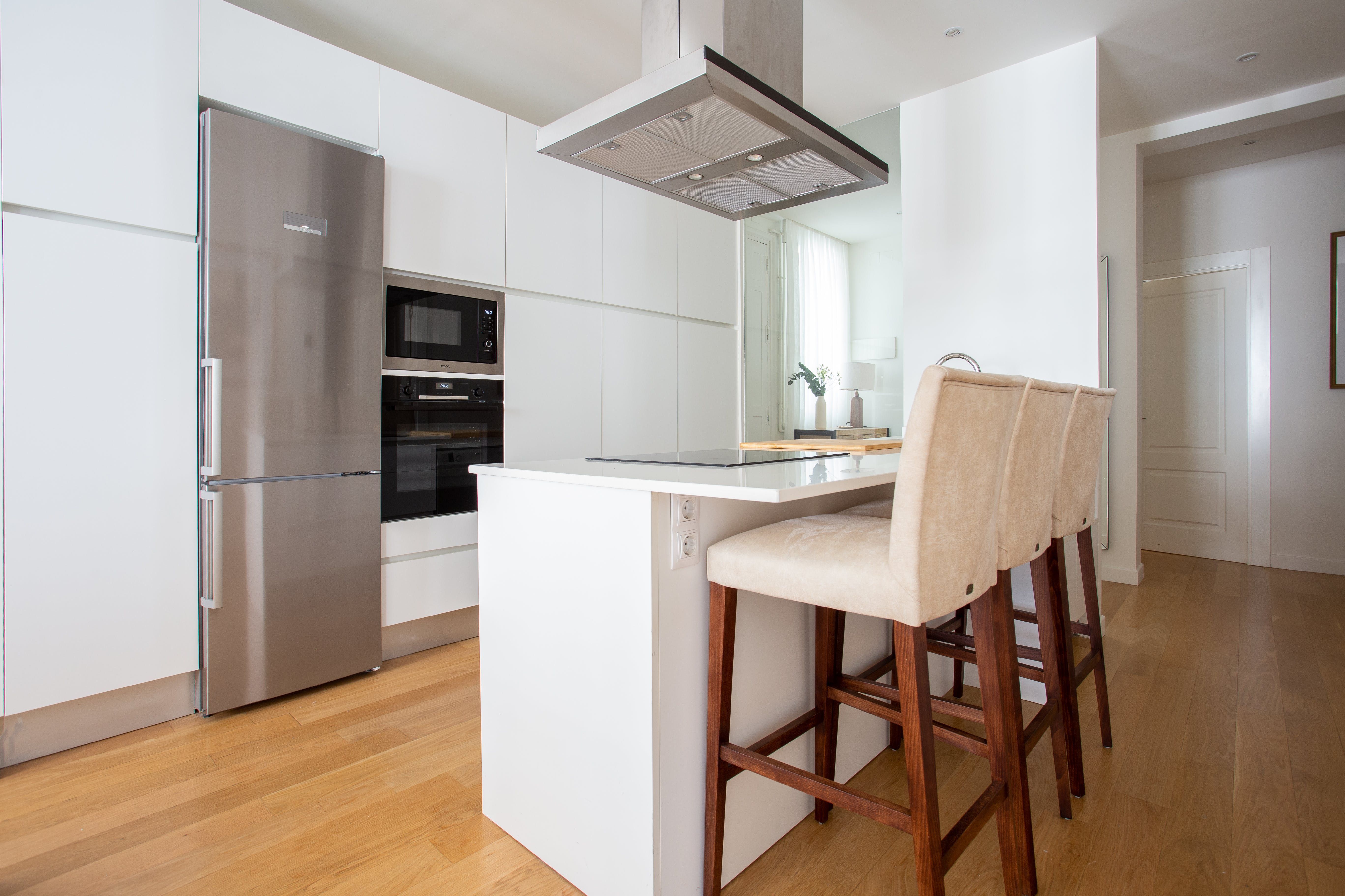 Chic and attractive, this apartment is a great base in Madrid. It’s bright and welcoming, with plenty of windows to flood the home with light. The layout of the apartment means that there are quiet corners for you to unwind in, as well as living and dining spaces where you can all gather together. There’s also a convenient workspace for those needing to work during their stay. The apartment is in a brilliant location close to El Retiro Park and Puerta de Alcalà. The Serrano metro station is close, too, so visiting further-afield sights is as easy as can be.