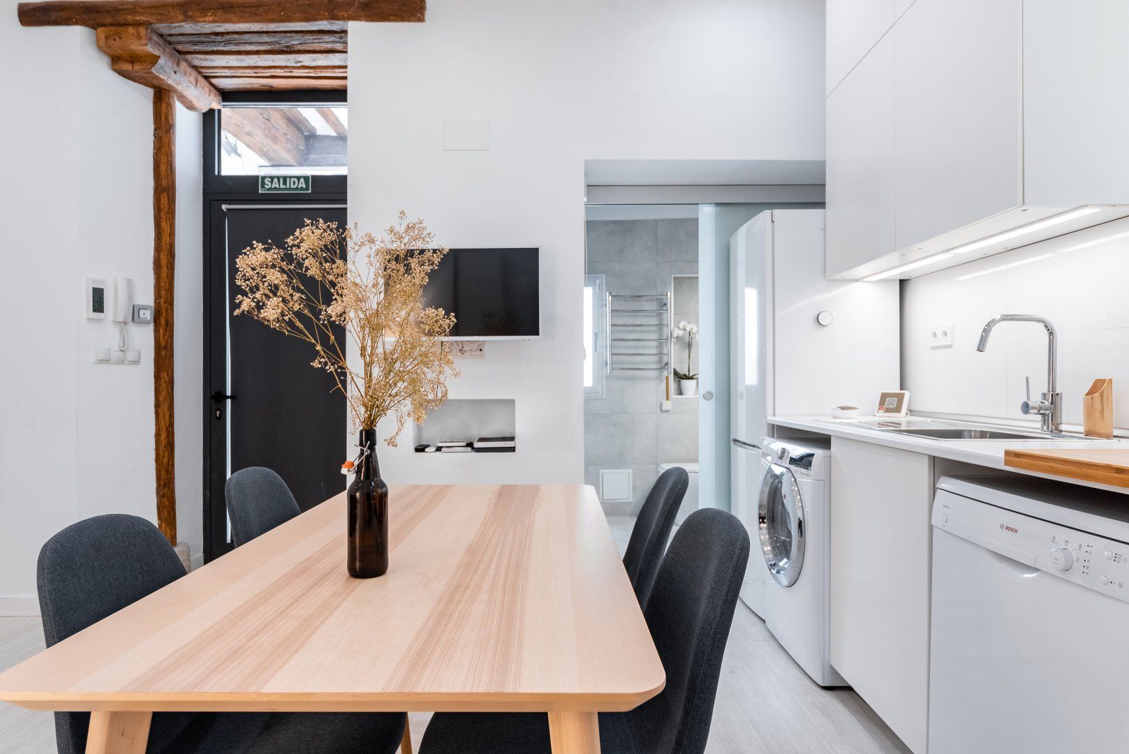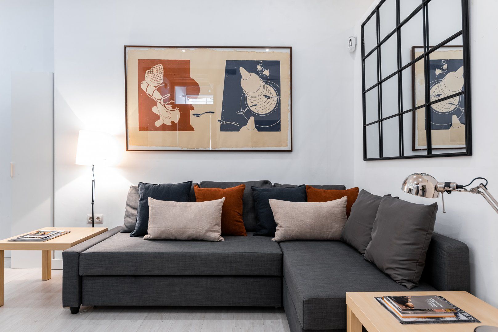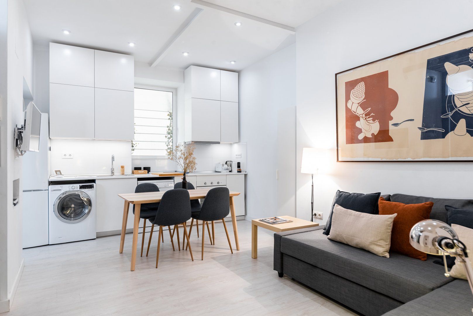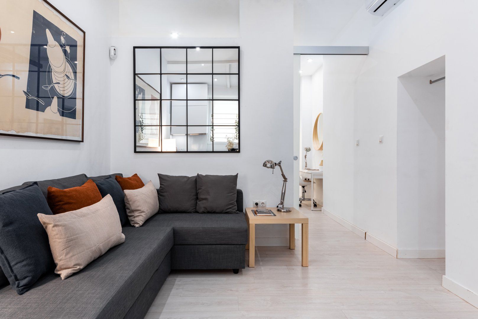 Featuring sparkling white walls decked with mirrors and earthy-toned artworks, there’s a feeling of bohemian chic in the carefully chosen ornaments that bring together the home’s minimalist aesthetic to great effect. Make yourself comfortable on the inviting sofa with a glass of Spanish wine or gather around the dining table for an at-home tapas feast when you’re not out sampling La Latina’s renowned restaurant and bar scenes.