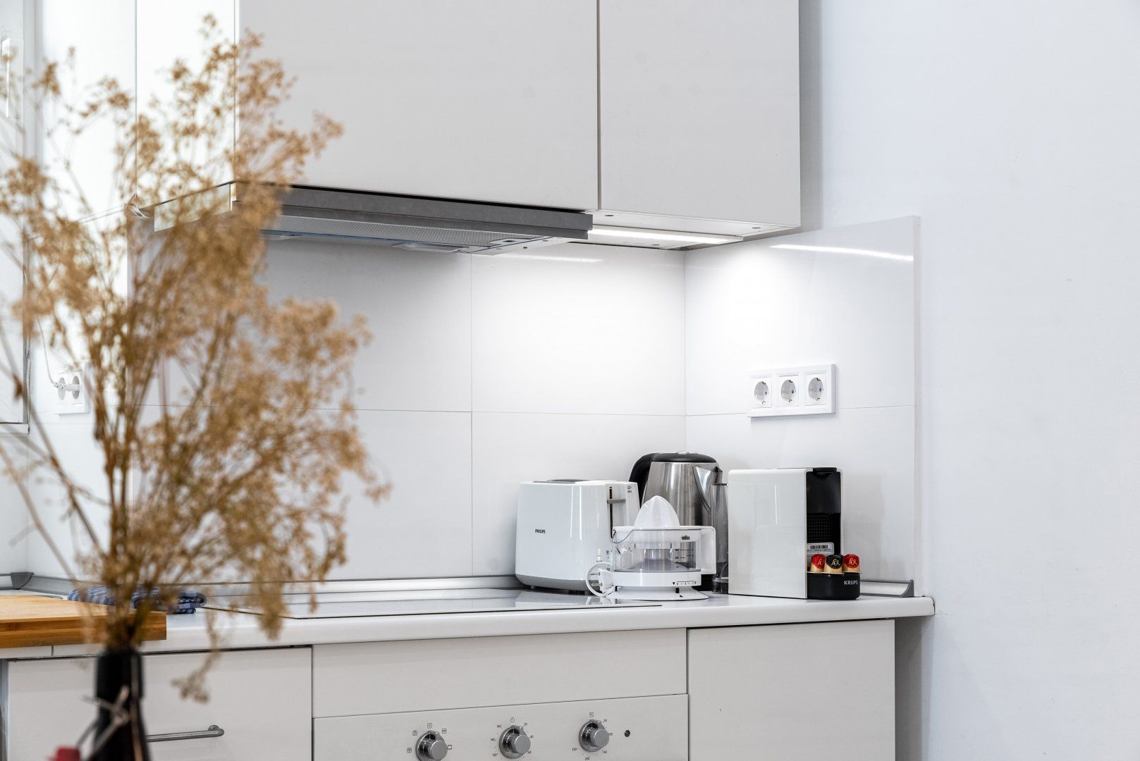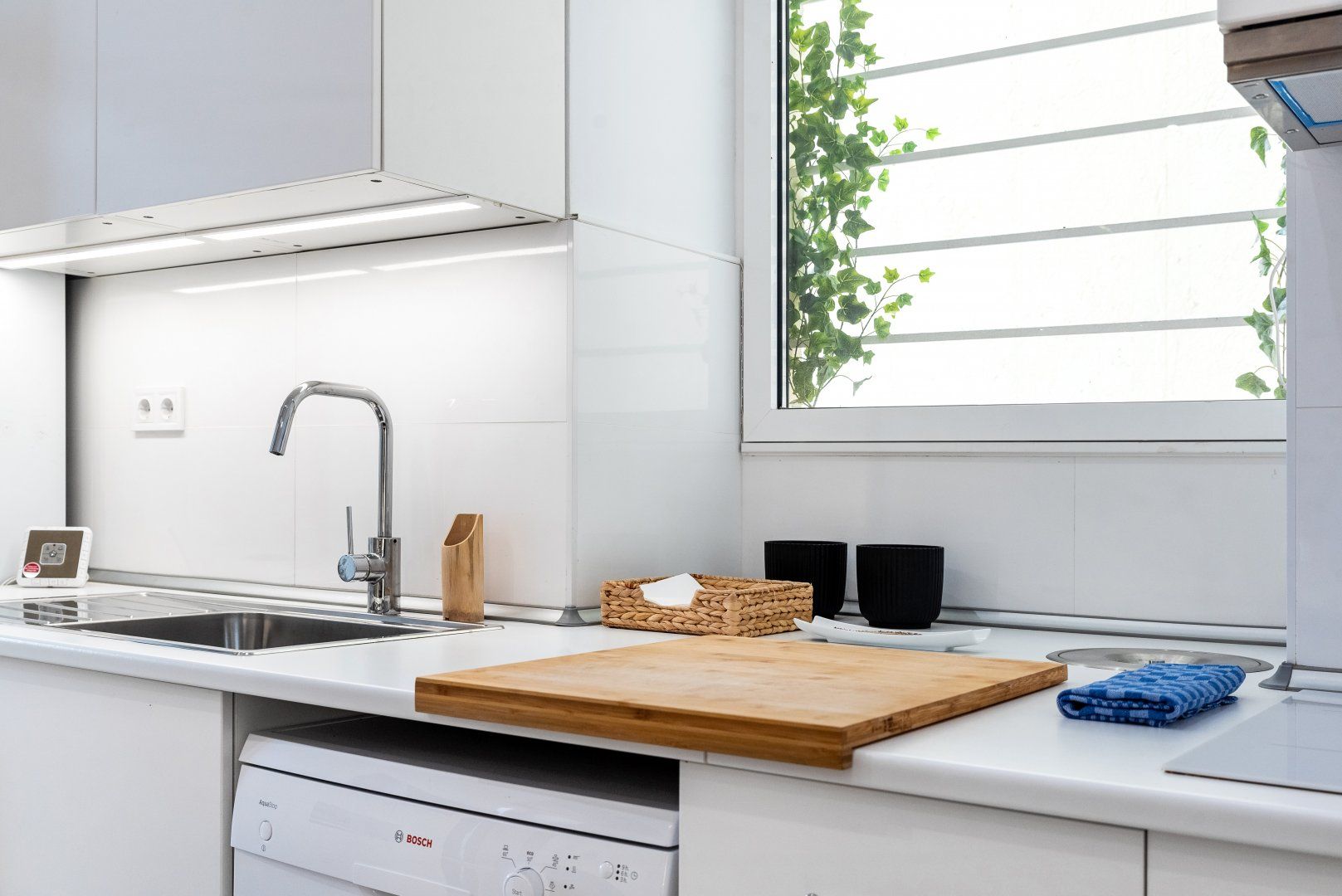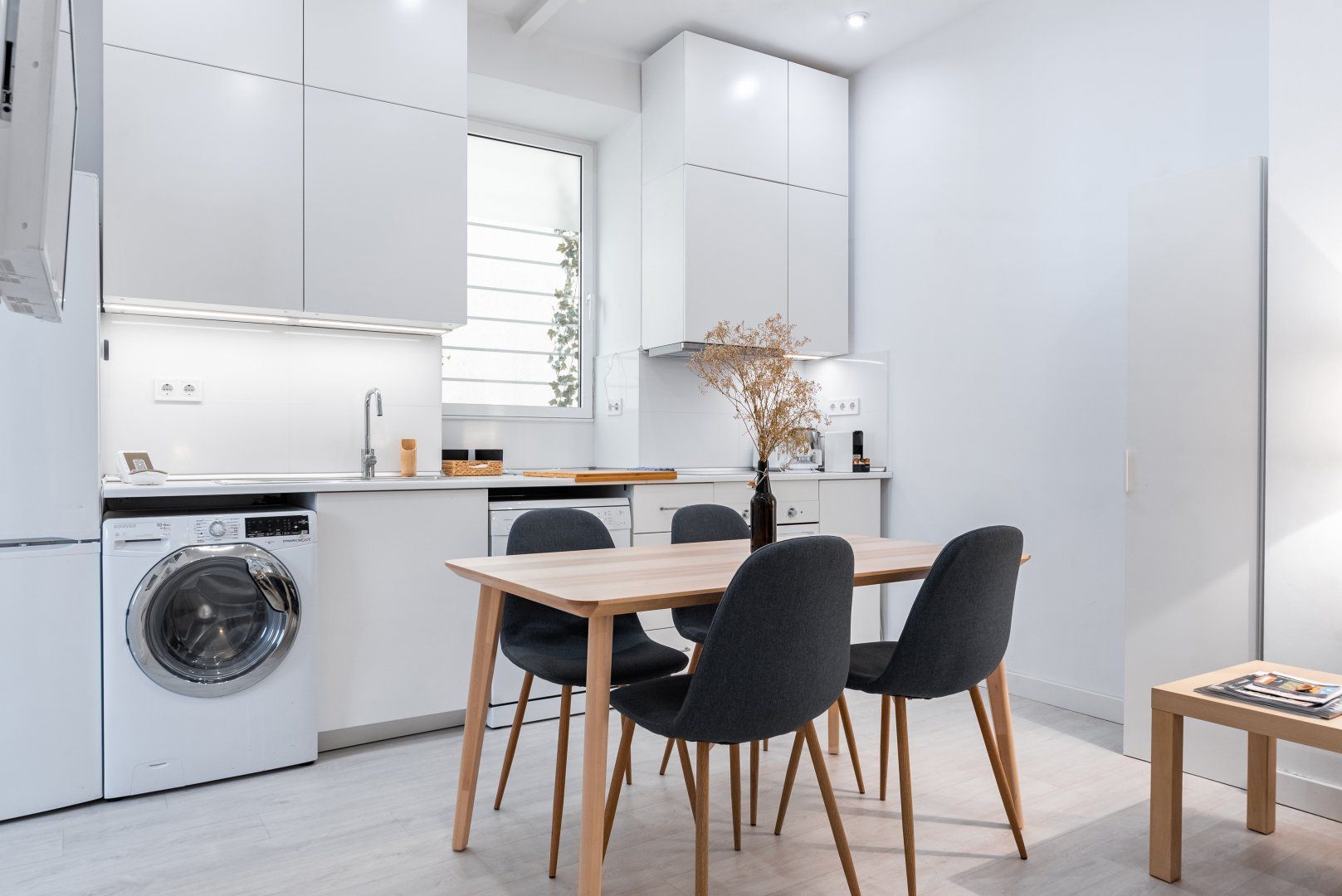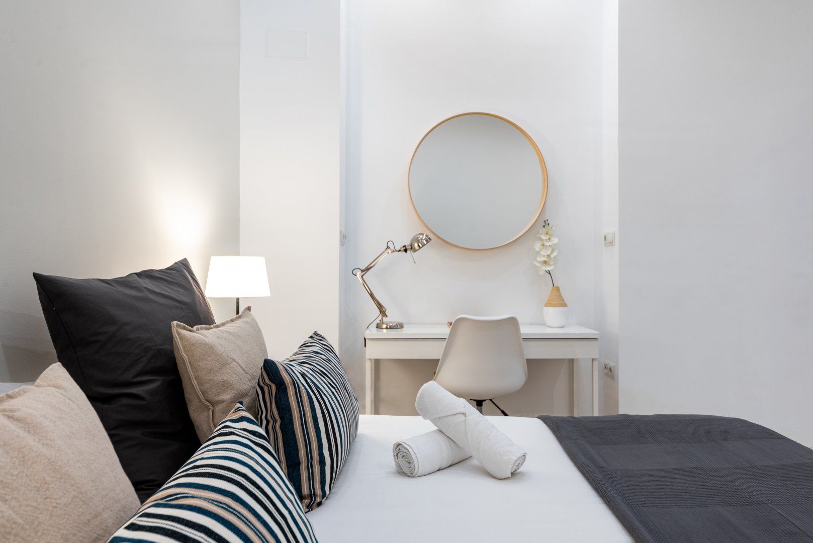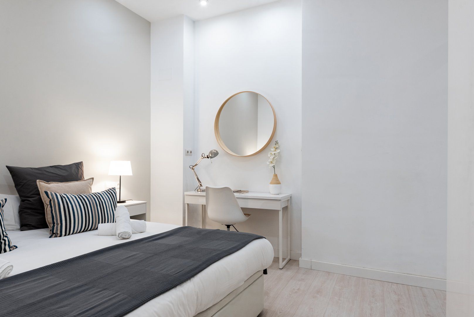 Featuring sparkling white walls decked with mirrors and earthy-toned artworks, there’s a feeling of bohemian chic in the carefully chosen ornaments that bring together the home’s minimalist aesthetic to great effect. Make yourself comfortable on the inviting sofa with a glass of Spanish wine or gather around the dining table for an at-home tapas feast when you’re not out sampling La Latina’s renowned restaurant and bar scenes.