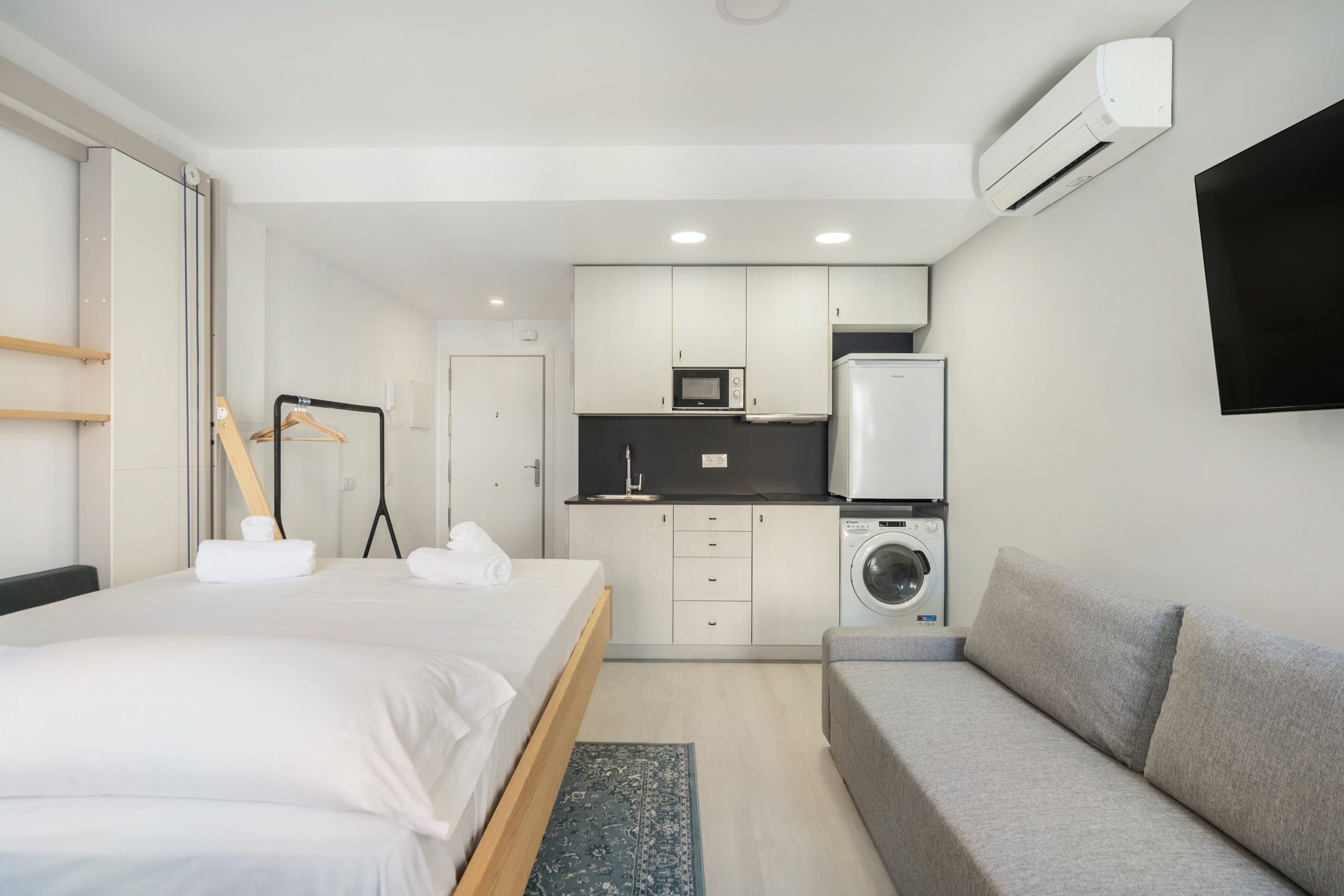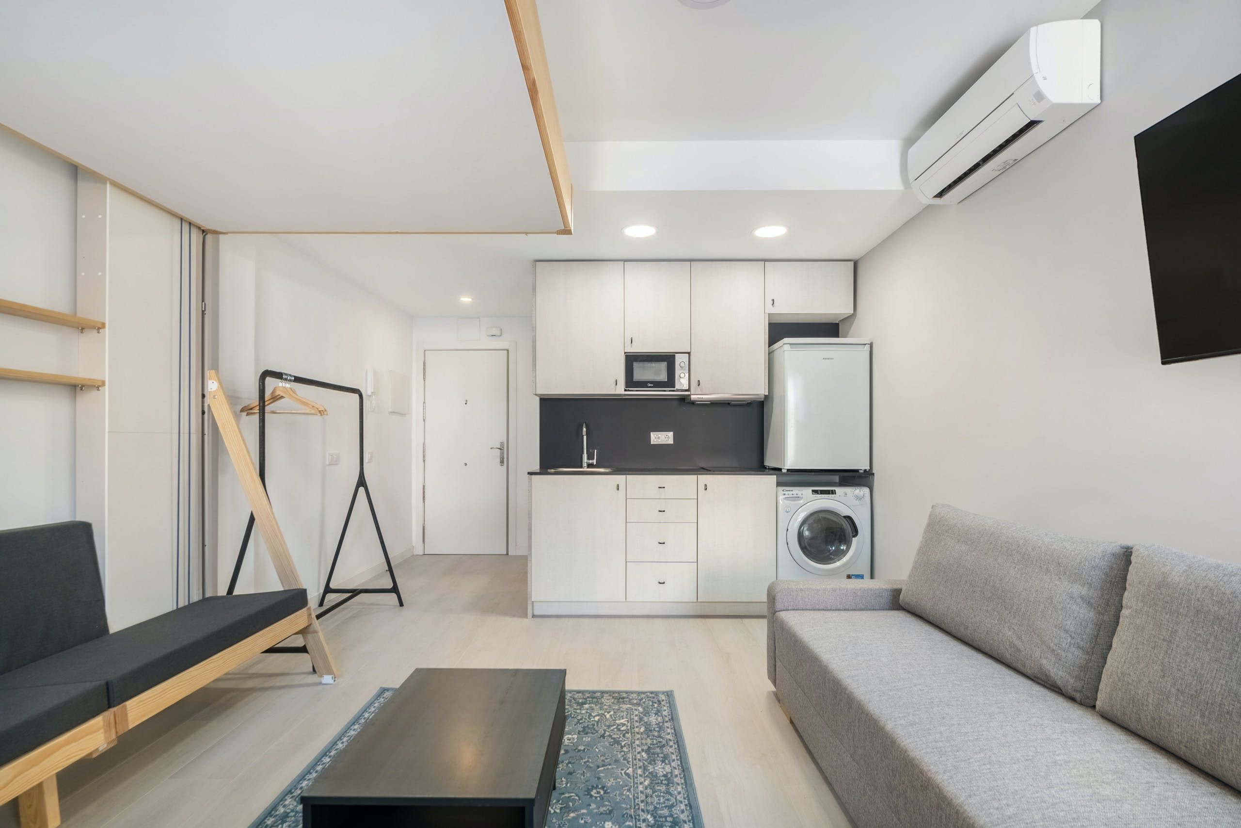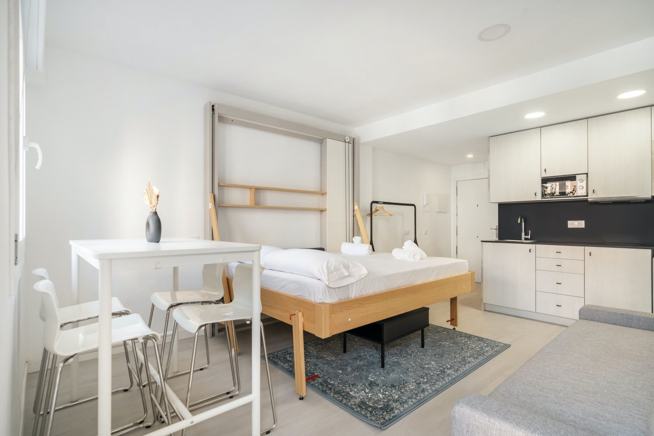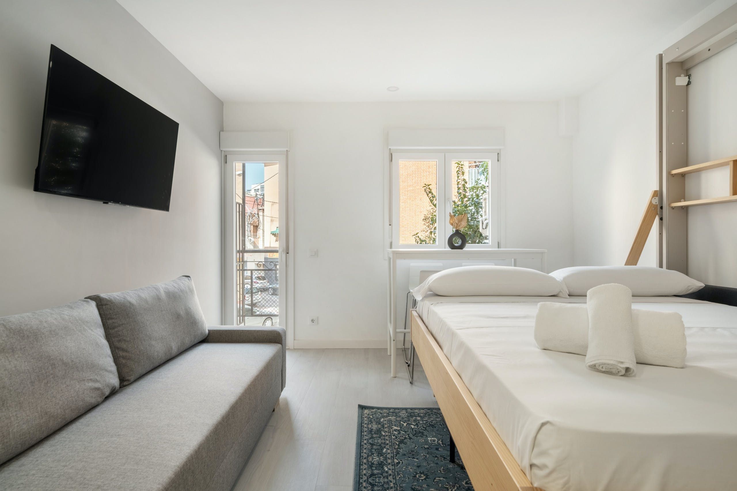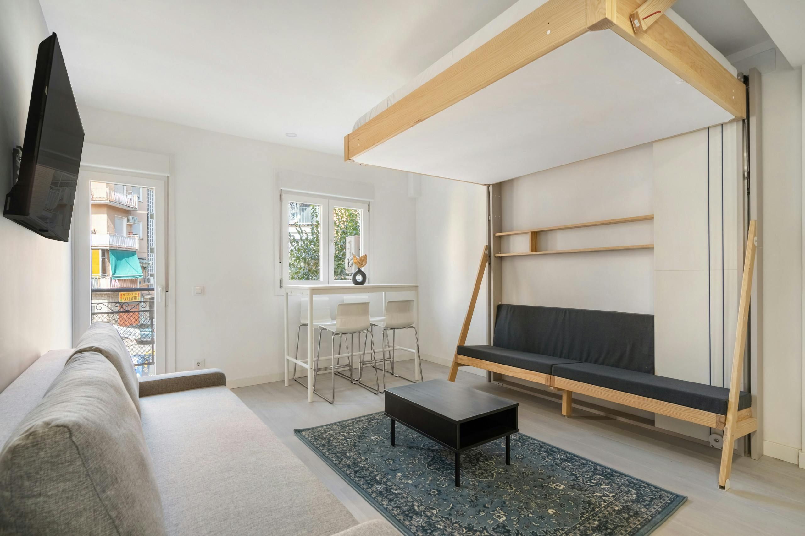 This studio in Opañel is for those seeking a quieter neighbourhood but within easy reach of Central Madrid. From here, you’re just a short drive from the inner city and within walking distance of Urgel metro station. The balcony is a nice spot for morning coffees, though keep in mind there’s no seating out here. Inside, the space is minimal and equipped for all your needs – the high-top table will appeal to remote workers, and the sofa bed will accommodate two extra guests. That said, this studio is on the smaller side, and we think it’s best suited for two.