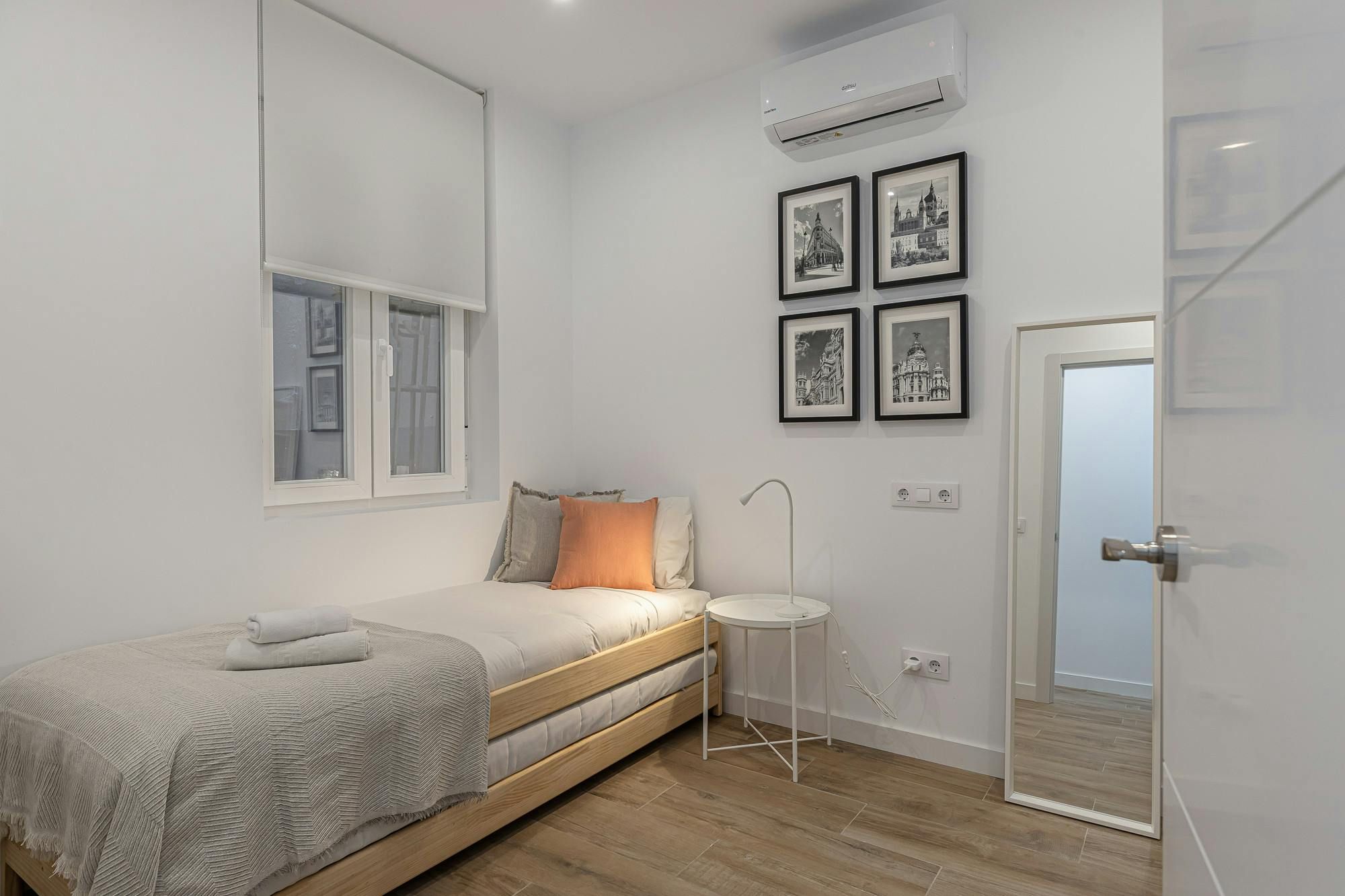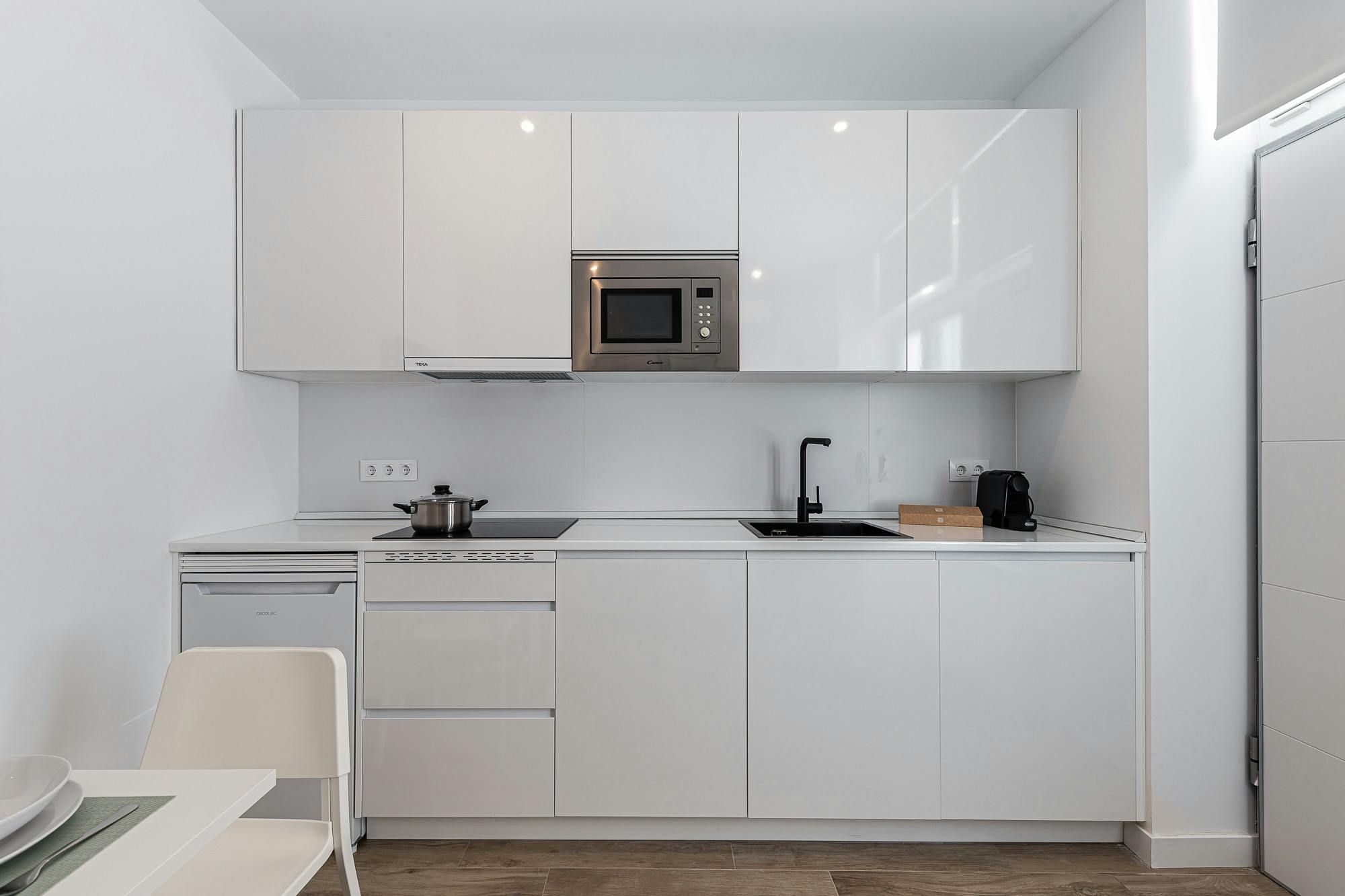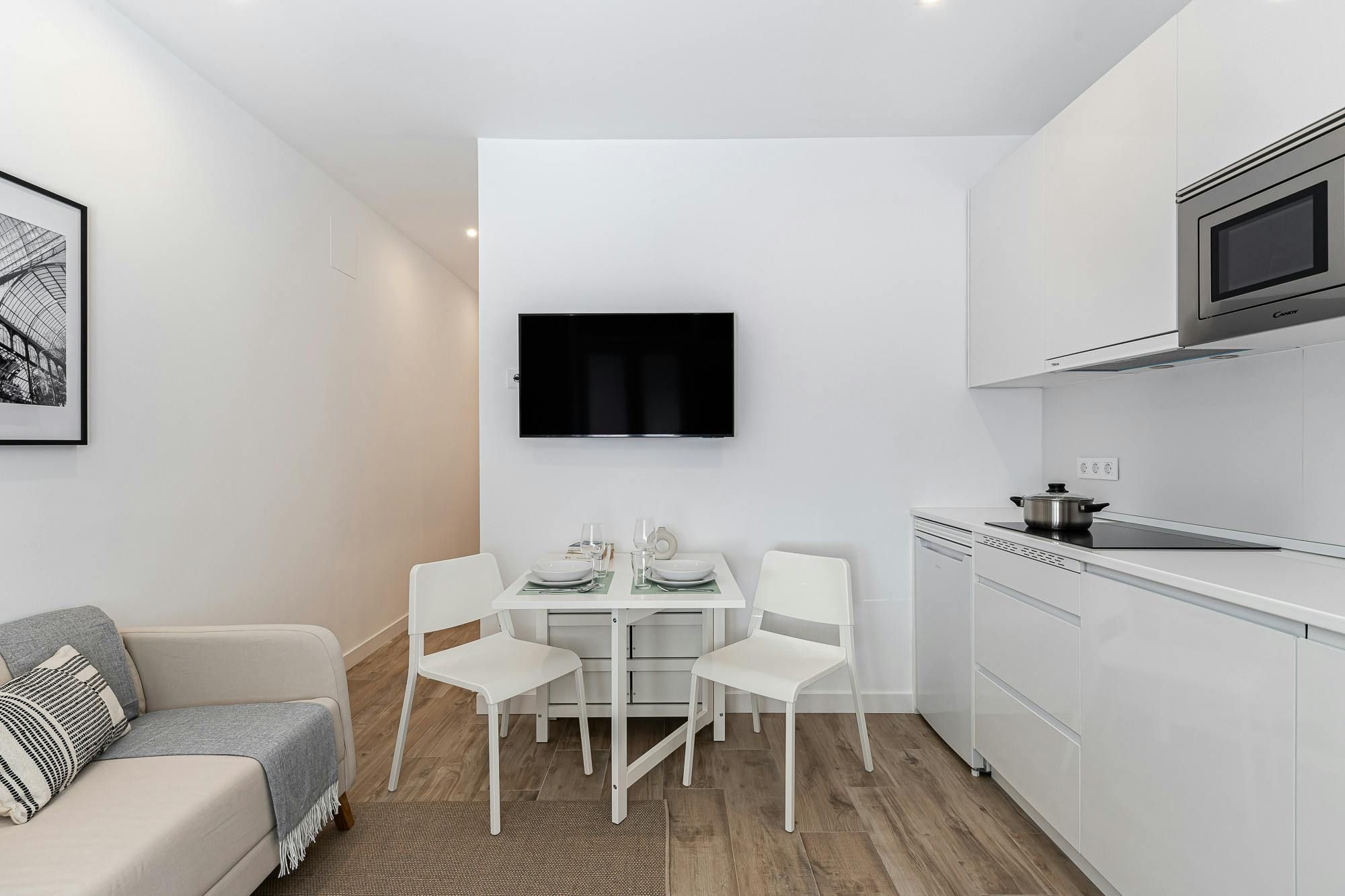With Retiro Park a short stroll away, this apartment will appeal to lovers of green space. There’s also a whole host of attractions within walking distance including the Puerta de Alcalá and the Thyssen-Bornemisza National Museum. There are also plenty of eateries in the locale, which is convenient as this apartment’s kitchenette doesn’t have an oven (though there’s a hob and microwave). With its two bedrooms, this modern home will also appeal to families and friends alike. If, on the other hand, you’re here on business there’s a desk in the bedroom.