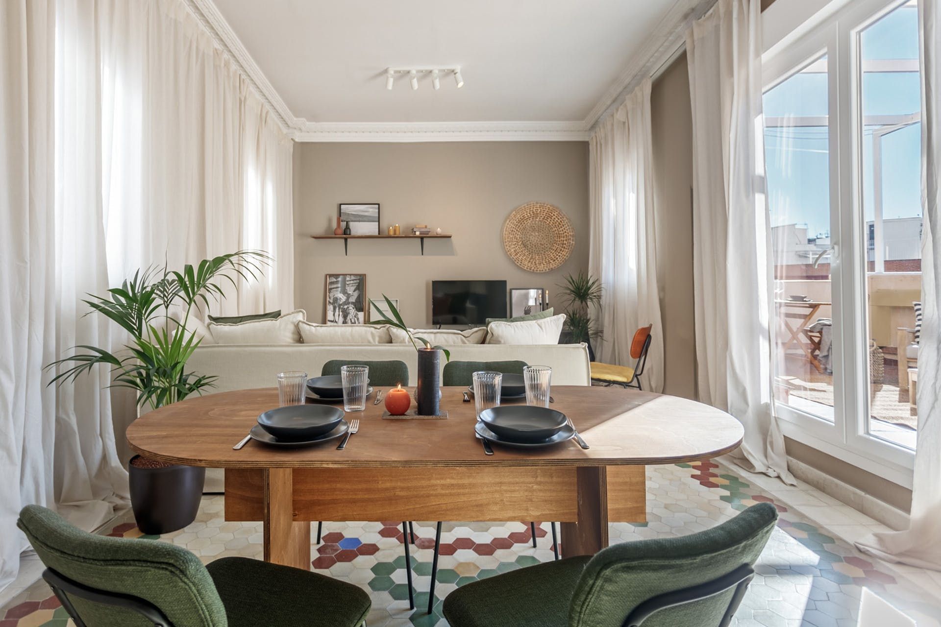 Back at home, the serene and soothing design is complimented by handcrafted furniture, amber-hued accessories and colourful tiles that add some quintessential Spanish flair. Between the Bluetooth speakers and Netflix, you'll be well-entertained during chill nights at home – just sink into the sumptuous sectional and rest weary legs after – while the desk space is perfect for those needing to work from home. But the star of the show is the stunning, sun-drenched terrace – the cushy outdoor sofa and romantic two-seater table are excellent spots to savour a cup of coffee and a glass of sangria in the endless rays.