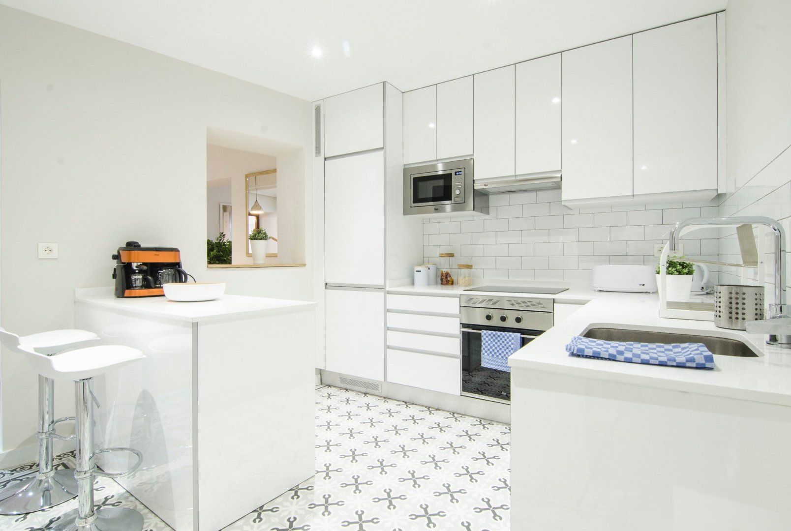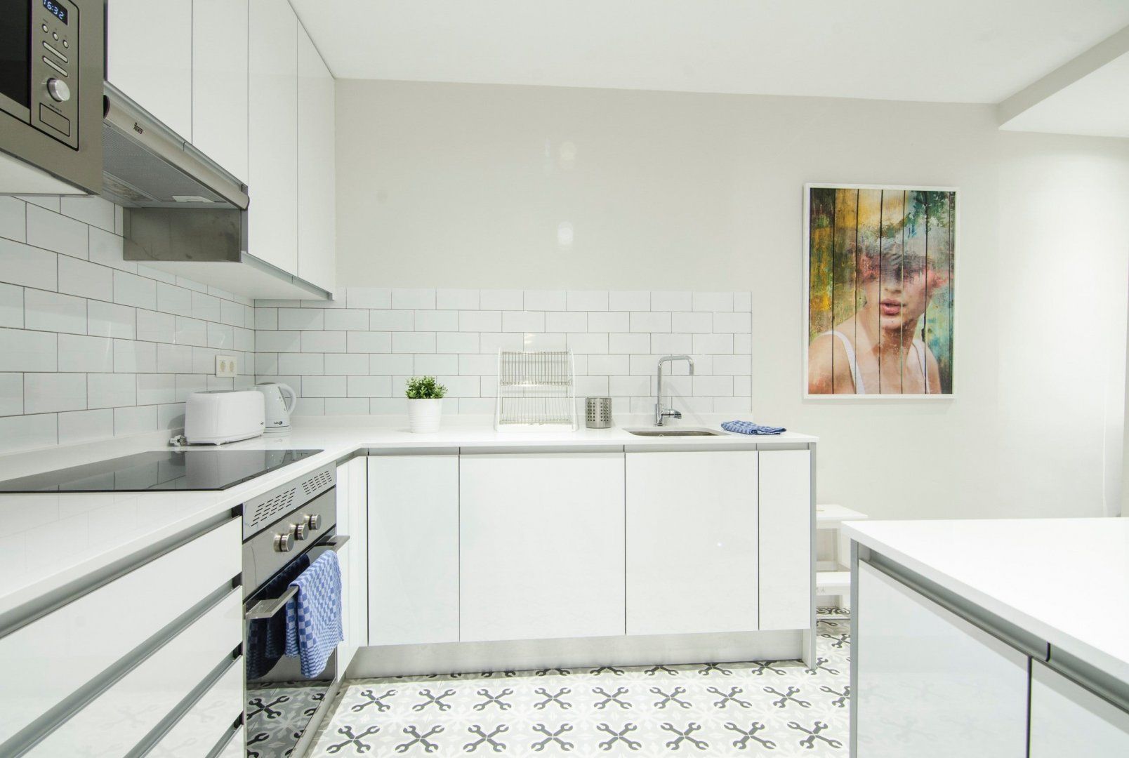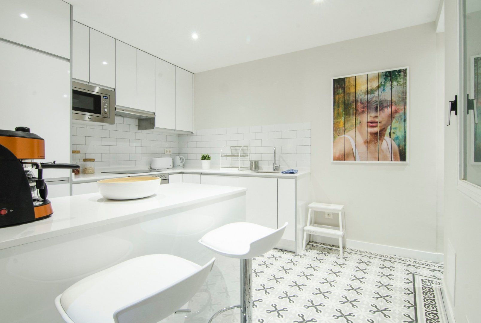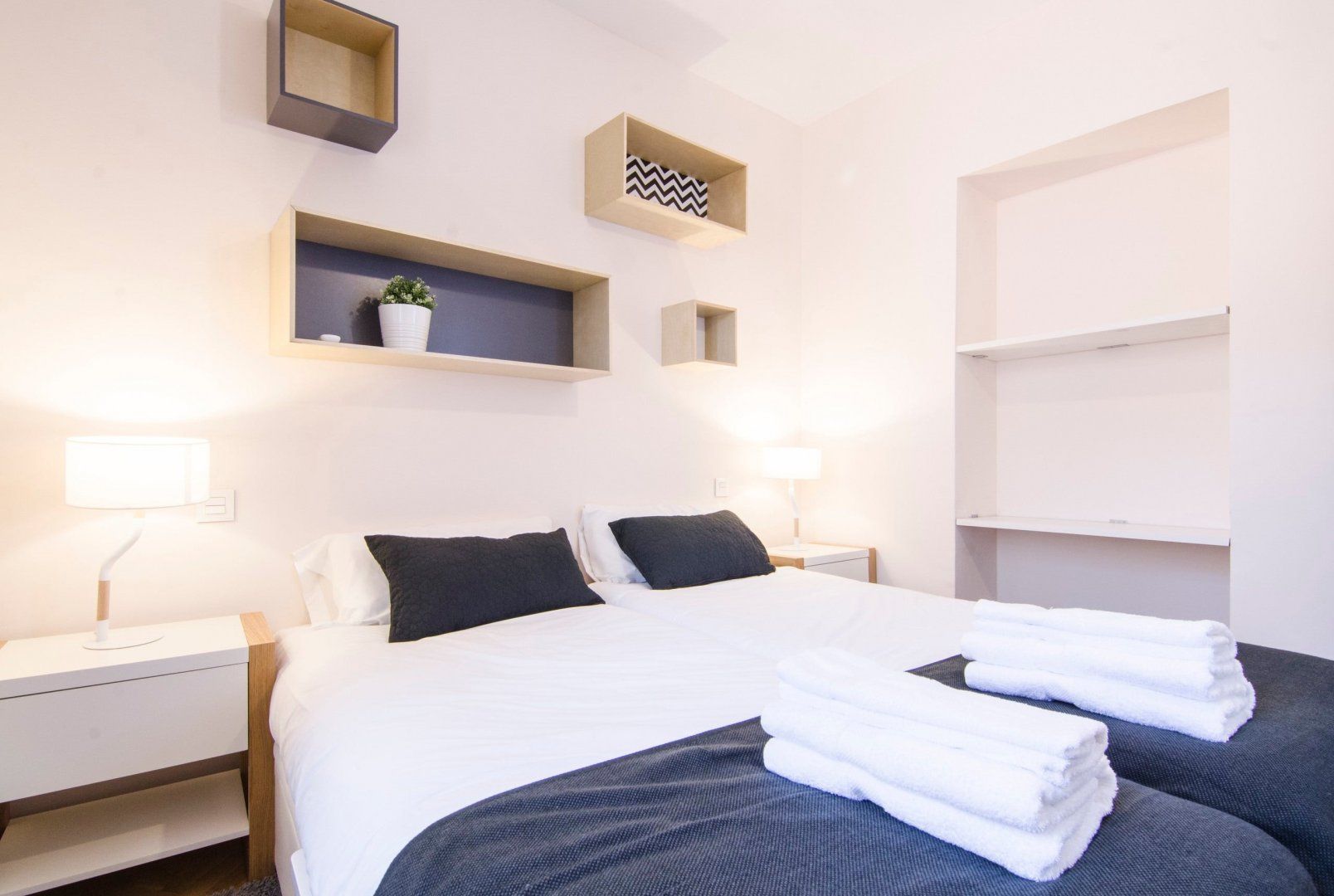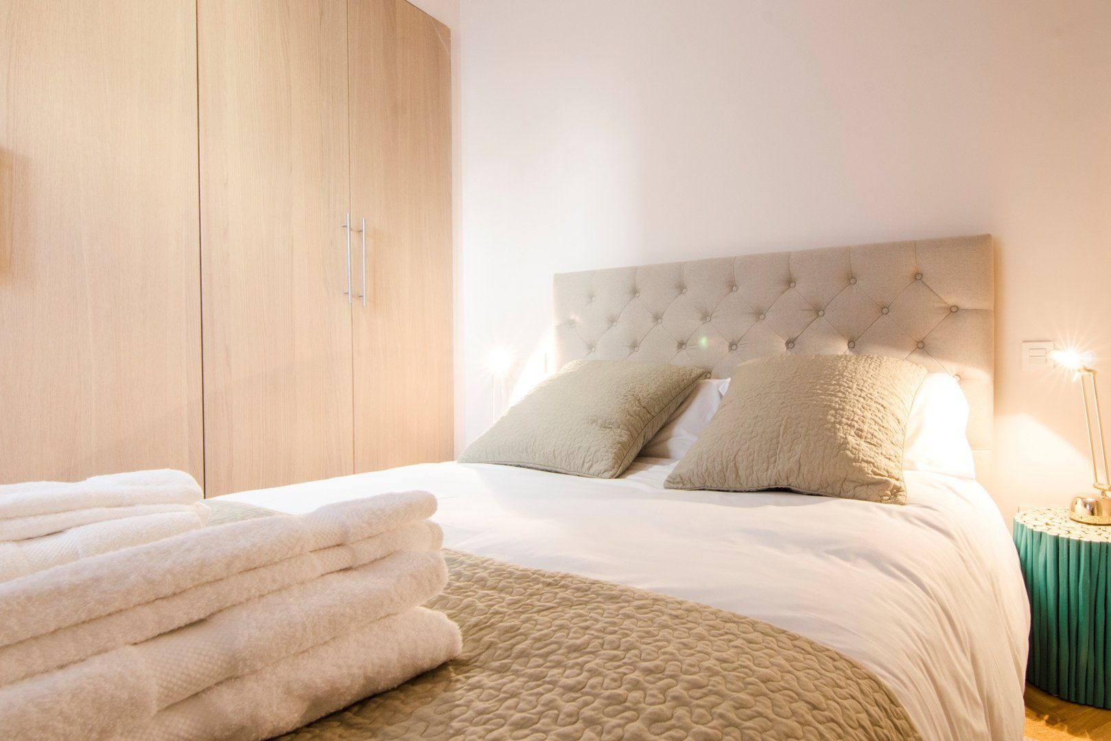 The living area is a haven of calm away from the hustle and bustle of the city. It's cloaked in soft pastel tones, and has plenty of comfortable seating where you can curl up with a glass of Rioja at the end of a long day. The kitchen is perfect for cooking up your favourite dishes, which you can serve at the chic dining space, complete with stylish pendant lighting and parquet flooring. And, there's even a breakfast bar where you can enjoy a quick bite to eat and a fresh coffee from the Newspresso machine before you get going in the morning.