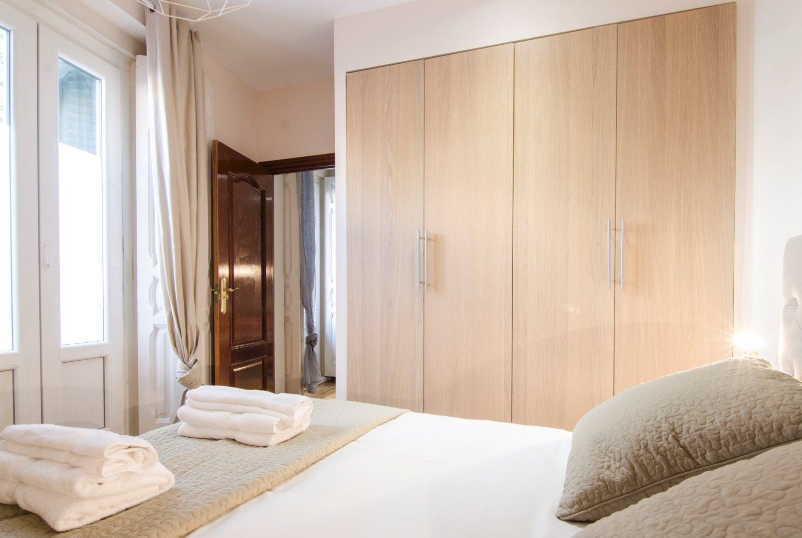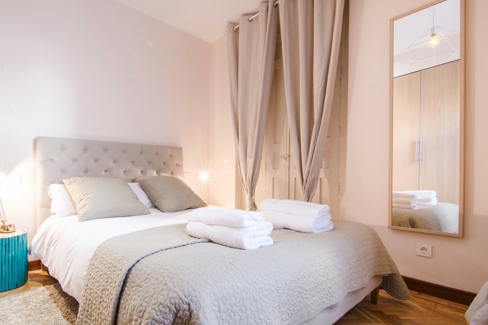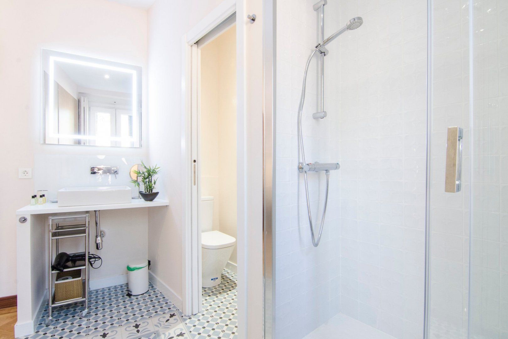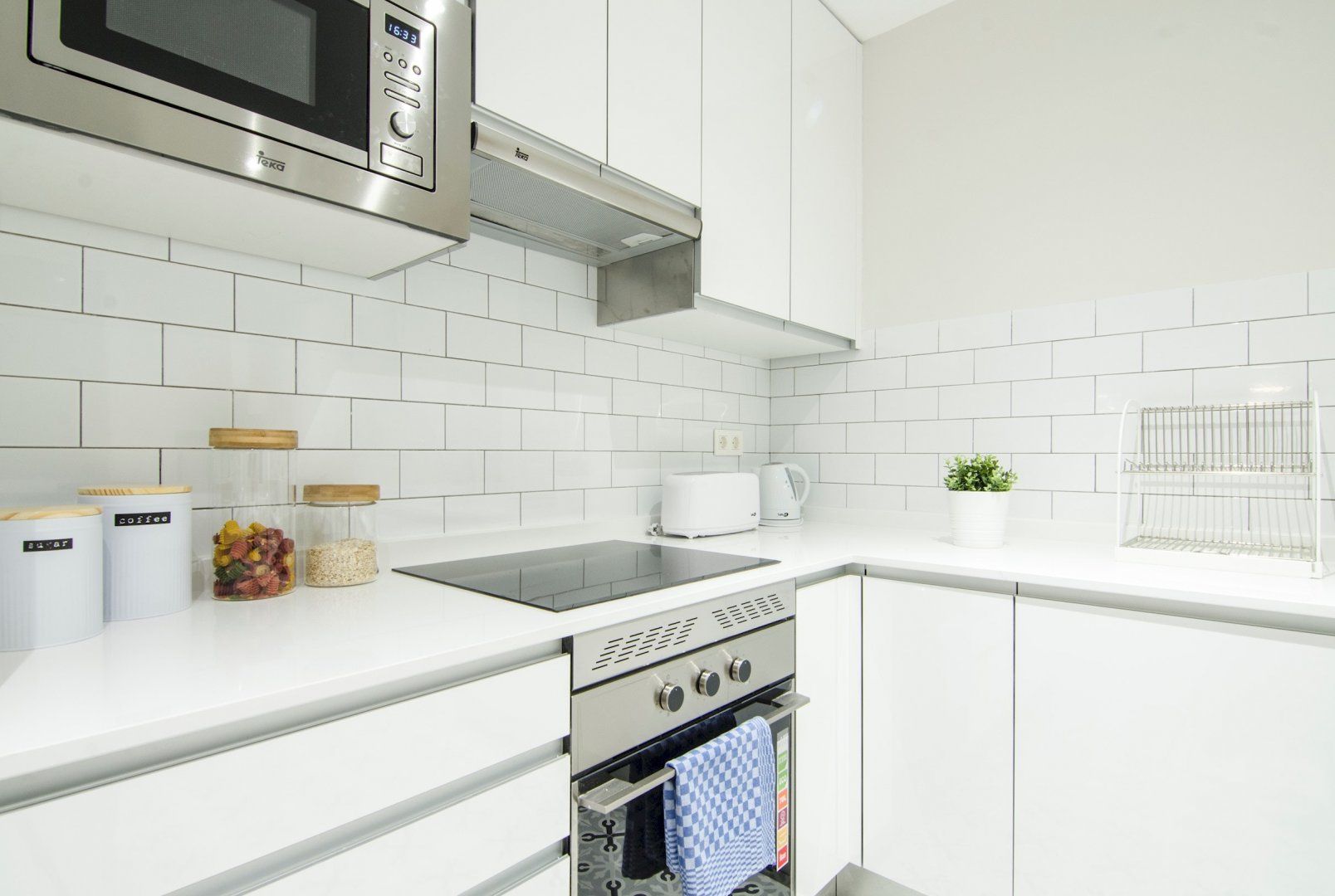 The living area is a haven of calm away from the hustle and bustle of the city. It's cloaked in soft pastel tones, and has plenty of comfortable seating where you can curl up with a glass of Rioja at the end of a long day. The kitchen is perfect for cooking up your favourite dishes, which you can serve at the chic dining space, complete with stylish pendant lighting and parquet flooring. And, there's even a breakfast bar where you can enjoy a quick bite to eat and a fresh coffee from the Newspresso machine before you get going in the morning.