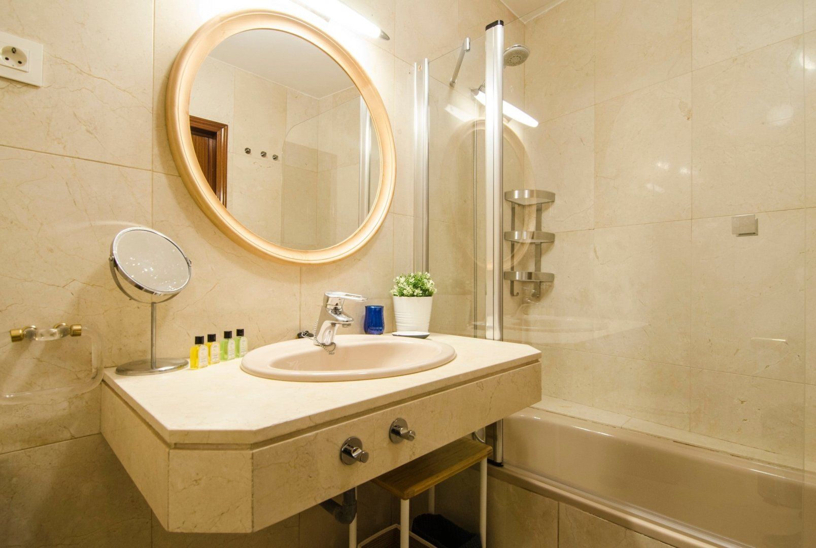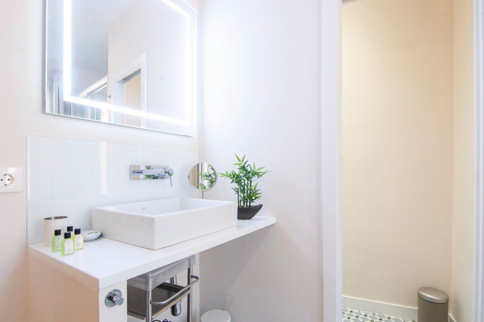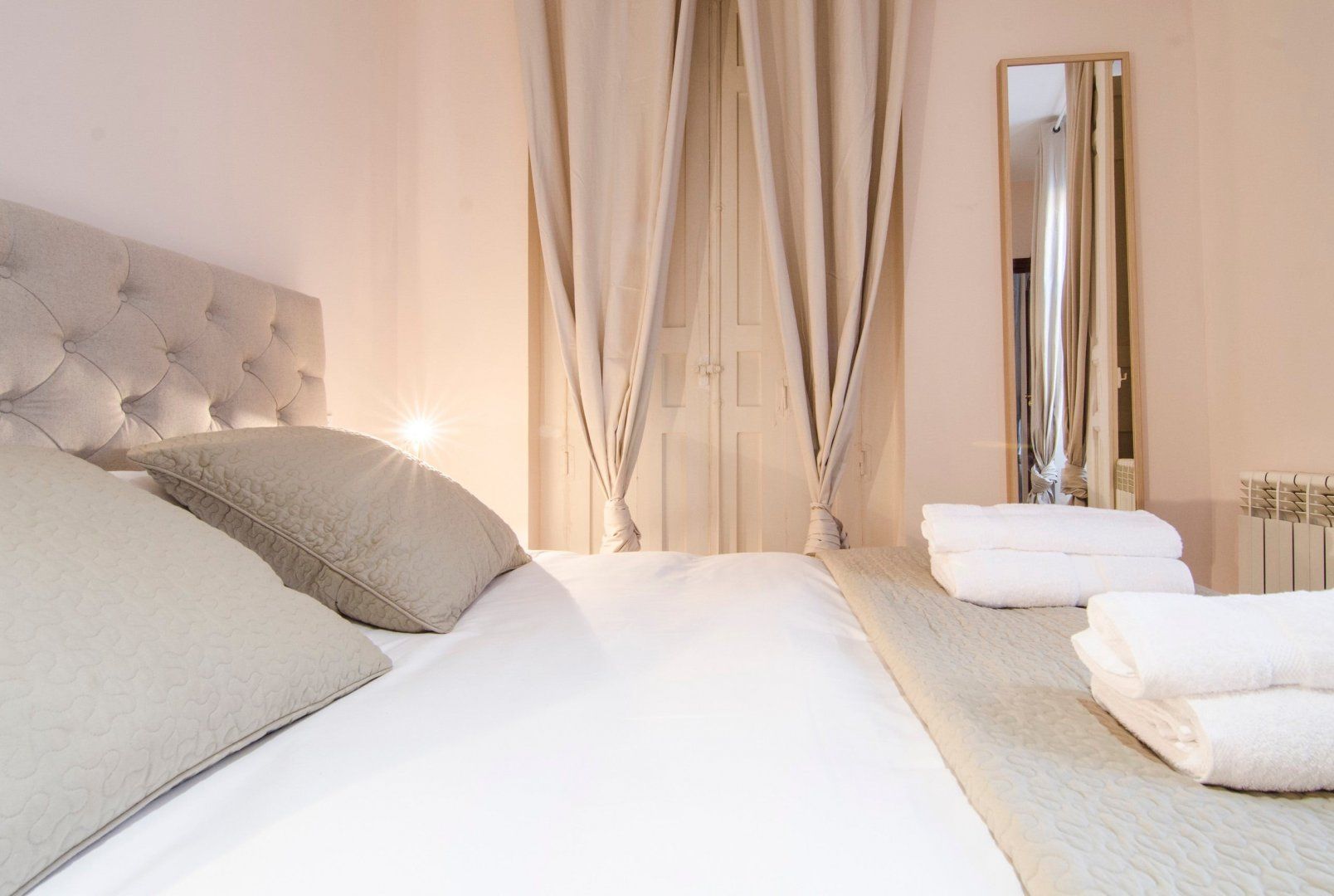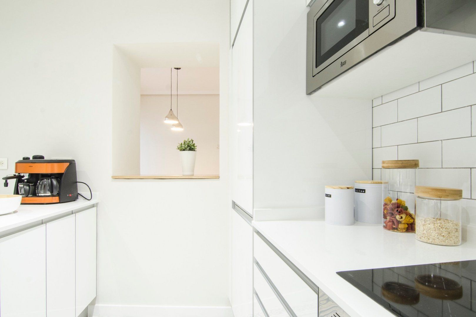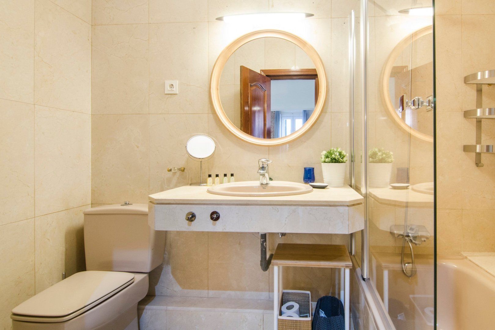 The living area is a haven of calm away from the hustle and bustle of the city. It's cloaked in soft pastel tones, and has plenty of comfortable seating where you can curl up with a glass of Rioja at the end of a long day. The kitchen is perfect for cooking up your favourite dishes, which you can serve at the chic dining space, complete with stylish pendant lighting and parquet flooring. And, there's even a breakfast bar where you can enjoy a quick bite to eat and a fresh coffee from the Newspresso machine before you get going in the morning.
