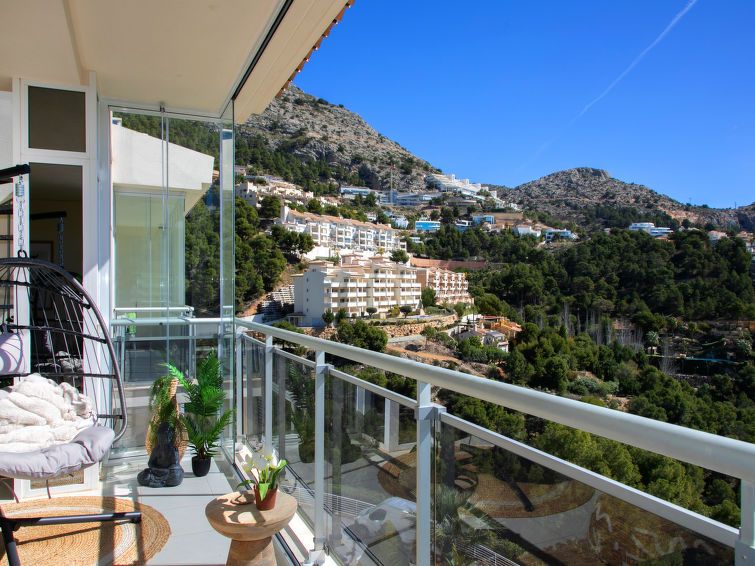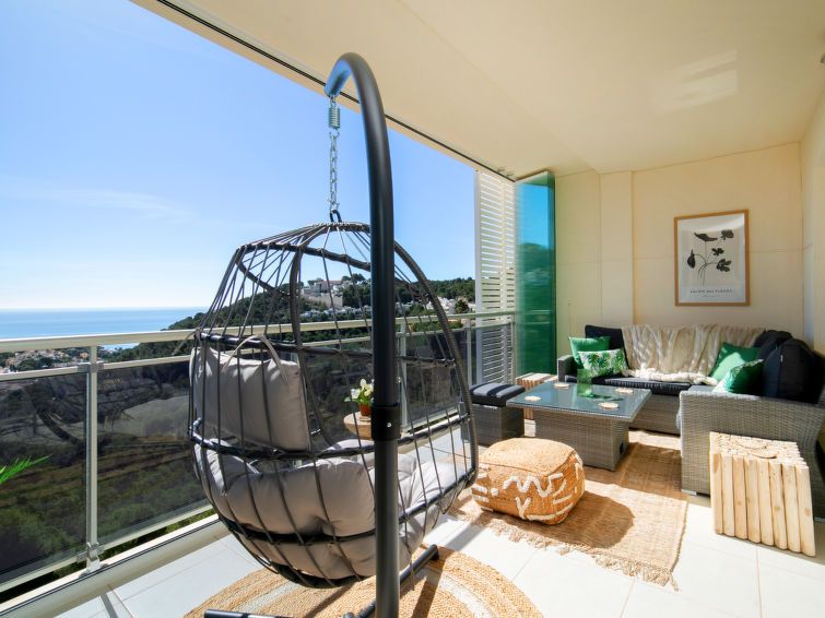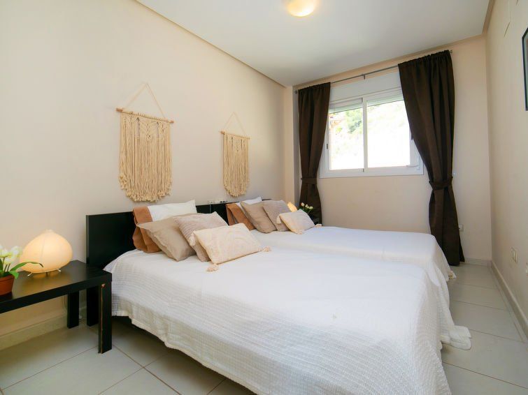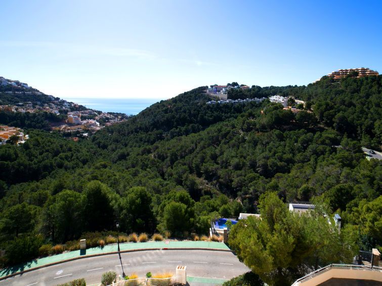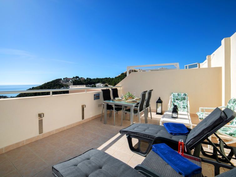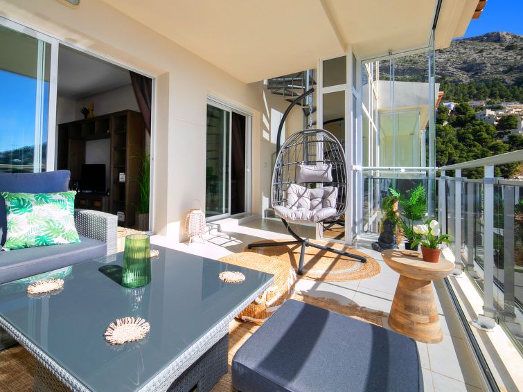 "Jardines de Altea Hills", 3-room apartment 150 m2 on 2 levels on 3rd floor. Spacious: living/dining room with digital TV, air conditioning and forced-air heating. Exit to the terrace. 1 room with 1 french bed (1 x 160 cm, length 200 cm), bath/bidet/WC, TV, air conditioning and forced-air heating.