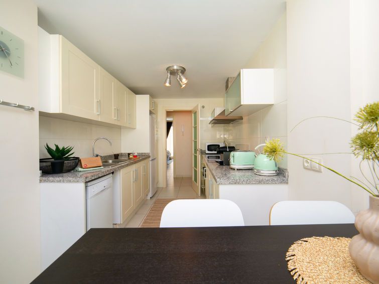 Nice apartment in itself, but very worn and unkempt. Photos probably taken after renovation. Sofa covered with dirty blanket, stained + dirty underneath. Walls have dirty streaks, edge banding on table missing or loose. Balcony glazed, windows uncleaned. Dishwasher smaller than normal, kitchen OK, minimal equipment. Beds good, bed linen clean. Bathrooms OK, joints throughout the apartment dirty. Garbage disposal not possible in the complex, you have to drive to the nearest container.