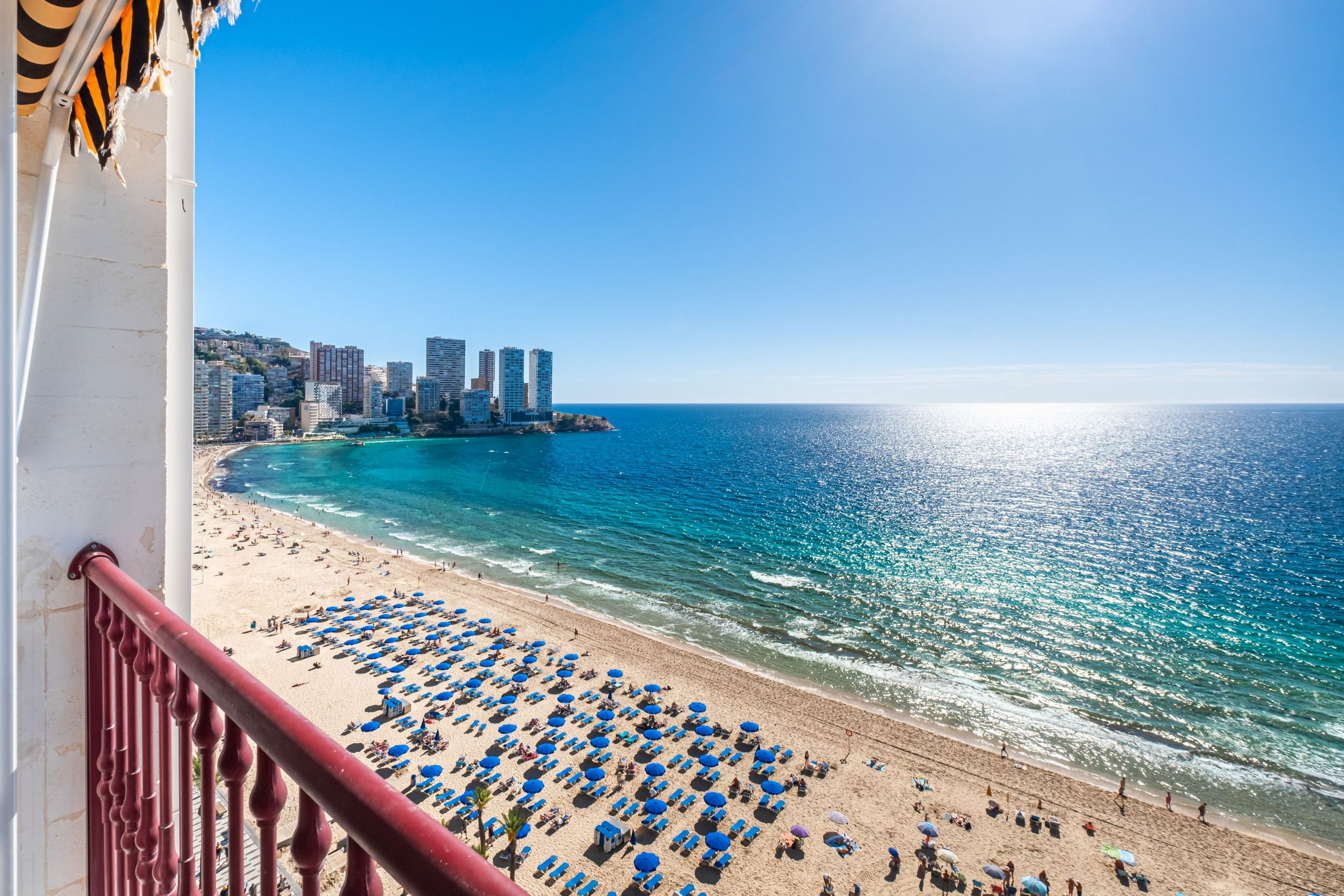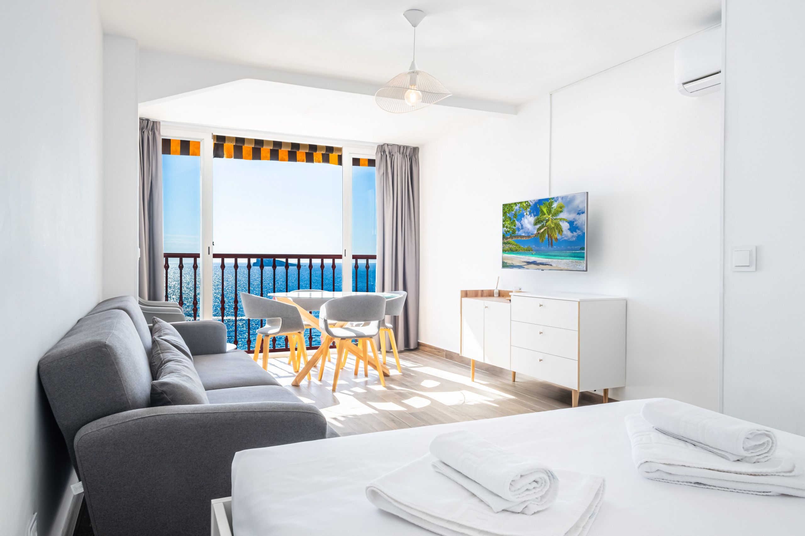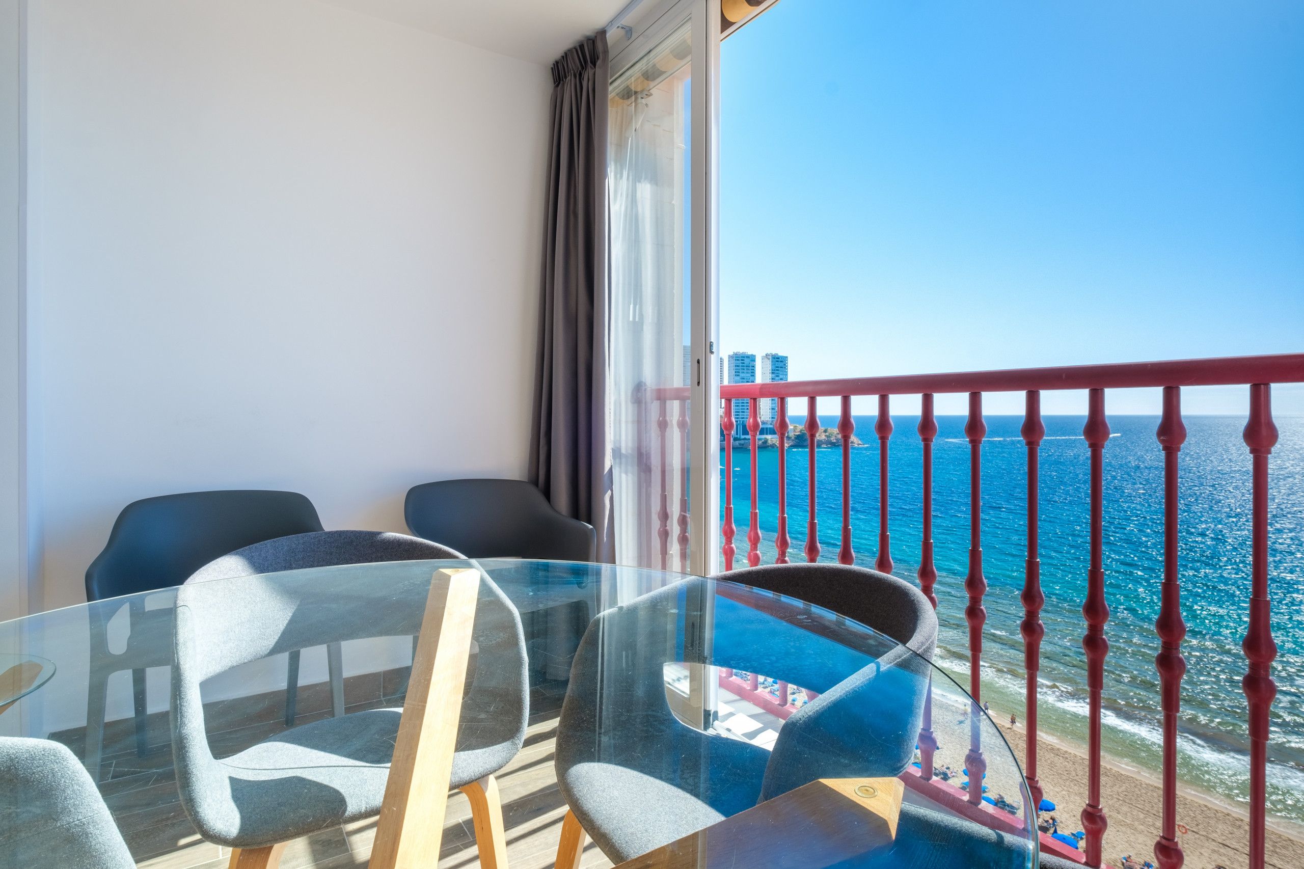 This apartment is all about location. It’s situated right on the beachfront of Levante in Benidorm. You can walk to the beach in just two minutes, and if you prefer the poolside to the sand, there’s a communal pool to cool off in too. From the balcony, you can admire sweeping views of the sea, bay and city – the water glitters in the sunshine. The apartment is compact but comfortable – it’s an ideal base for a couple wanting to be beside the sea.