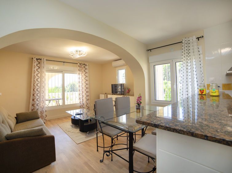 "Alexia", 5-room house 136 m2 on 2 levels. Comfortable and beautiful furnishings: living/dining room with 1 sofabed (160 cm, length 200 cm), satellite TV, digital TV, air conditioning and forced-air heating. Exit to the terrace, to the swimming pool. 1 room with 1 french bed (1 x 180 cm, length 200 cm), air conditioning and forced-air heating.