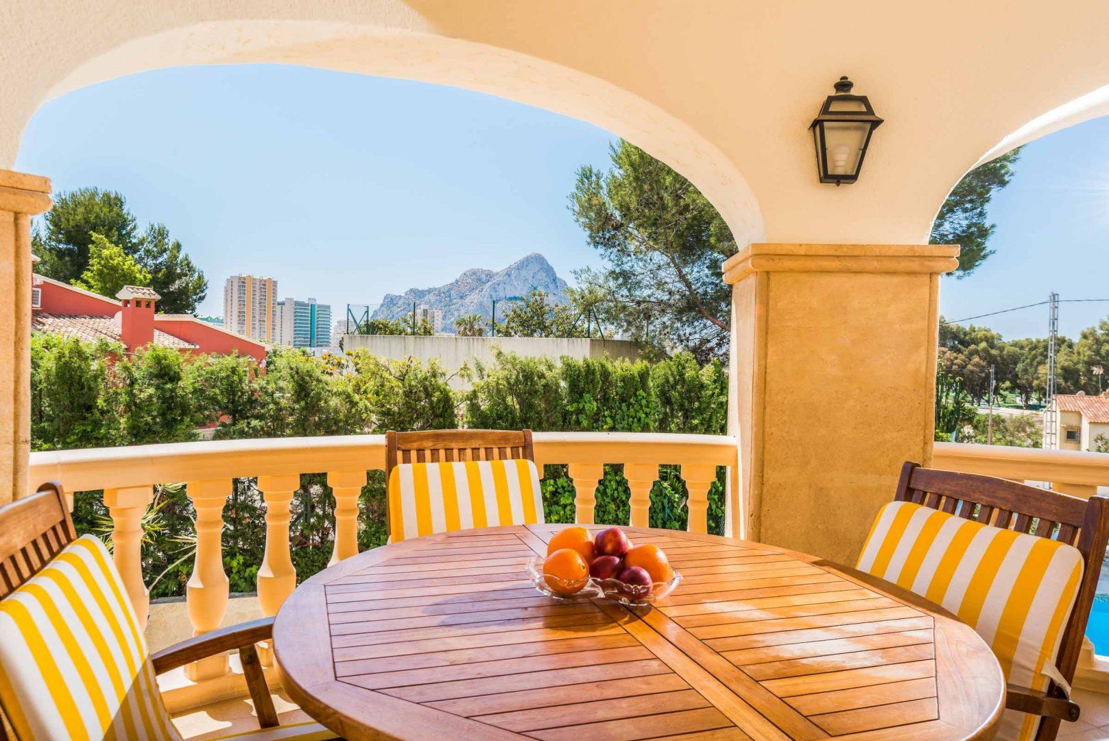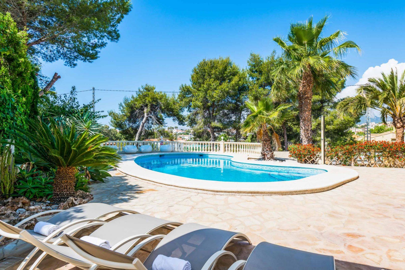 This detached villa lies in a residential area close to the sandy beaches of Calpe. While the decor is a little dated, this home is well-equipped for outdoor living. Vibrant vegetation and palms surround the private pool, and you'll find space to lounge, tan and dine under the sun. This home is entirely on the first floor and accessed via stairs, so guests with limited mobility will want to look elsewhere. But the balcony offers gorgeous elevated views, and the fireplace inside is perfect for cosy evenings.
