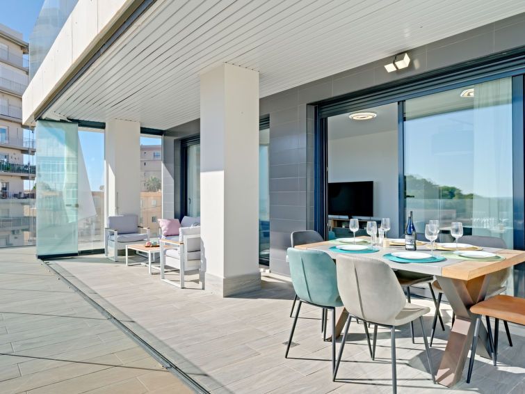 "Calpe Beach II", 3-room apartment 149 m2 on 6th floor. Spacious and bright, beautiful and modern furnishings: open large living/dining room with panoramic window with digital TV, air conditioning and forced-air heating. Exit to the terrace. 1 room with 1 french bed (1 x 150 cm, length 200 cm), shower/WC, air conditioning and forced-air heating.
