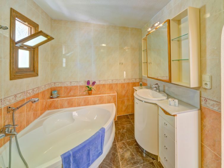 "Flora Mar", 5-room villa 311 m2 on 2 levels. Spacious, comfortable and beautiful furnishings: open large living/dining room with digital TV. Exit to the terrace. 1 room with 2 beds (90 cm, length 190 cm), hand-basin, shower, air conditioning and forced-air heating. Kitchen (oven, 4 gas rings, toaster, kettle, microwave).