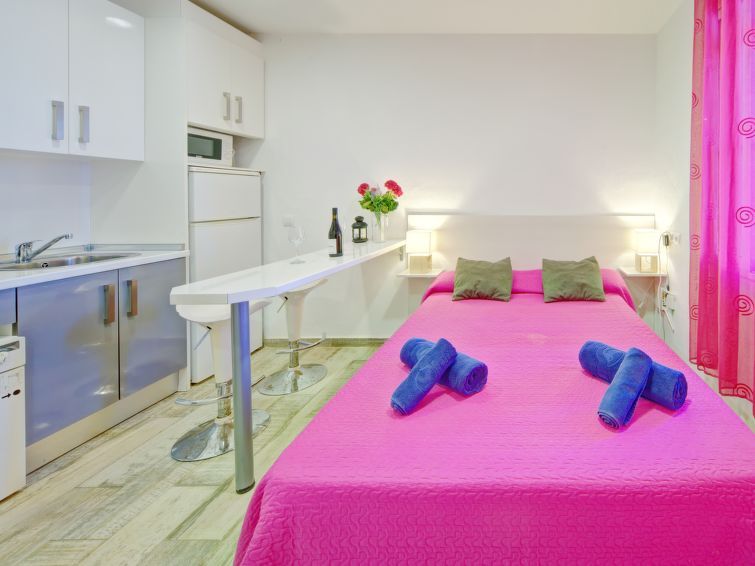 "Muralla Roja", 1-room studio 16 m2 on 1st floor. Object suitable for 2 adults. Practical and cosy furnishings: living room with 1 french bed (135 cm, length 190 cm), digital TV, air conditioning and forced-air heating. Open kitchen (oven, dishwasher, 3 ceramic glass hob hotplates, toaster, kettle, microwave, electric coffee machine).