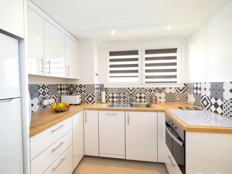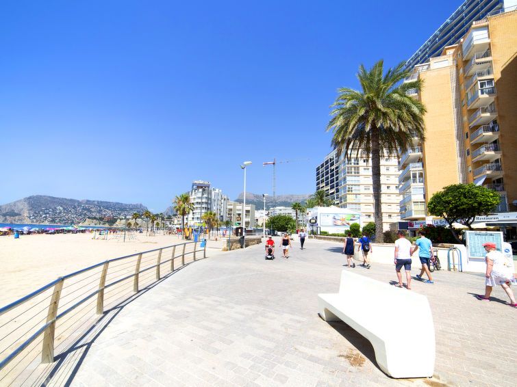 "Penon de Ifach", 2-room apartment 62 m2 on 8th floor. Spacious and bright, comfortable and beautiful furnishings: living/dining room with 1 sofabed, satellite TV and fan. 1 room with Dressing room with 2 beds (90 cm, length 200 cm), fan. Open kitchen (oven, dishwasher, 3 ceramic glass hob hotplates, microwave, freezer, electric coffee machine).