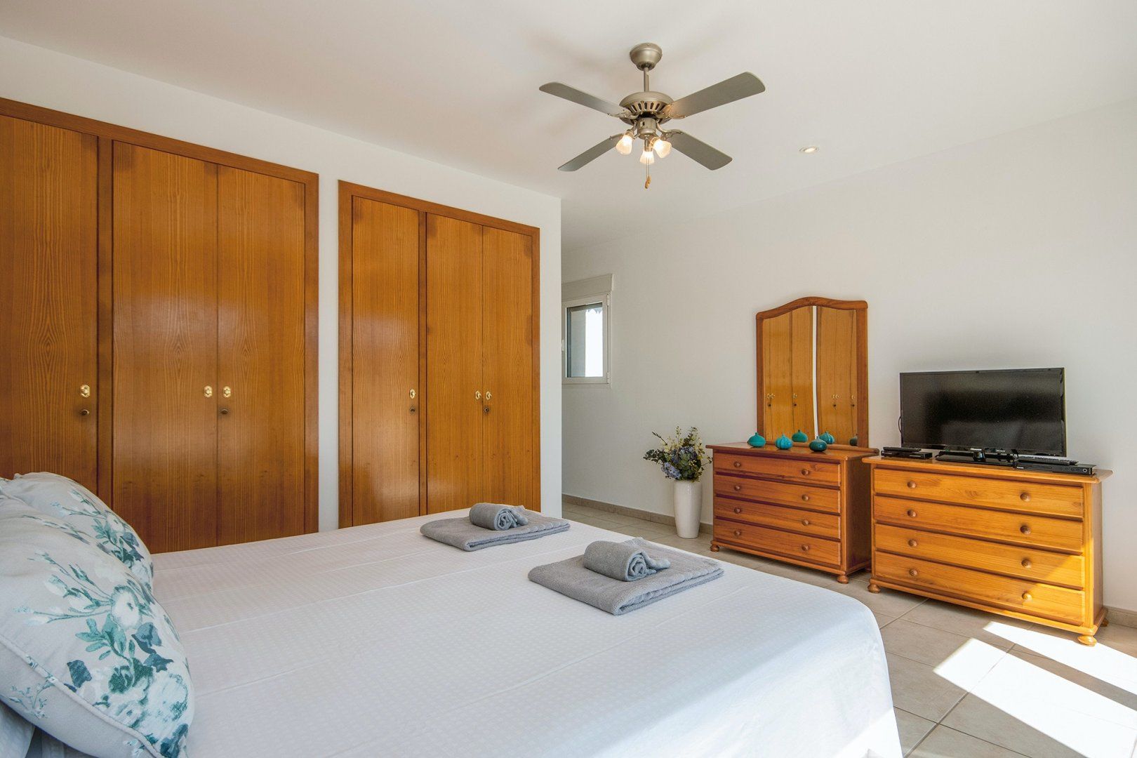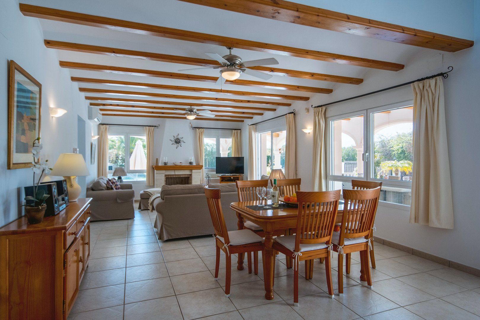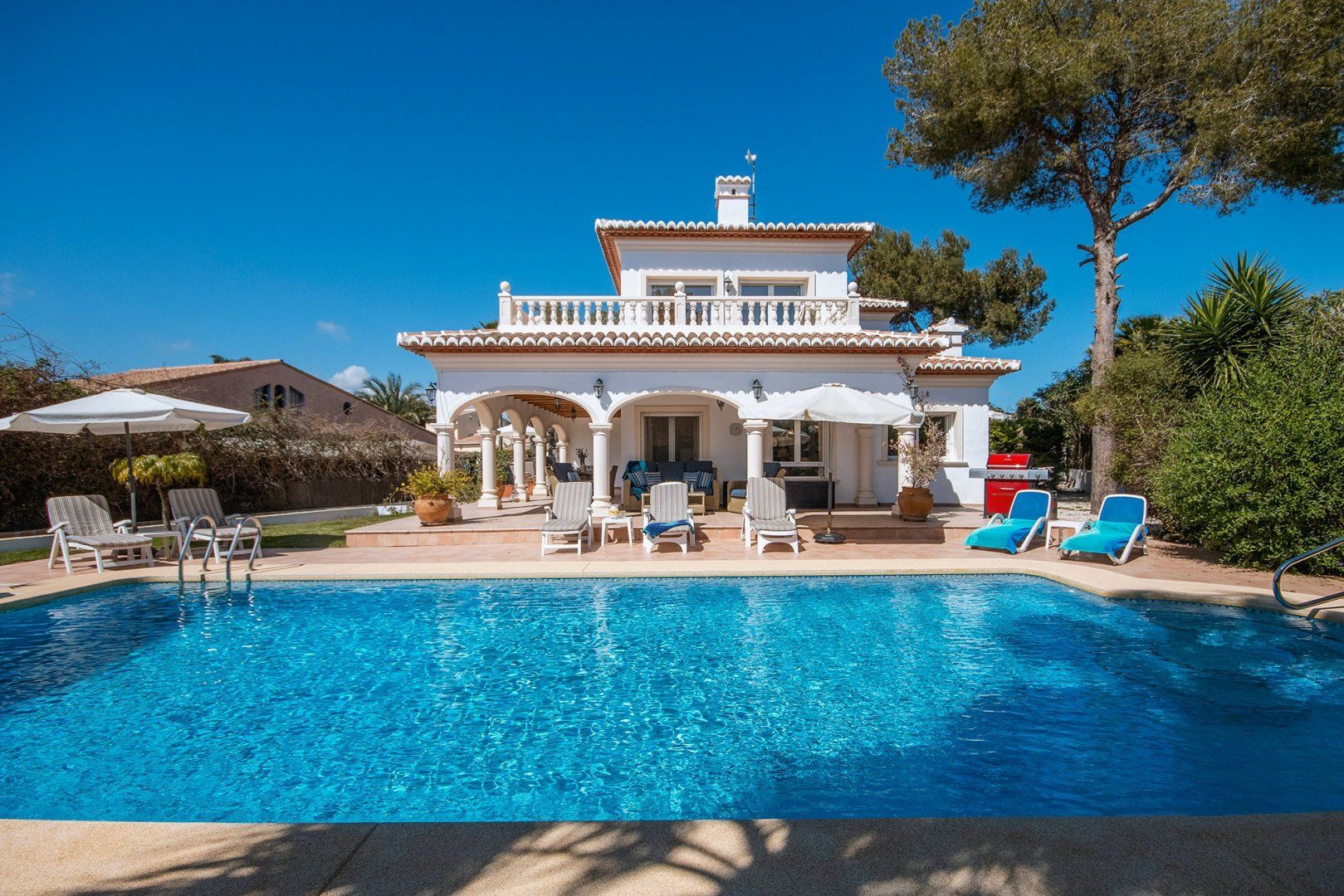 As soon as you arrive at this dreamy Costa Blanca home, you’ll start to relax. The private swimming pool glitters invitingly in the Spanish sun, surrounded by sun loungers, flowers and trees. The outside space here is glorious, with a covered terrace providing welcome shade, and a dining table for alfresco feasts.