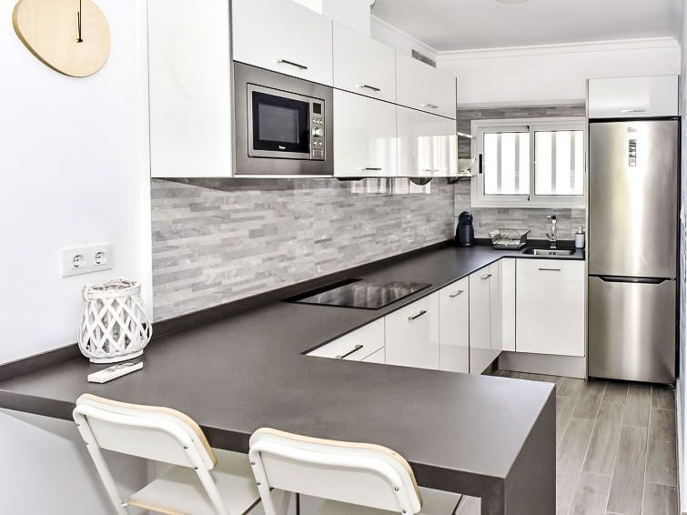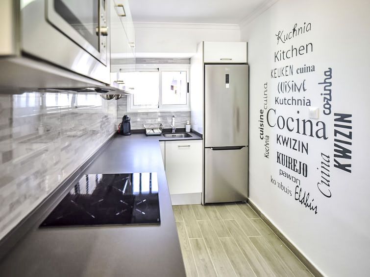 Contemporary modernized apartment, open fitted kitchen, with dishwasher, washing machine, microwave, window facing the sea, narrow balcony facing the street. Extra satellite antenna for German television In the kitchen, which is otherwise equipped with everything necessary, the coffee machine and a kettle are missing. For the key you have to go about 12 km to the Interhome office in Denia. The apartment is advertised with a panoramic sea view! This is wrong. Only view on the land side up to the mountains.