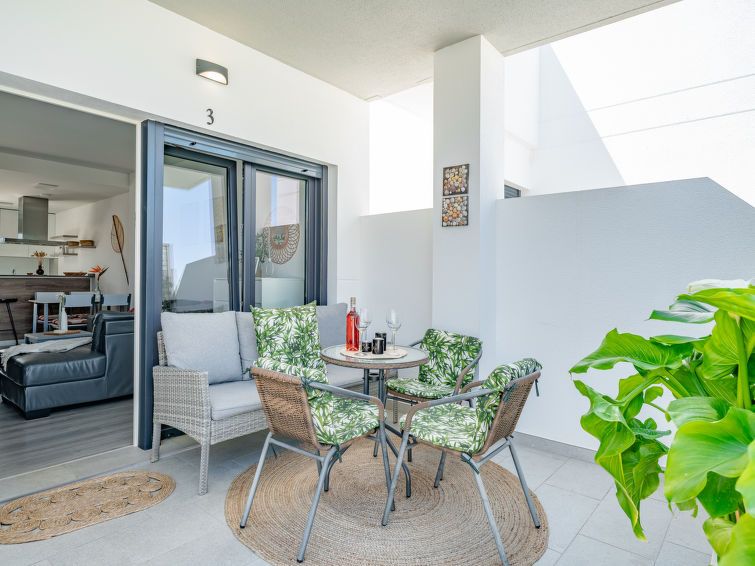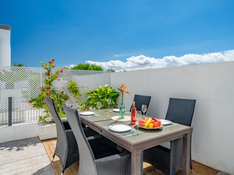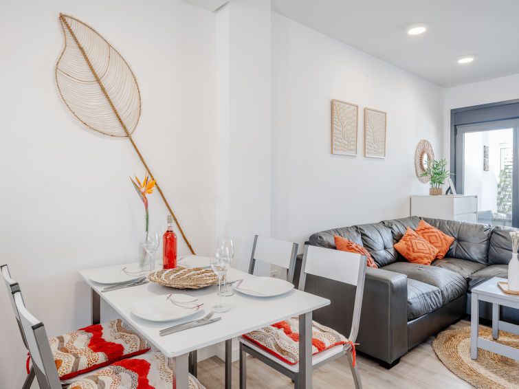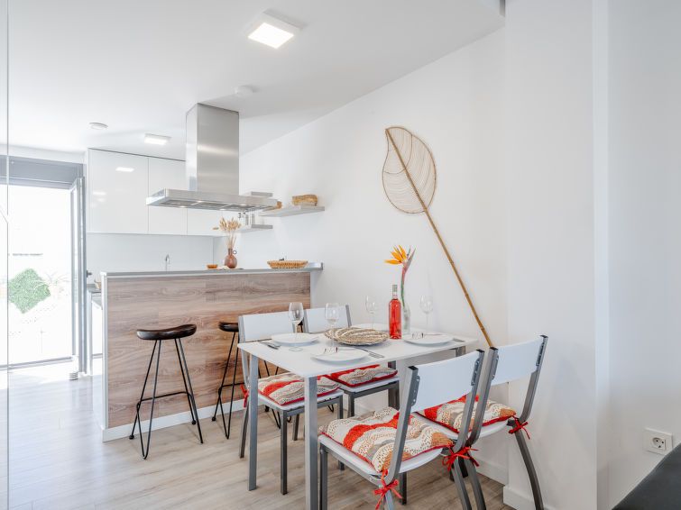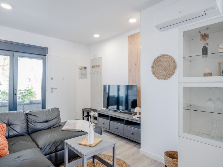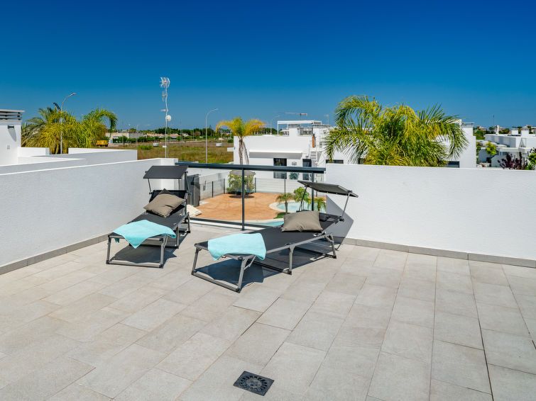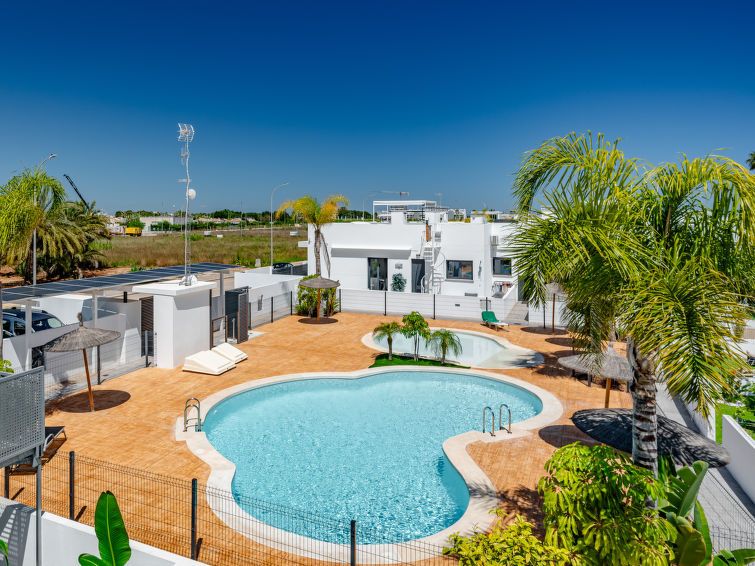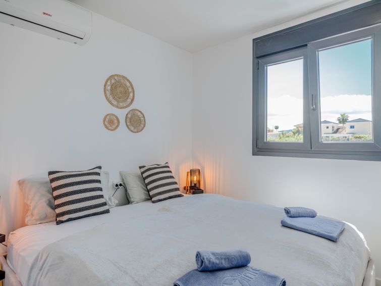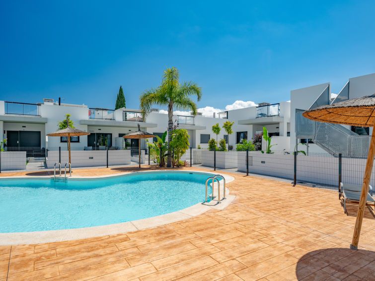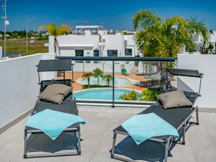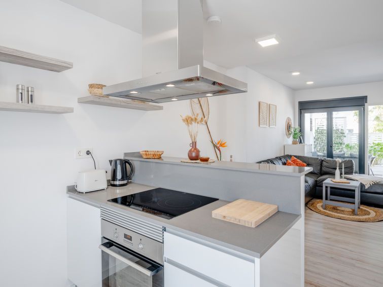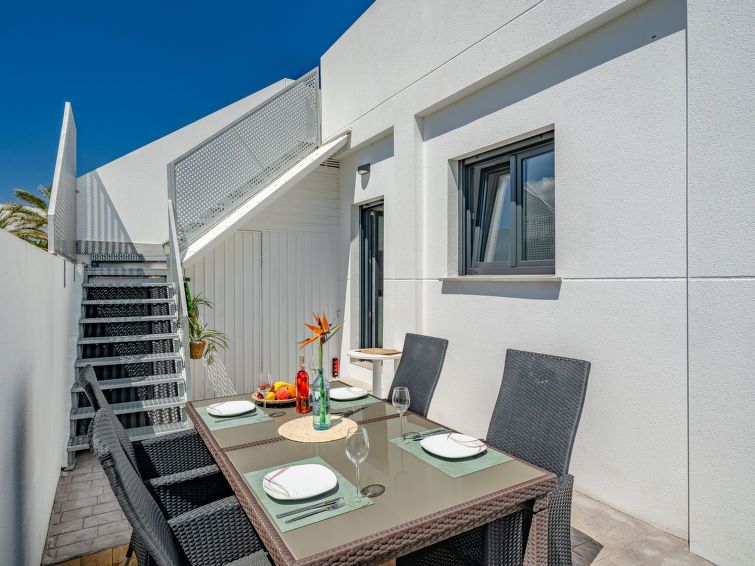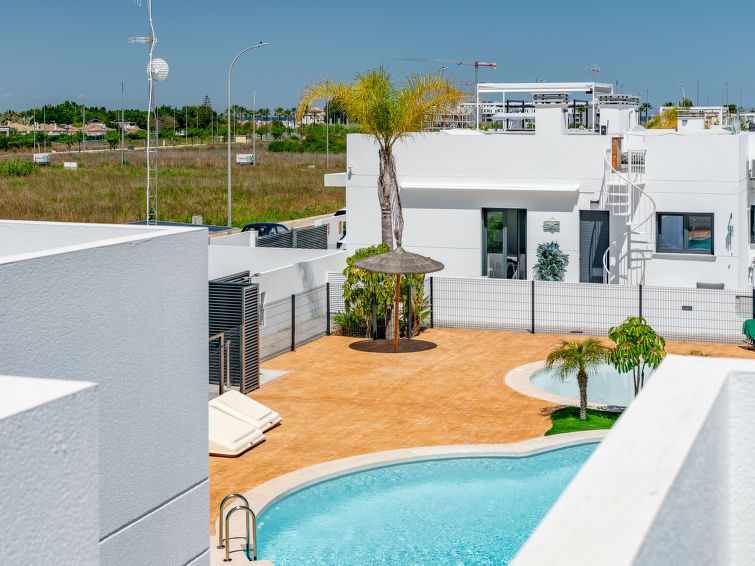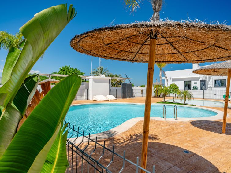 "Vergel Beach", 3-room semi-detached house 80 m2. Spacious and bright, very beautiful and stylish furnishings: living/dining room with satellite TV, air conditioning and forced-air heating. Exit to the terrace, to the swimming pool. 1 room with 1 french bed (150 cm, length 200 cm), shower/WC, air conditioning and forced-air heating.