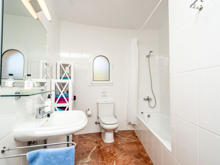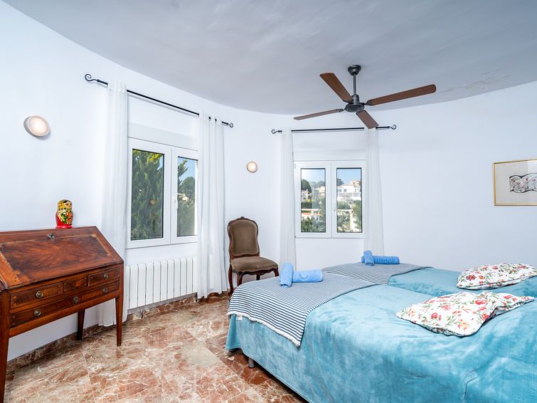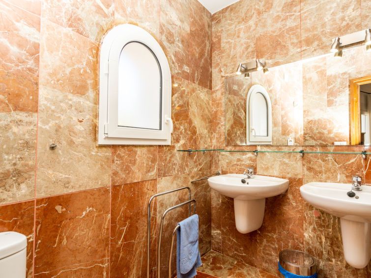 5-room villa 180 m2. Spacious and bright, comfortable and cosy furnishings: living/dining room with satellite TV and air conditioning. Exit to the terrace. 1 room with 1 french bed (180 cm, length 200 cm), shower/WC, double hand-basin and air conditioning. 2 rooms, each room with 2 beds, air conditioning and fan.
