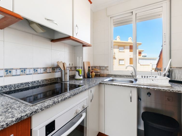Dark apartment with no sunlight. Terrace with tube view. Too far from the beach and difficult to reach (+dangerous) for kids and the elderly