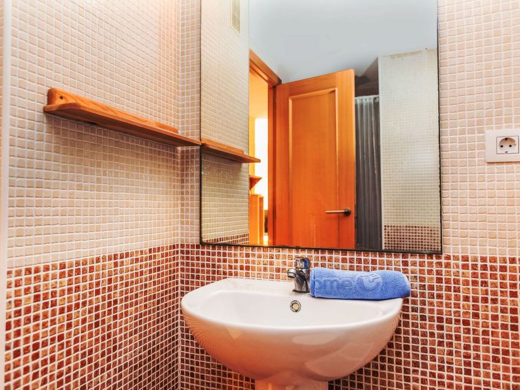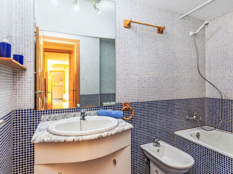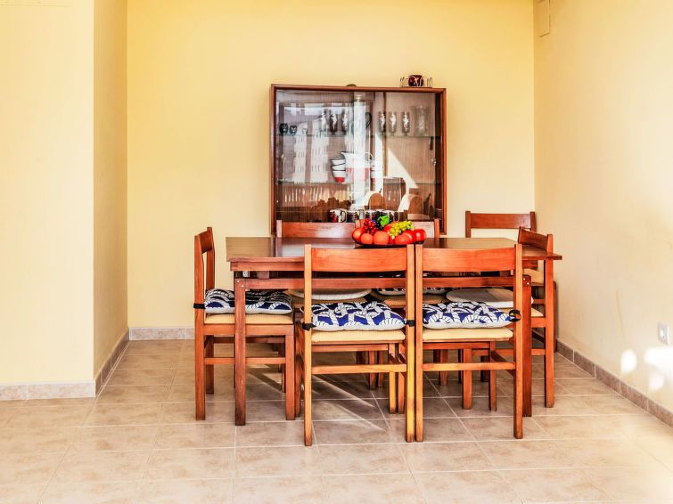 "Las Terrazas: La Marina", 3-room apartment 80 m2, south facing position. Practical furnishings: living/dining room with 1 double sofabed (140 cm, length 200 cm), dining table, digital TV, flat screen, air conditioning and fan. Exit to the terrace. 1 double bedroom with 1 french bed (160 cm, length 190 cm), bath/bidet/WC and fan.
